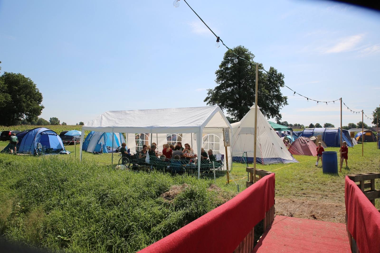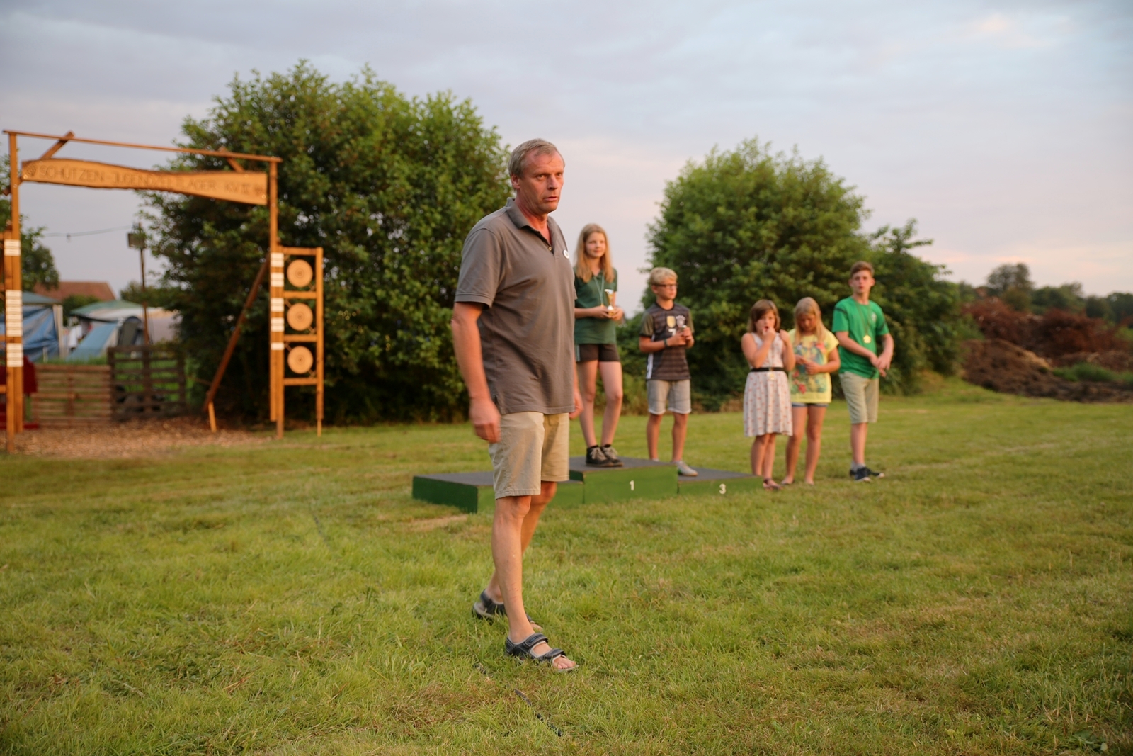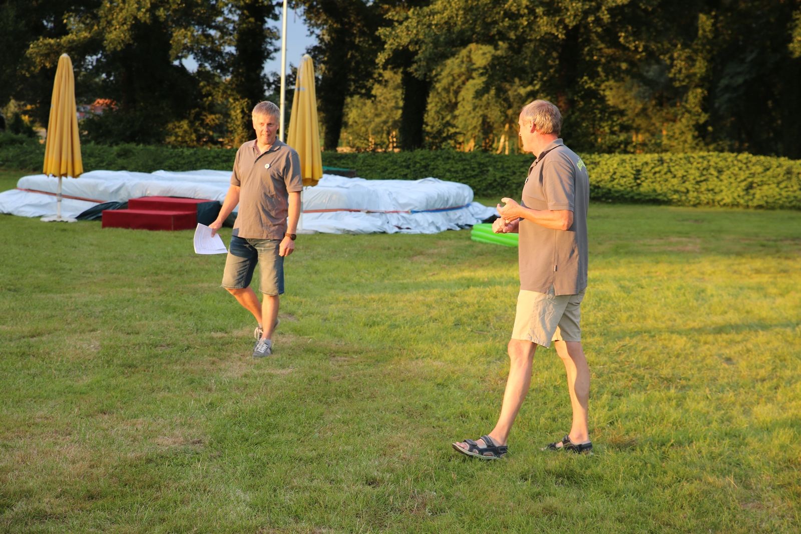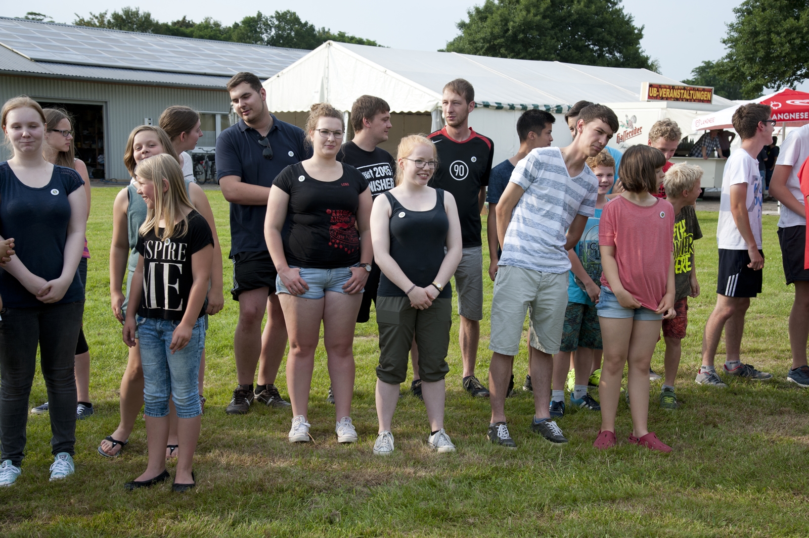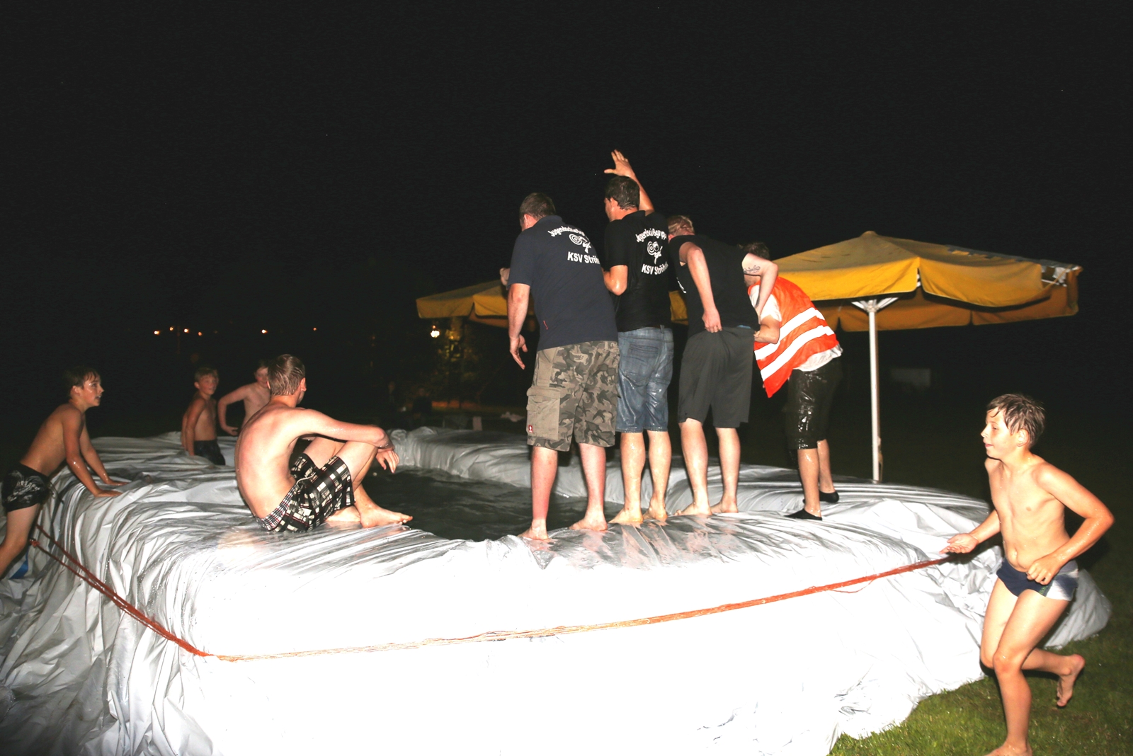 Der Freitagnachmittag stand im Zeichen der Anreise und des Zeltaufbaus beim Schießstand des KSV Ströhen, allerdings auf einem Nebenplatz, den ein Landwirt zur Verfügung gestellt hatte. So stand auf dem eigentlichen Schützenplatz genügend Raum zur Verfügung für ein großes Ess-Zelt, Umkleide- und Waschmöglichkeiten, verschiedene Spiel-Parcours sowie ein Pool-Becken, dass bei den teilweise tropischen Temperaturen zum Abkühlen einlud.