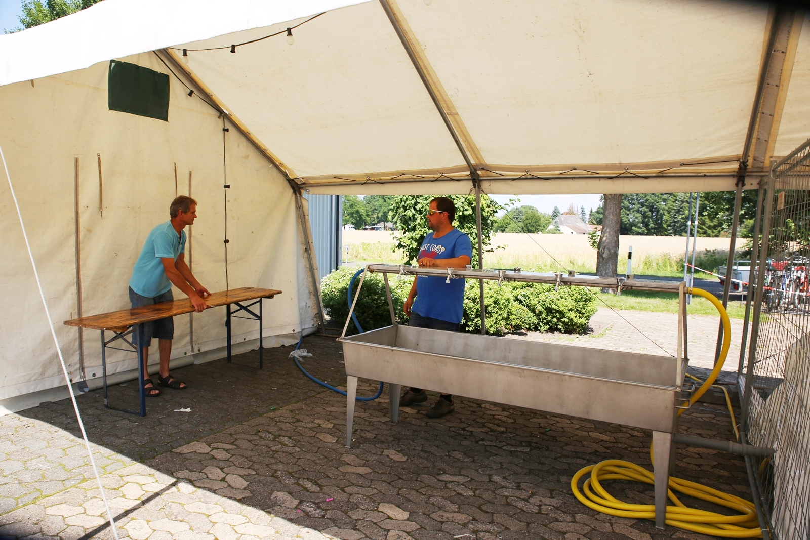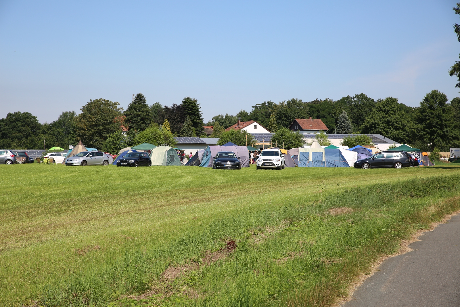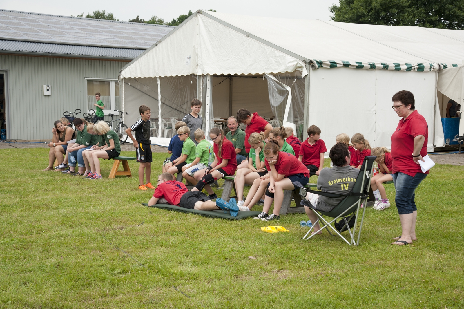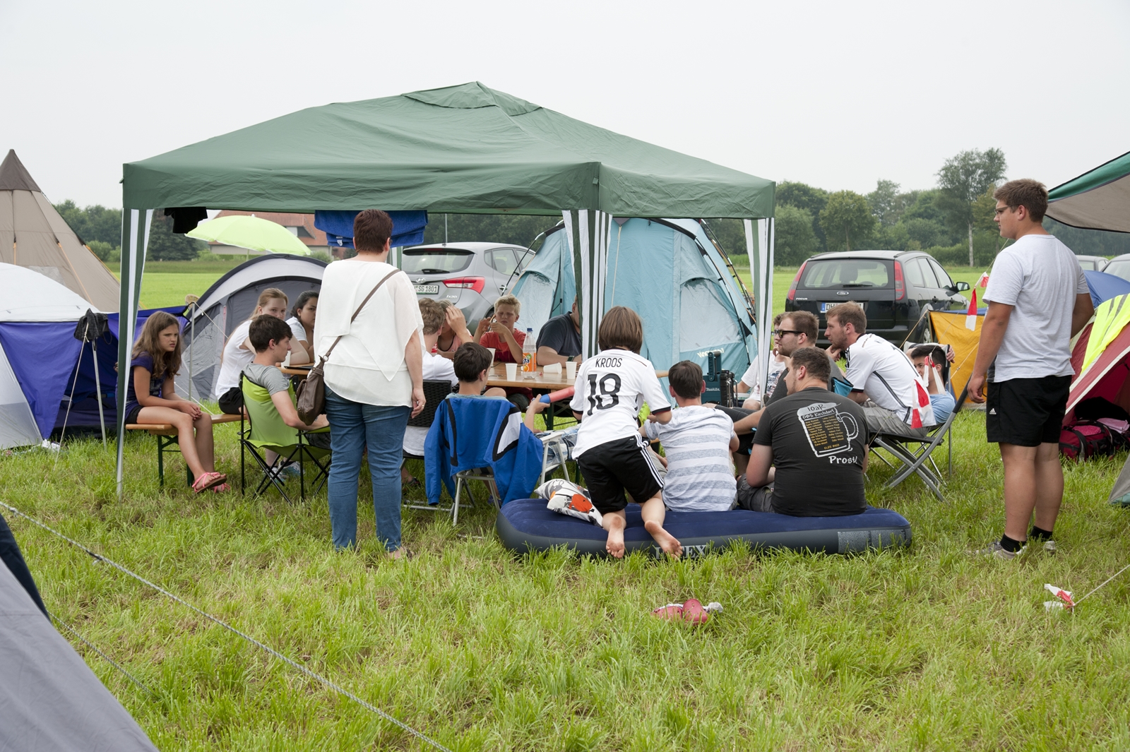 Der Freitagnachmittag stand im Zeichen der Anreise und des Zeltaufbaus beim Schießstand des KSV Ströhen, allerdings auf einem Nebenplatz, den ein Landwirt zur Verfügung gestellt hatte. So stand auf dem eigentlichen Schützenplatz genügend Raum zur Verfügung für ein großes Ess-Zelt, Umkleide- und Waschmöglichkeiten, verschiedene Spiel-Parcours sowie ein Pool-Becken, dass bei den teilweise tropischen Temperaturen zum Abkühlen einlud.