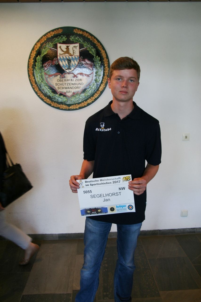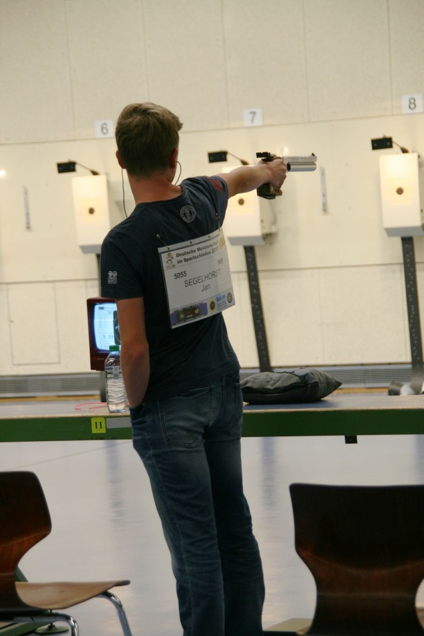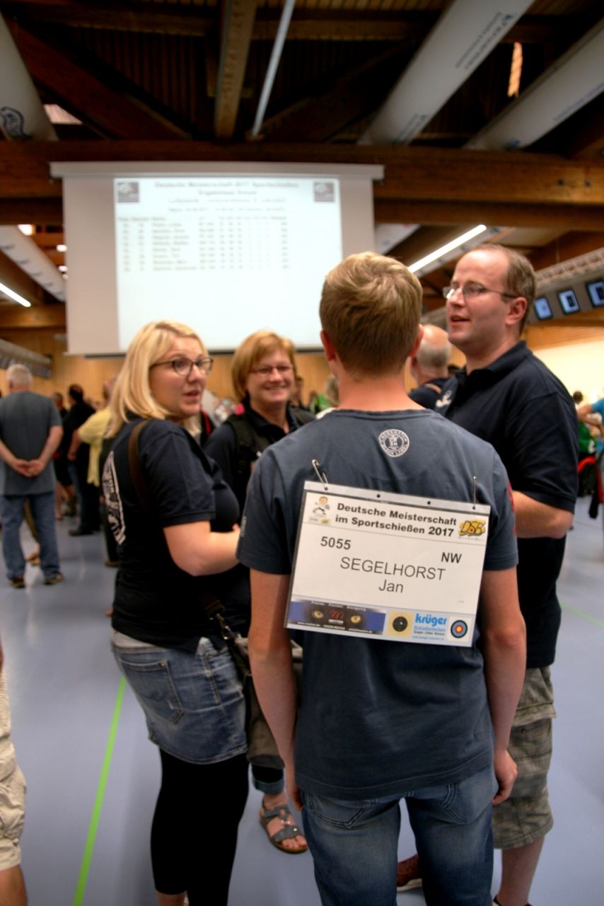 Nach der viertel Stunde Vorbereitungszeit mit Probeschüssen, begann für alle der DM-Wettkampf. Jan kam mit den Serien 90-82-90-91-88 und 81 auf insgesamt 522 Ringe. Wenn man „nur“ die ersten vier Serien zusammenzählt, hat er sein Ergebnis der Bezirksmeisterschaft von351 Ringen schon um zwei Ringe getoppt, auch super. Er reihte sich dann auf Rang 91 von 101 Teilnehmern ein. Die Rangfolge ist eigentlich in diesem Falle nicht entscheiden, sie passt schon, Jan gehört mit zu den besten Junioren B im DSB, so mancher blieb zu Haus, weil er das Limit von 346 Ringen nicht geschafft hat. Sicher wird er trotz Ausbildung noch etwas Zeit und Motivation finden, zu trainieren. Glückwunsch zu diesem DM-Ergebnis Jan!