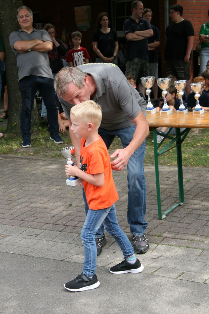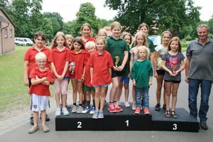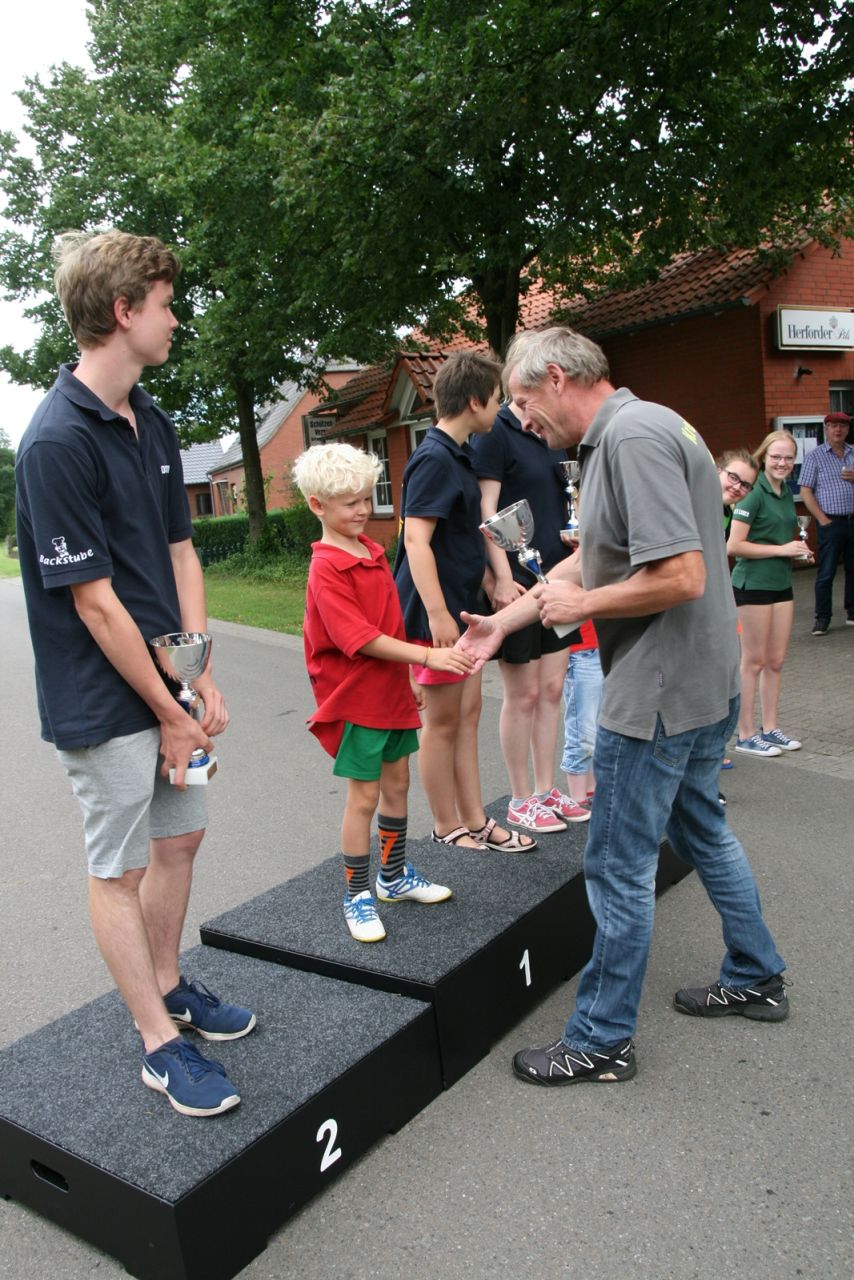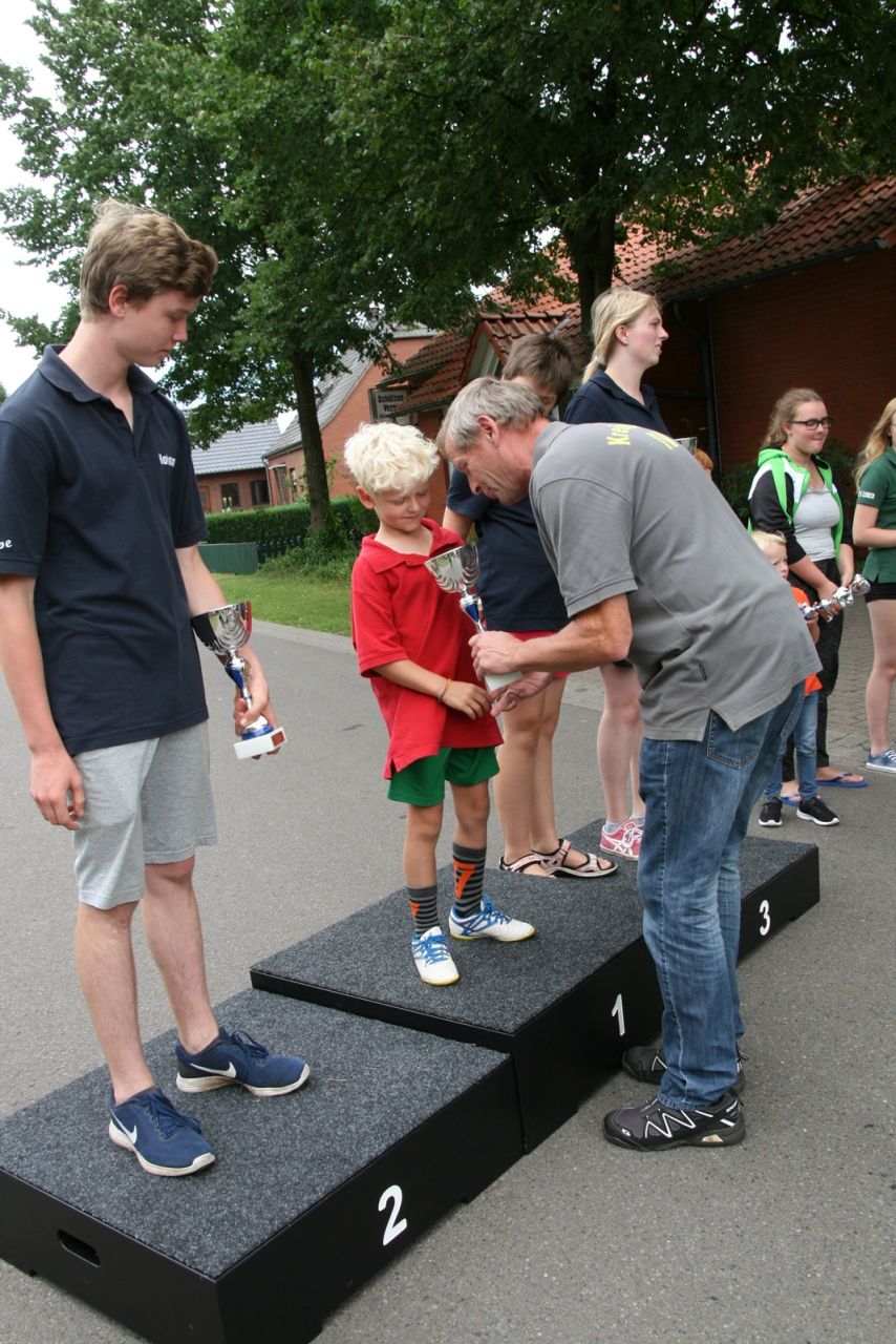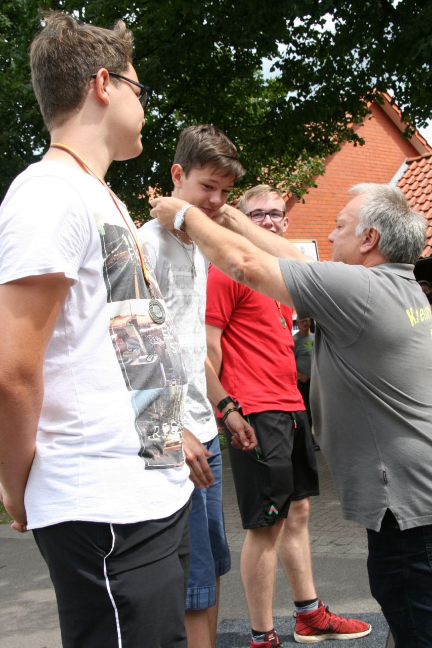Zuvor bedankte sich Gerd Griffel bei den Scharringhäusern für die tolle Ausrichtung des Zeltlagers, alles sei super gewesen, auch die Verantwortlichen und Betreuer hatten gut Lachen, es lief alles wie am "Schnürchen", der SV Scharringhausen hatte alles super organisiert, angefangen vom sicheren Zeltplatz bis zur "Verkehrsberuhigung" rund um das Gelände. Ingelore Eickhoff freute sich, dass alle so viel Spaß gehabt haben, sie habe ja an allen Tagen kurz vorbeigeschaut und war erstaunt, dass so viele Gäste am Samstag die „Kaffeetafel“ genutzt haben. Vereinspräsident Steve Schomburg war glücklich über so viel Resonanz Seitens der Mitgliedsvereine, man habe zwar viel Arbeit und Organisation für diese Veranstaltung einsetzen müssen, aber das positive Feedback der Kinder habe dieses wettgemacht. Gerd Harzmeier vom SV Kirchdorf lud alle zum Jugendzeltlager ein, es findet 2018 beim Schützenhaus in Kirchdorf statt.