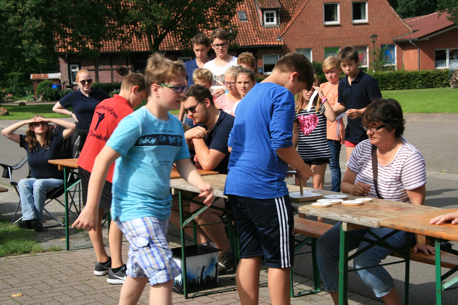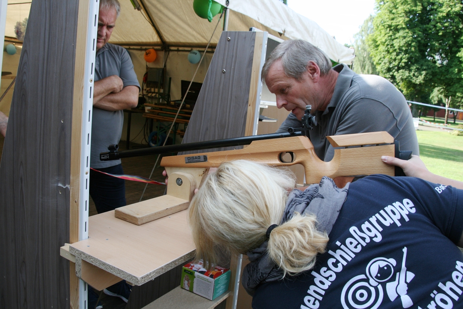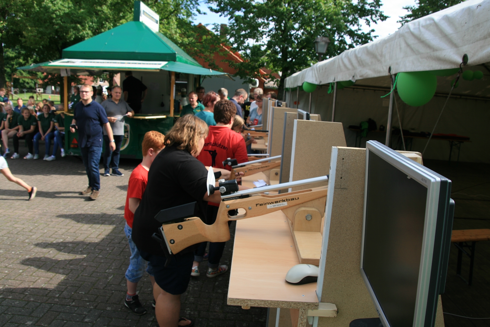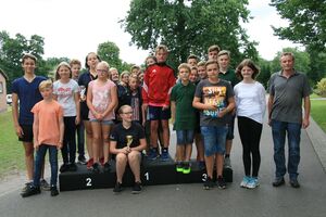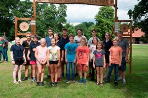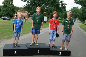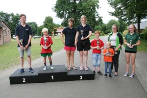 82 Kinder zwischen 11 und 18 Jahren haben am Sonntag beim abschließenden Biathlon mit dem Lichtpunktgewehr teilgenommen. Dabei waren Treffsicherheit und Schnelligkeit gefragt. Da es morgens ein Gewitter gegeben hatte, verzichtete man auf das Laufen im nassen Gras wegen der Rutschgefahr, so wurden knapp 10 Meter zurückgelegt, bis zur Aufgabe schnellst möglichst Scheiben in der richtigen Reihenfolge aufzustapeln, dann schnell zurück um die letzten fünf Schuß abzugeben. Dieses wurde von Zeitmessern natürlich korrekt gemessen. Alle Altersgruppen waren mit viel Motivation dabei, Jürgen Vogt hatte für diese Aufgabe das „Kommando“, er achtete darauf, dass auch nicht zu früh gestartet wurde.