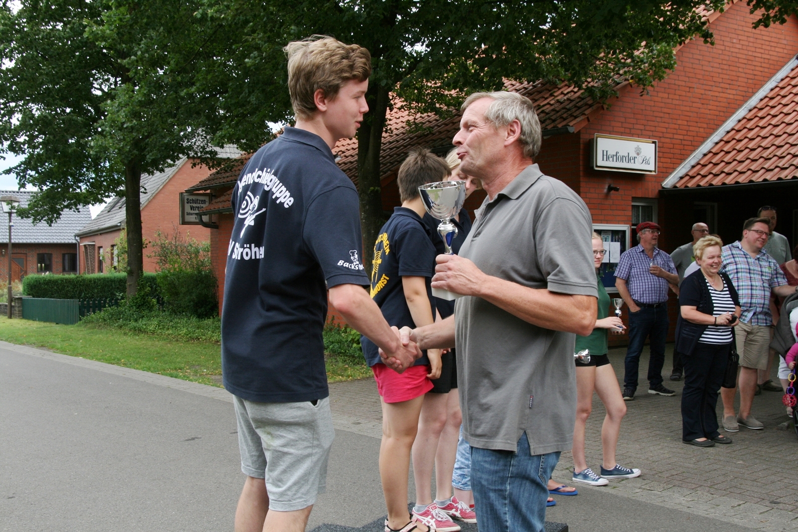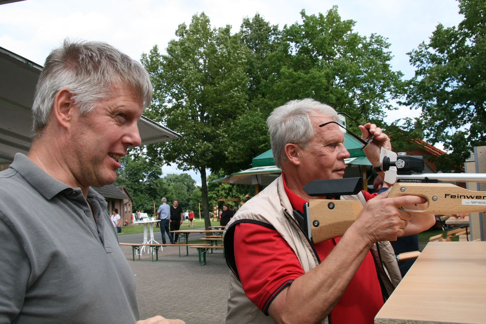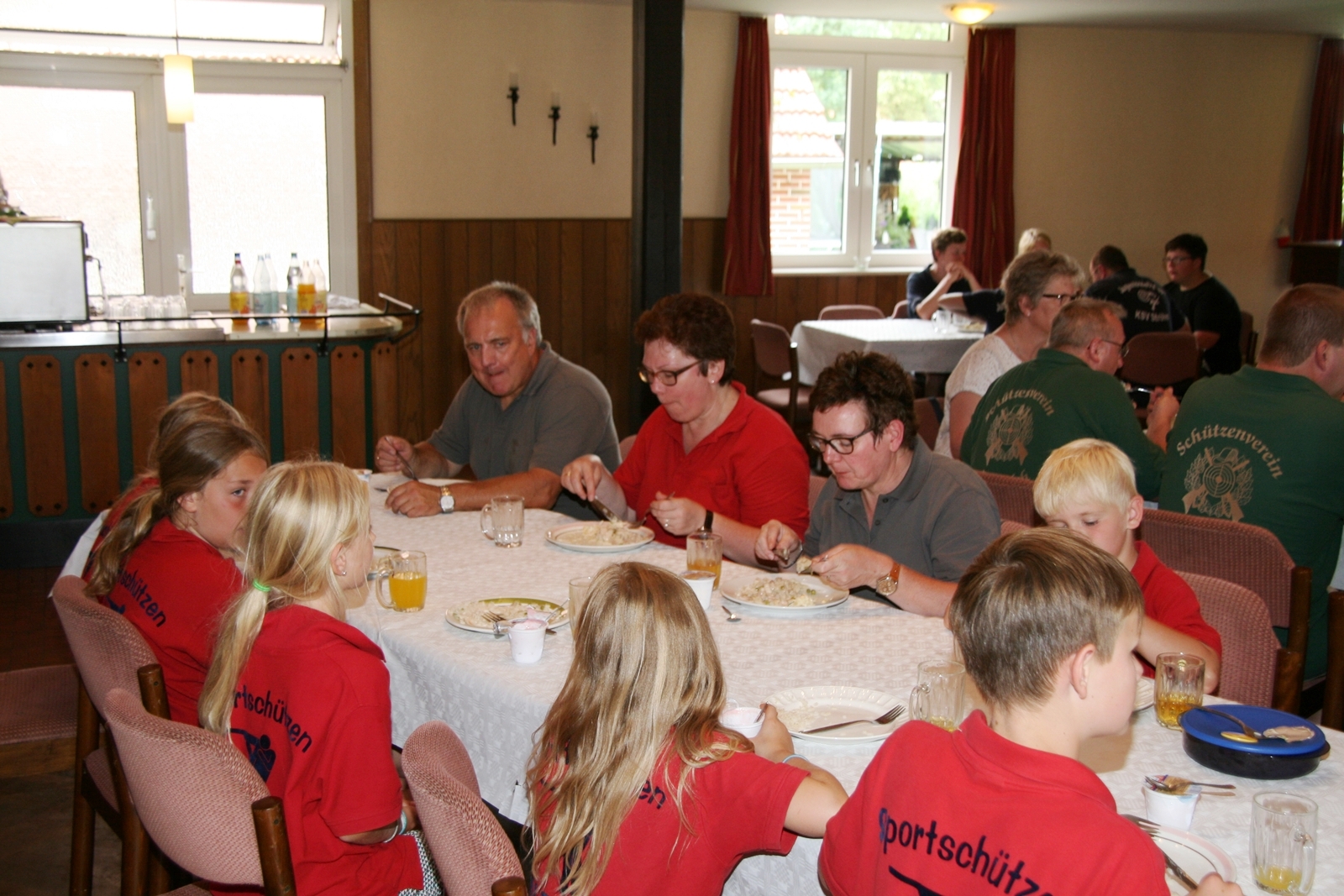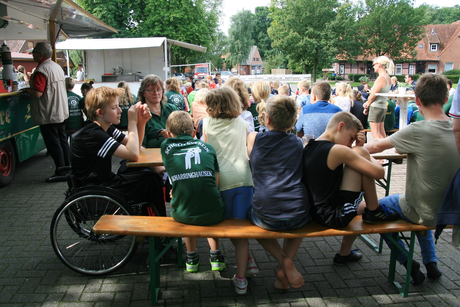 Und wie seit vielen Jahren, wurden auch am Sonntag um 11:00 Uhr wieder Ehrengäste herzlich zum Frühschoppen von KV IV-Präsident Gerd Griffel und Schatzmeisterin Edith Obenhaus begrüßt. Es waren Heinrich Kammacher als Samtgemeindebürgermeister der Gemeinde Kirchdorf und Holger Könemann als Ortsbürgermeister von Kirchdorf, Ingelore Eickhoff als Scharringhausens Bürgermeisterin. Die Präsidenten des Schützenvereins Scharringhausen Steve Schomburg mit Königin Tanja Köhler, vom SV Kirchdorf Gerd Harzmeier, vom SV Strange-Buchhorst Klaus Ahlers, vom SV Dörrieloh Uwe Mohrlüder und vom Bezirks-Schützenverband Jugendsportleiterin Britta Löhmann sowie Pressewartin Marianne Vallan. Es wurden gute Gespräche geführt, rund um das Schützenwesen mit seinen vielen Neuerungen dazu gab es einen Rundgang durch die kleine „Zeltstadt“. Die Siegerehrung fand nach dem Mittagessen statt.