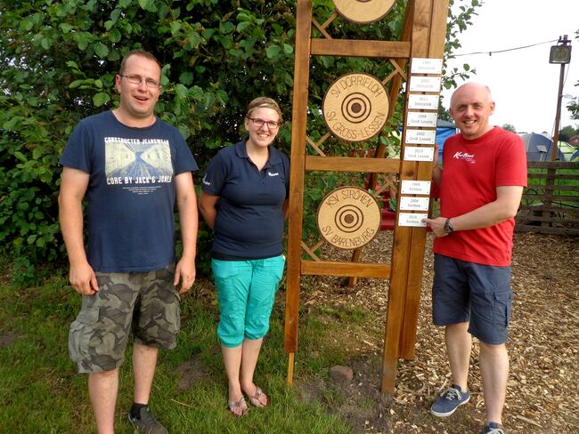 Schießsportleiter Carsten Supe und Jugendbetreuerin Miriam Tacke sowie Vereinspräsident Heiko Meyer freuten sich für den gastgebenden Verein über den gelungenen Auftakt, Heiko Meyer zeigt dabei stolz auf ihr "Veranstaltungsschild ". Der Schützenverein Scharringhausen wird im nächsten Jahr der gastgebende Verein sein...