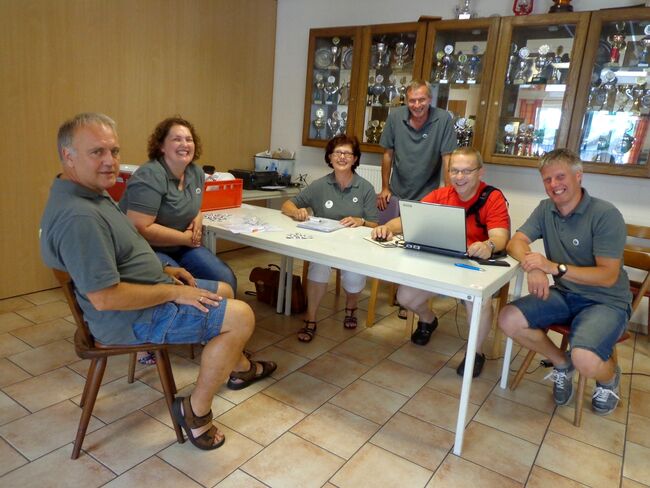 Die Organisatoren des Zeltlagers und Jugendtages 2016. Wie zu sehen, hat hier natürlich auch die "Elektronik" Einzug gehalten, ohne Laptop "läuft" auch hier nichts. Jürgen Vogt, Petra Märtens, Edith Obenhaus, Gerd Griffel, Ewald Ehlers und Bernd Dammeier sind guter Dinge, dass auch in diesem Jahr das Jugendwochenende mit Zelten, Spaß und Spiel und am Sonntag die Schießwettbewerbe gut über die Bühne gehen werden.