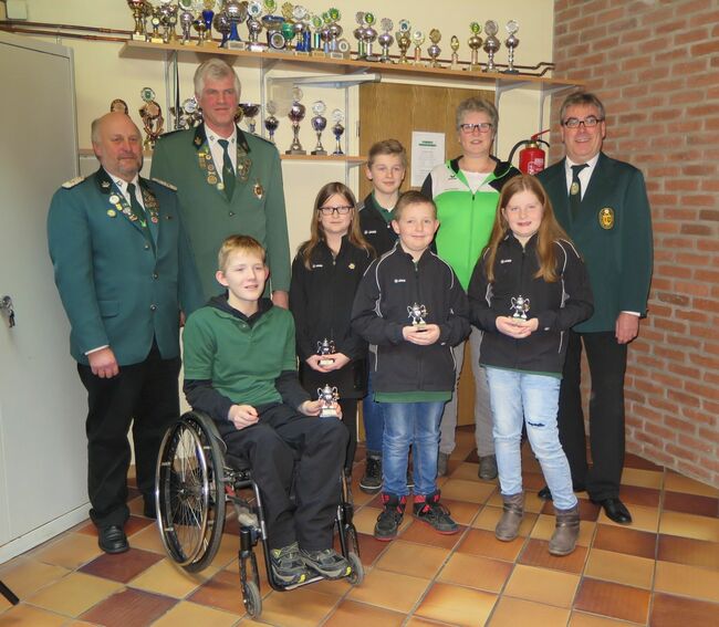Gerd Harzmeier und Karin Husmann überreichten Sascha Buschhorn (1. Platz Lichtpunktpistole Freihand-Jahrgang 2004), Lenja Niehaus (2. Platz Lipu-Pistole Auflage-Jahrgang 2006), Fabian Emker (3. Platz Lipu-Pistole Auflage-Jahrgang 2007), Finn Lukas Plate (2. Platz-Lipu-Pistole Auflage-Jahrgang 2006) und Janne Gerdes (1. Platz Lipu-Pistole Auflage-Jahrgang 2007) je einen kleinen Erinnerungspokal. Fionn Zierden (3. Platz Lipu-Pistole Freihand-Jahrgang 2005) und seine Schwester Okka (1. Lipu-Pistole Auflage-Jahrgang 2008) werden ihre Auszeichnung zu einem späteren Zeitpunkt erhalten.