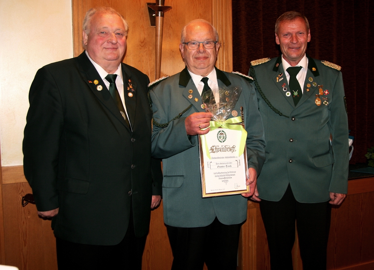 In seiner Laudatio hob Gerd Griffel seine Tätigkeiten für das Schützenwesen im Verein und Bezirk hervor. Günter war von 1975 bis 1983 stellvertretender Schriftführer, von 1983 bis 1999 stellv. Kommandeur und von 1999 bis 2007 Kommandeur. 1977 errang er auch die Königswürde im Verein. Außerdem ist er seit vielen Jahren mit als Staffelleiter bei den Rundenwettkämpfen Luftgewehr- und Kleinkalber angelegt im Bezirk tätig. Ehrungen erhielt er für viele Jahre Engagement für das Deutsche Schützenwesen vom Verein, Bezirk und vom NWDSB.