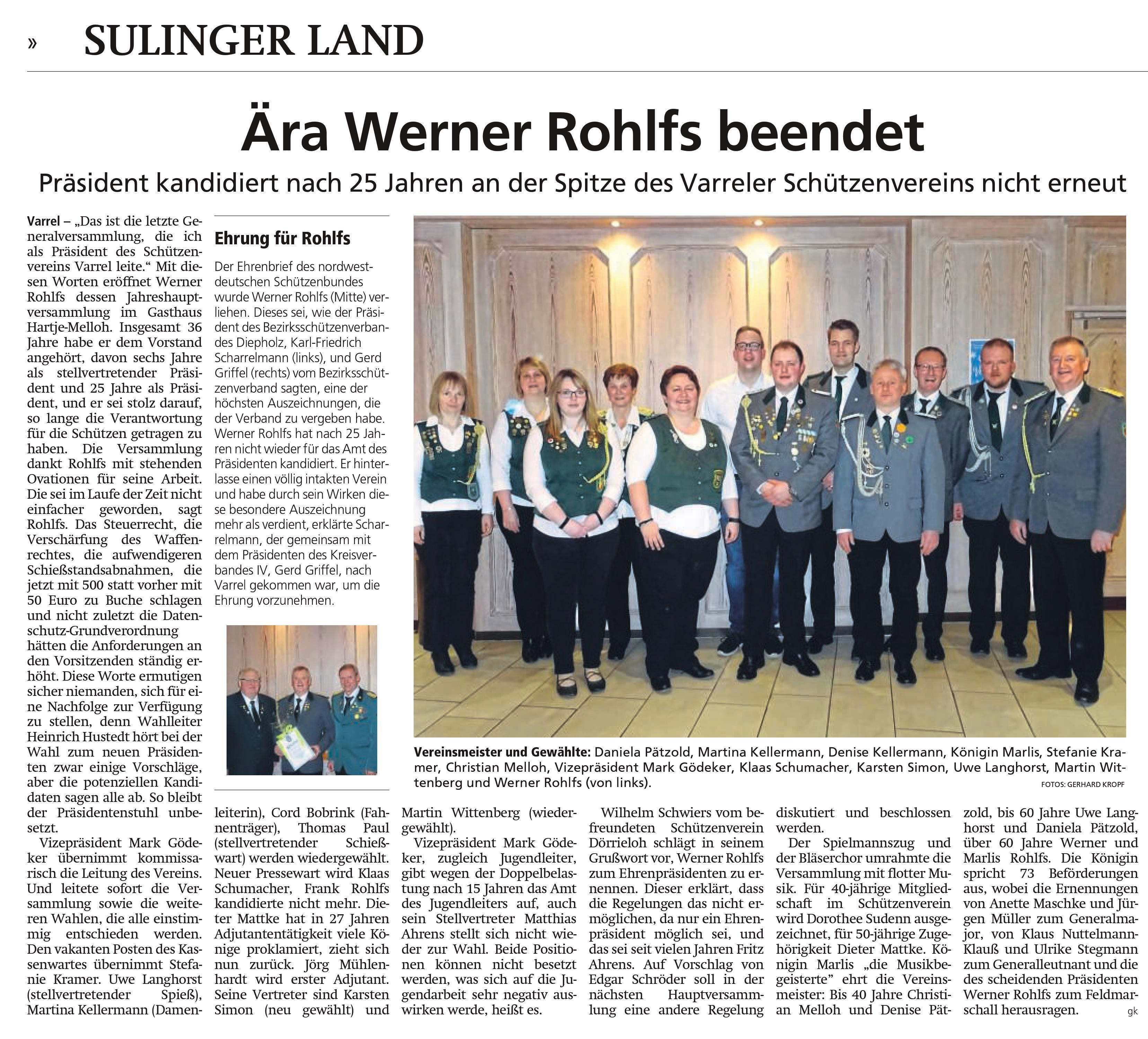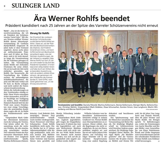 Während der Jahreshauptversammlung des Schützenvereins Varrel, wurde der Ehrenbrief des Nordwestdeutschen Schützenbundes (NWDSB) an Werner Rohlfs verleihen. Er erhielt diese Auszeichnung vom Bezirkspräsidenten Karl-Friedrich Scharrelmann im Beisein von Gerd Griffel, Präsident des Kreisverbandes IV, dieses wurde durch lang anhaltenden Beifall der anwesenden Mitglieder unterstrichen. Laut Scharrelmann sei dieser Brief mit einer der höchsten Auszeichnungen des NWDSB.