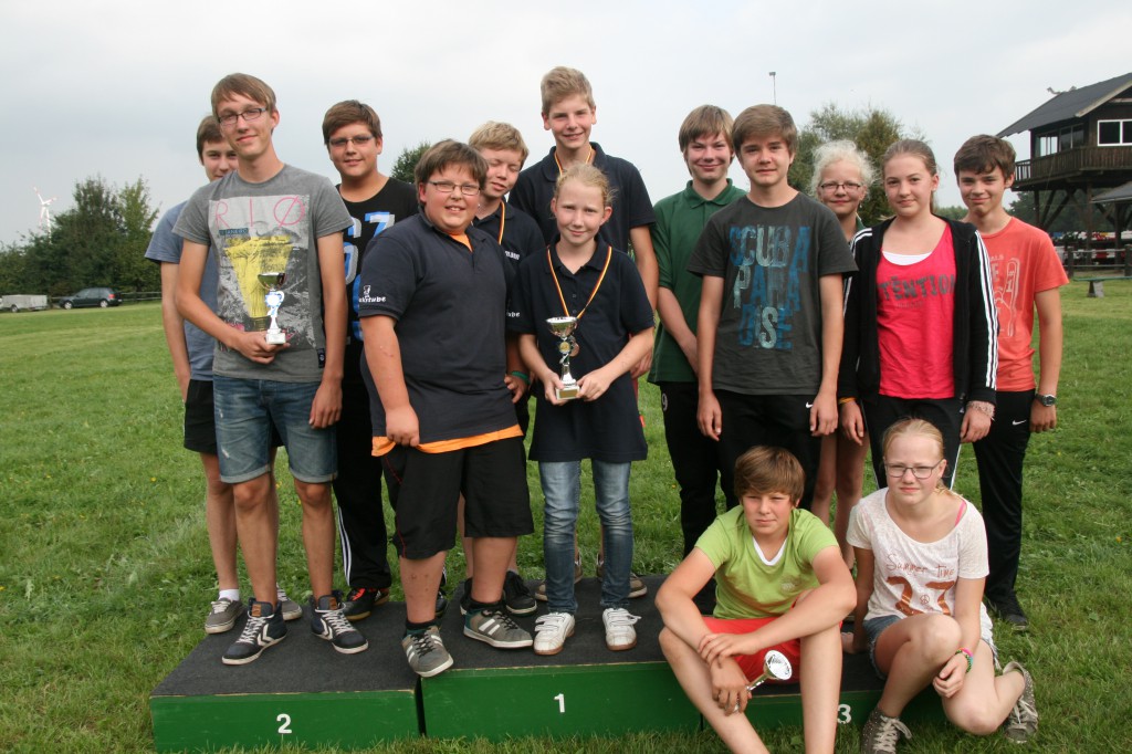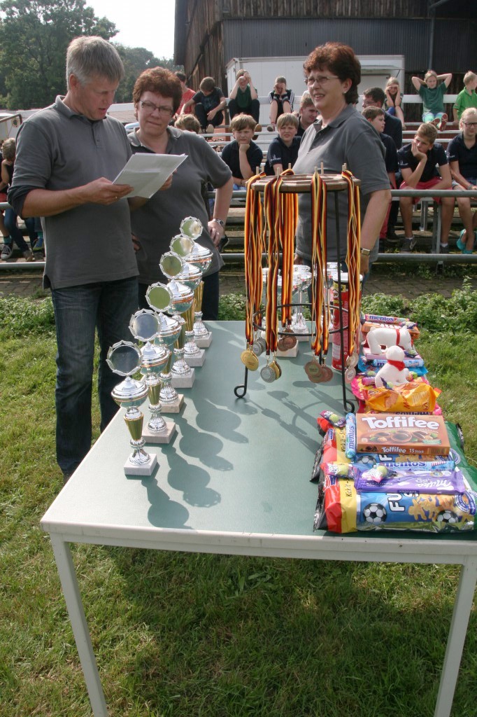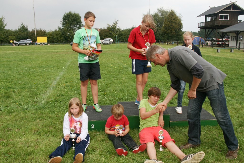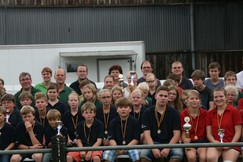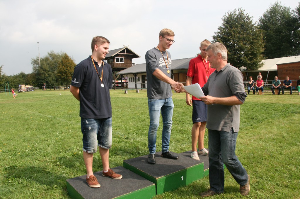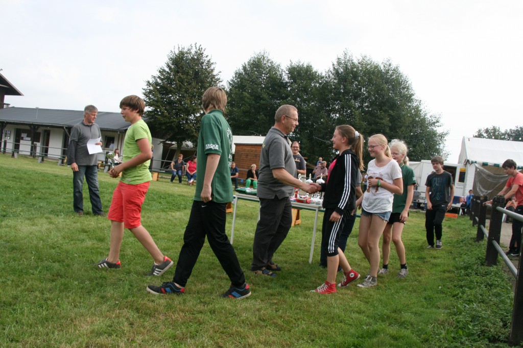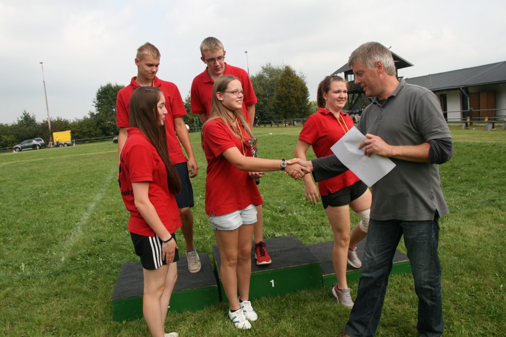 Bernd Dammeier verlas dann die von Rainer Gaumann und Ewald Ehlers ausgewerteten Ergebnisse der Sieger, Jugendsportleiterin Marion Schur und Sportleiter Ewald Ehlers überreichten die Medaillen und Pokale an glückliche Sieger. Mannschaftsurkunden werden am 19. September beim Delegiertentag verliehen. Das Publikum geizte bei der Siegerehrung nicht mit Beifall, sie hatten den idealen Platz auf der Zuschauertribüne. Für die Lagerwertung wurden Pokale und verpackte Süssigkeiten an alle sechs teilnehmenden Vereine vergeben. Zu erwähnen ist, dass Bernd Dammeier wohl schon lange nicht mehr so viele Hände geschüttelt hat.