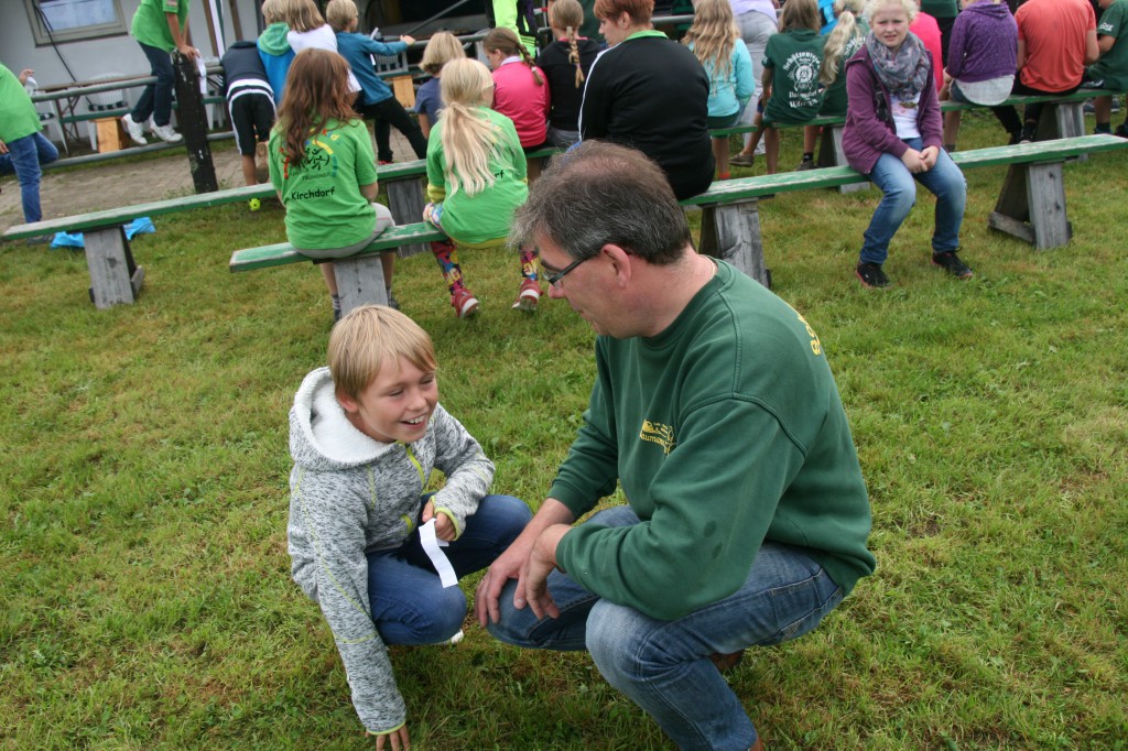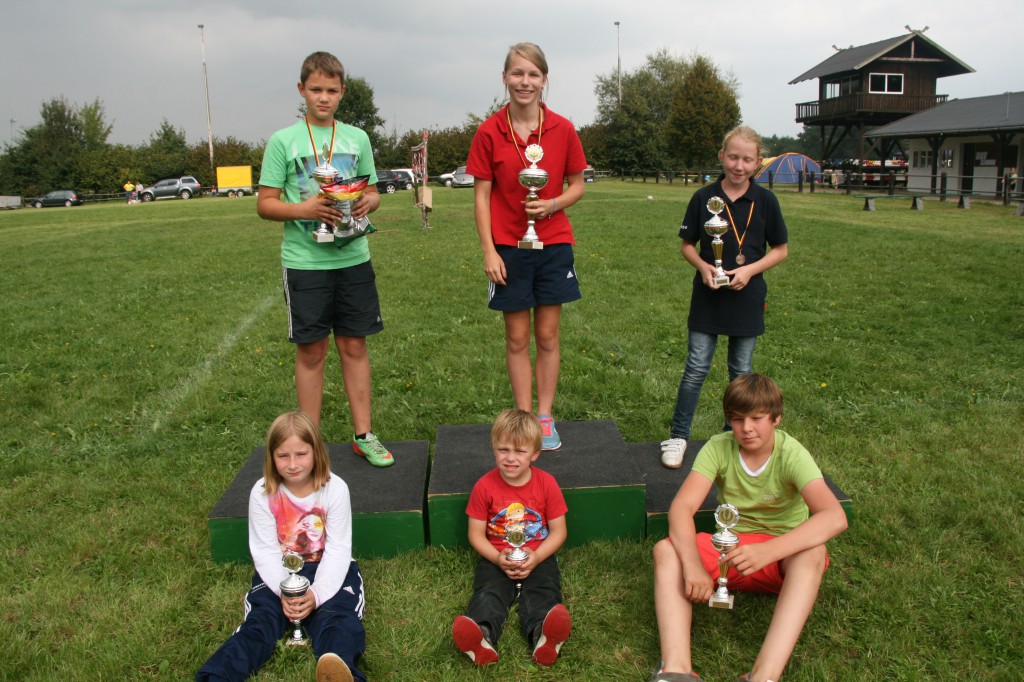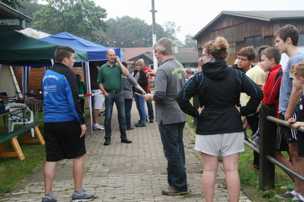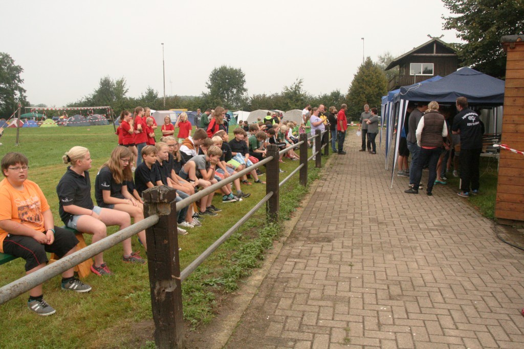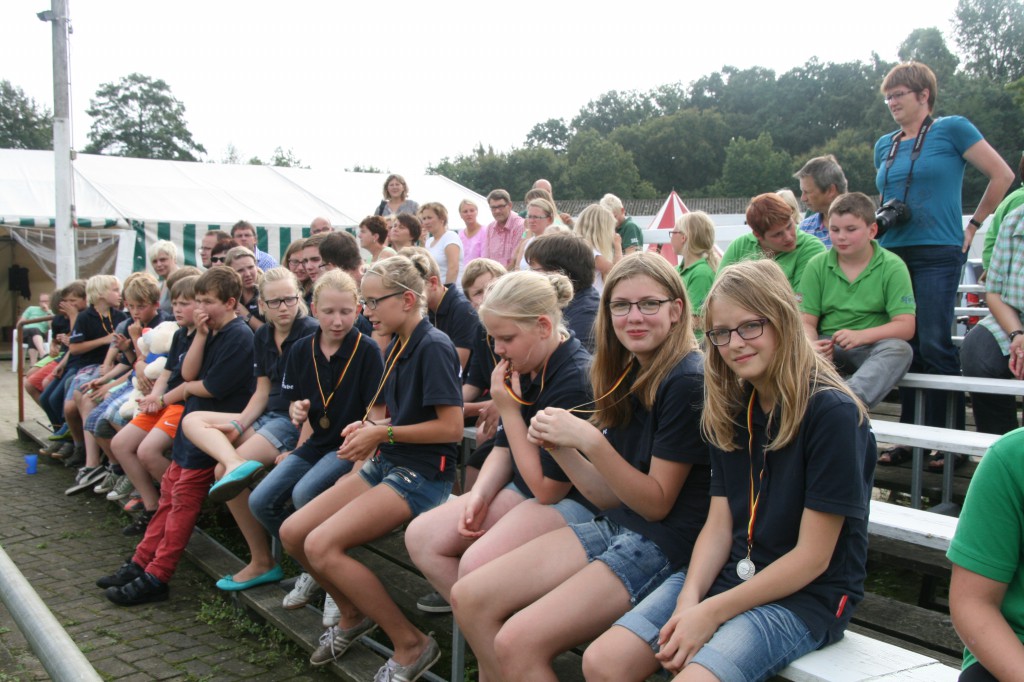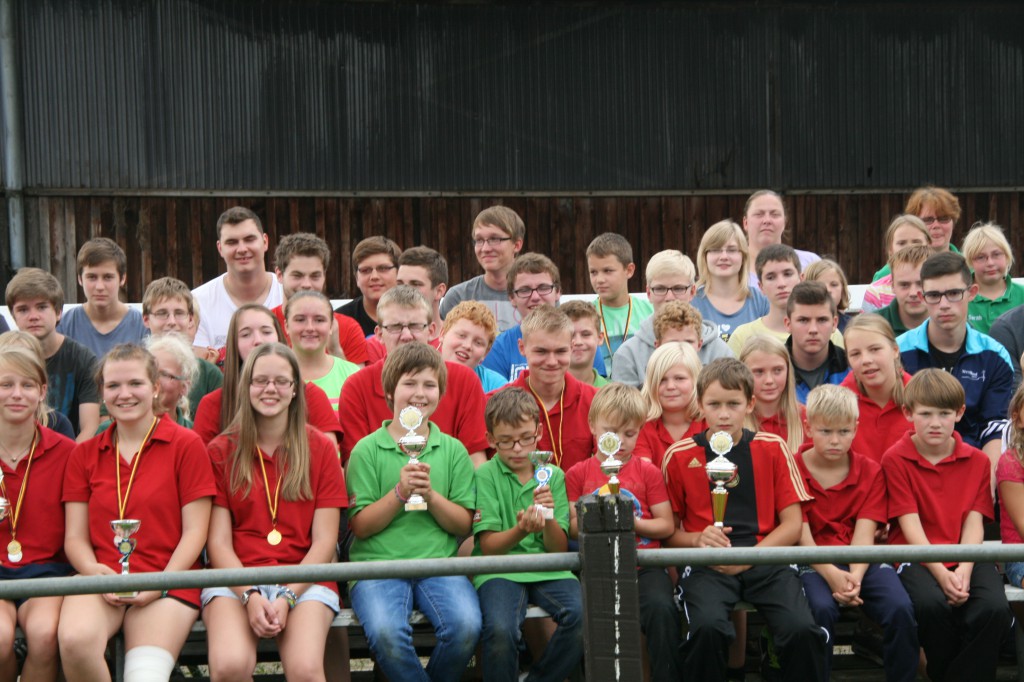 Bernd Dammeier verlas dann die von Rainer Gaumann und Ewald Ehlers ausgewerteten Ergebnisse der Sieger, Jugendsportleiterin Marion Schur und Sportleiter Ewald Ehlers überreichten die Medaillen und Pokale an glückliche Sieger. Mannschaftsurkunden werden am 19. September beim Delegiertentag verliehen. Das Publikum geizte bei der Siegerehrung nicht mit Beifall, sie hatten den idealen Platz auf der Zuschauertribüne. Für die Lagerwertung wurden Pokale und verpackte Süssigkeiten an alle sechs teilnehmenden Vereine vergeben. Zu erwähnen ist, dass Bernd Dammeier wohl schon lange nicht mehr so viele Hände geschüttelt hat.