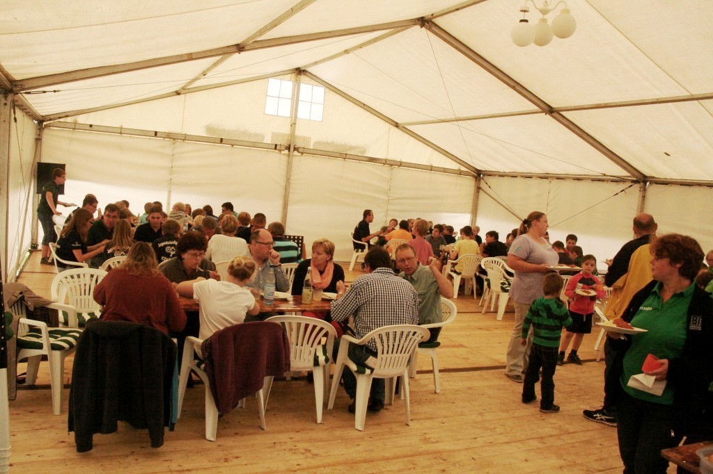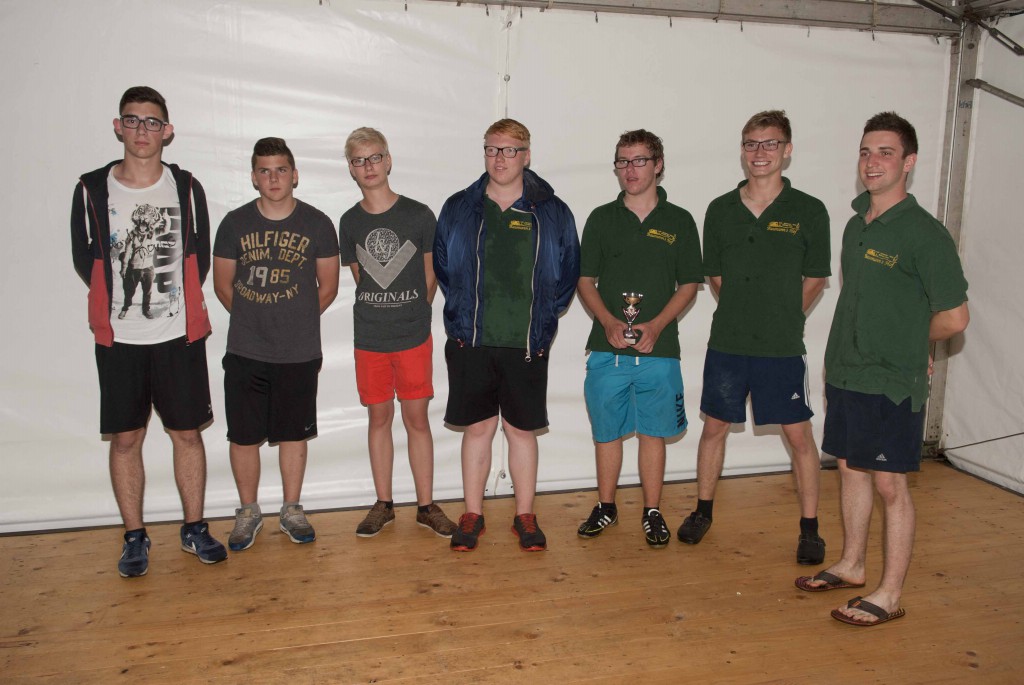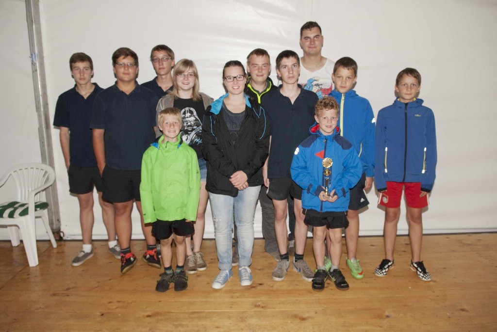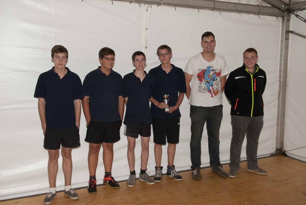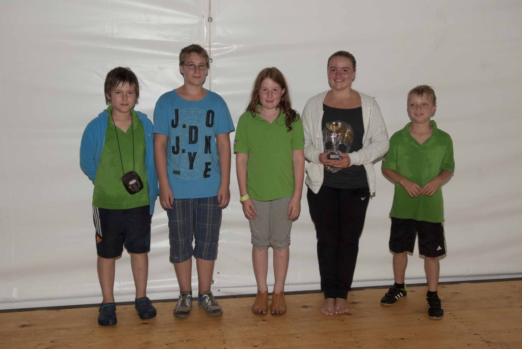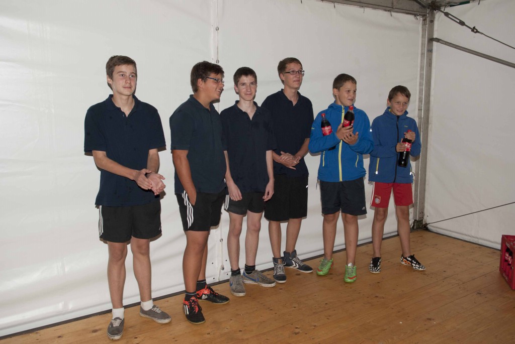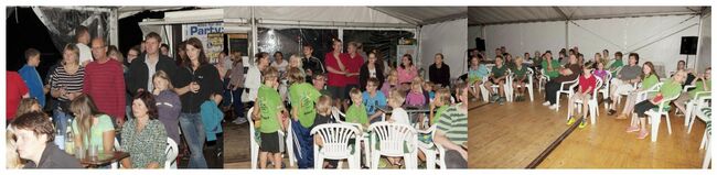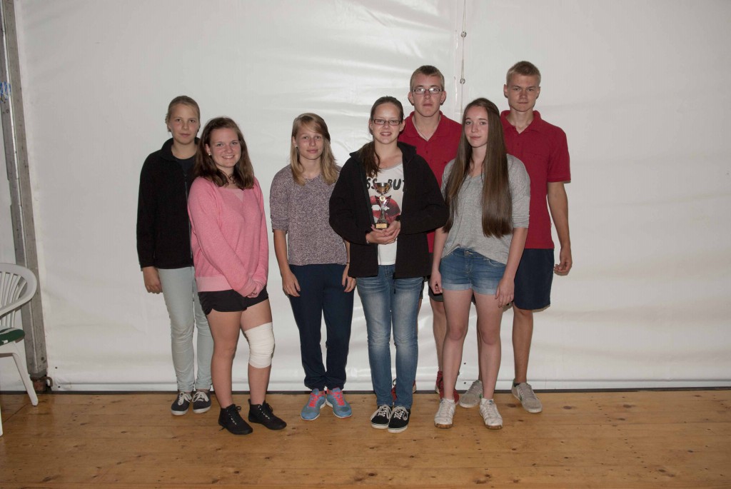 Die Siegerehrung der Mannschaftsspiele, musste wegen eines Gewitterschauers, im großen Zelt abgehalten werden. Es gab trotzdem eine große Schar von Zuschauern, welche den Siegern der Dorfrally, des Volleyball und des Völkerball lautstark mit Beifall Lob zollten.