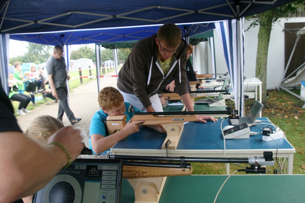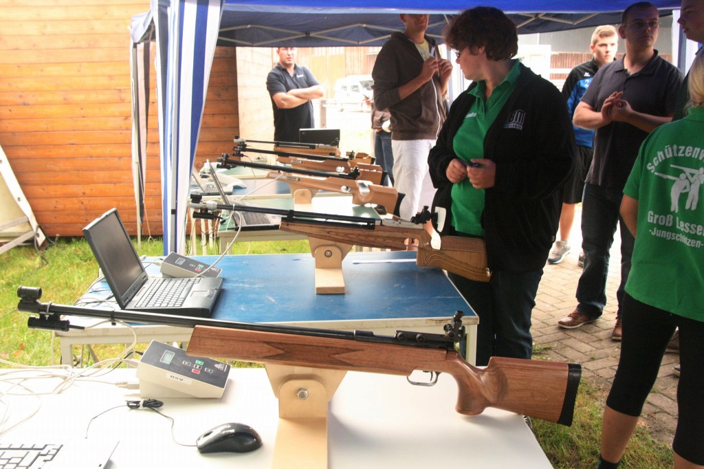 Sportleiter Ewald Ehlers rief die gemeldeten Teilnehmer auf: erst mit einem der vier Lichtpunktgewehre schießen, (ein Betreuer stand ihnen dort zur Seite) dann so schnell wie möglich ca. 100 m zum „Scheibenstapeln“ laufen und zurück, um noch einmal zu schießen.
