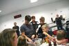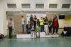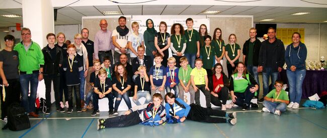 Das Abschlußfoto mit fast allen Lichtpunktschützen, Betreuern und Eltern. Kurz vorher hatte jeder Lichtpunktschütze eine Teilnehmermedaille von der Vizepräsidentin Jugend des Westfälischen Schützenbundes Sabine Lüttmann erhalten. Von links: Sabine Lüttmann, Gerd Harzmeier - 2. Von rechts sitzend: Britta Löhmann
