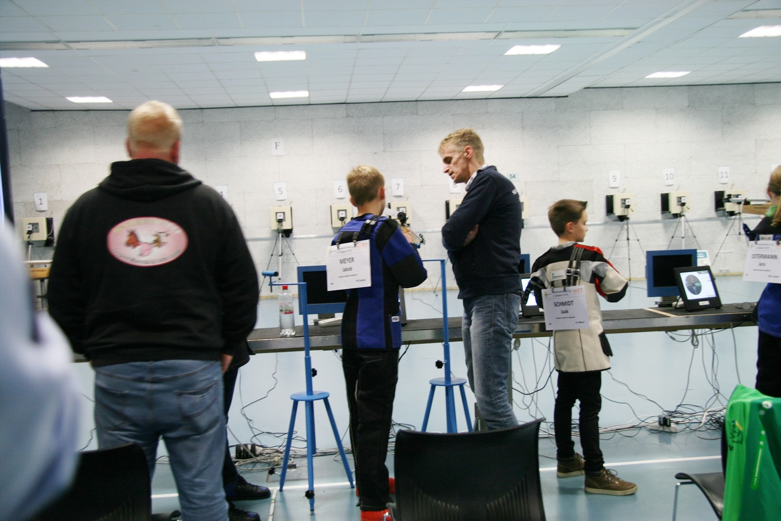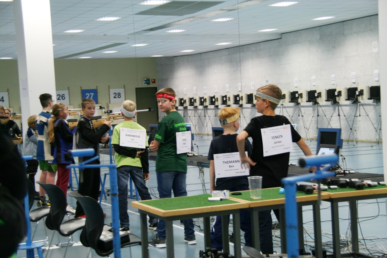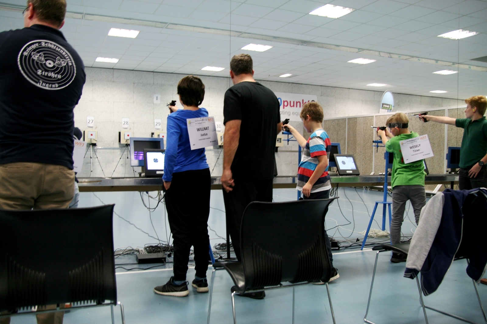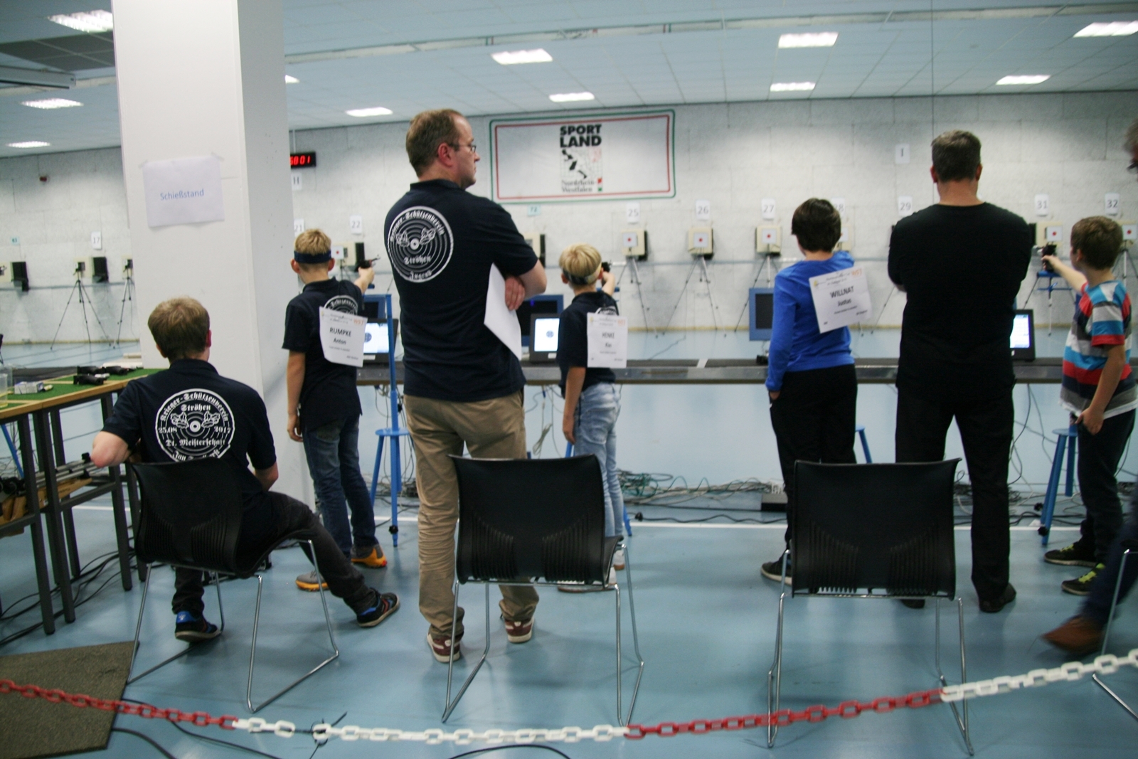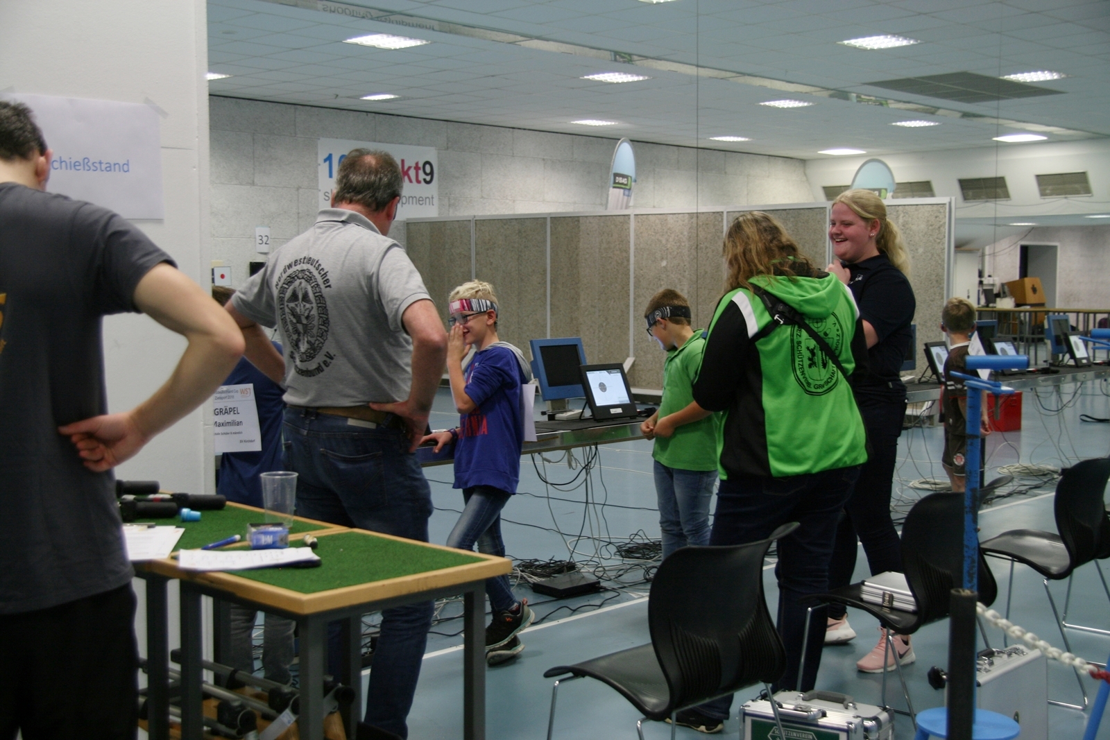 Es waren 32 Stände jeweils für Lichtpunktgewehre und Lichtpunktpistolen aufgebaut, da zu gab es einen gut übersehbaren Anmeldestand. Um 11:0 Uhr war der erste Start, vor jedem der sechs Starts mit 20 Wertungsschüssen, wurde mit Landesjugendleiterin Tatjana Matuschek und ihren Helfern ein „Aufwärmspiel“ mit den jungen Sportschützen durchgeführt, anschließend 10 Wertungsschüsse, vor den weiteren 10 Schüssen eine Bewegungsaufgabe, nach dem Wettkampf nochmals eine Bewegungsaufgabe als Abschluß.