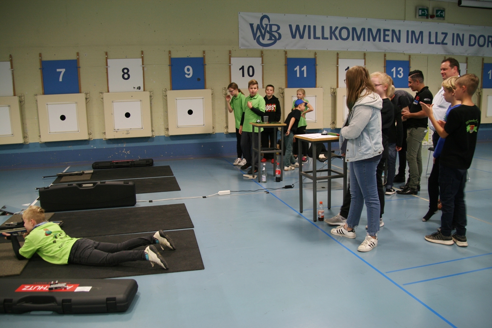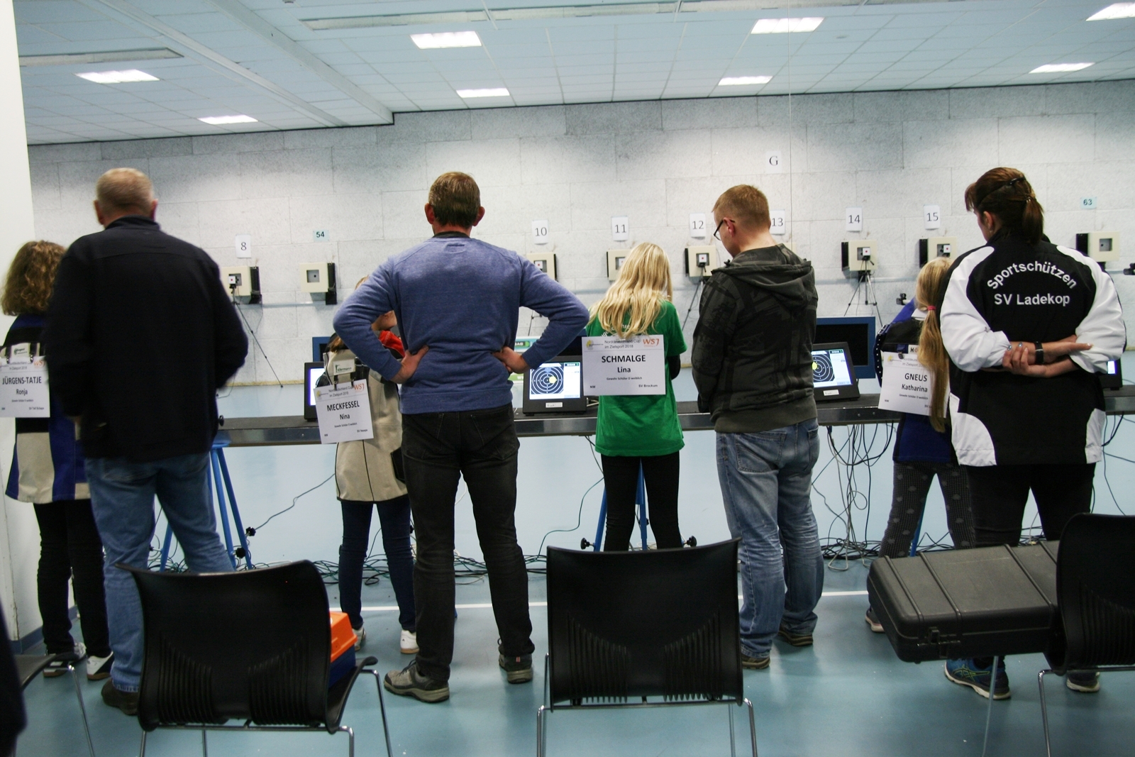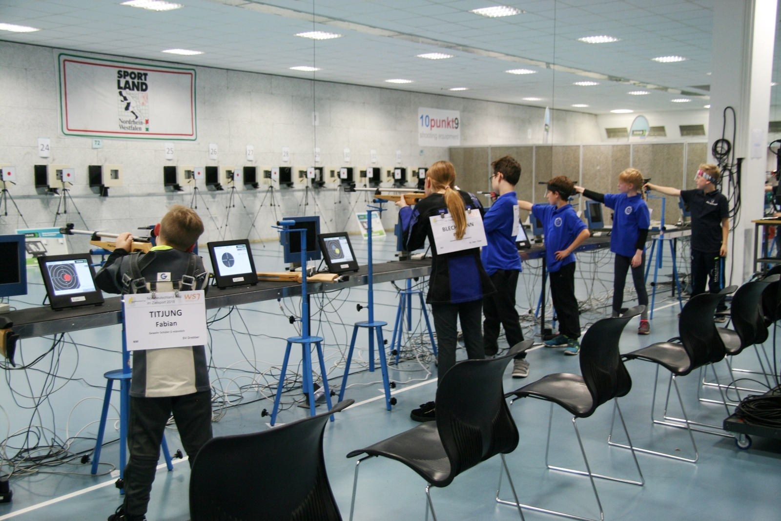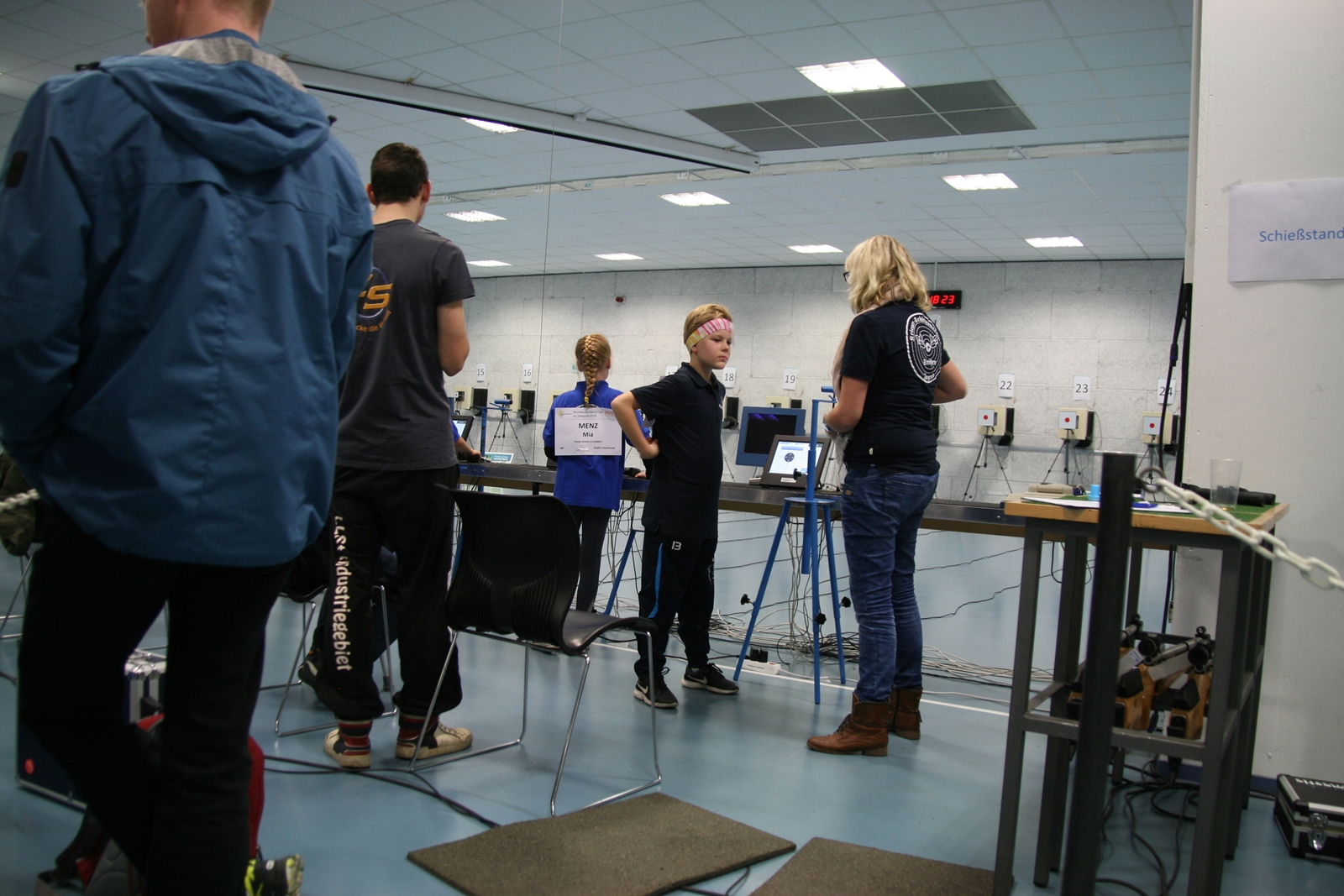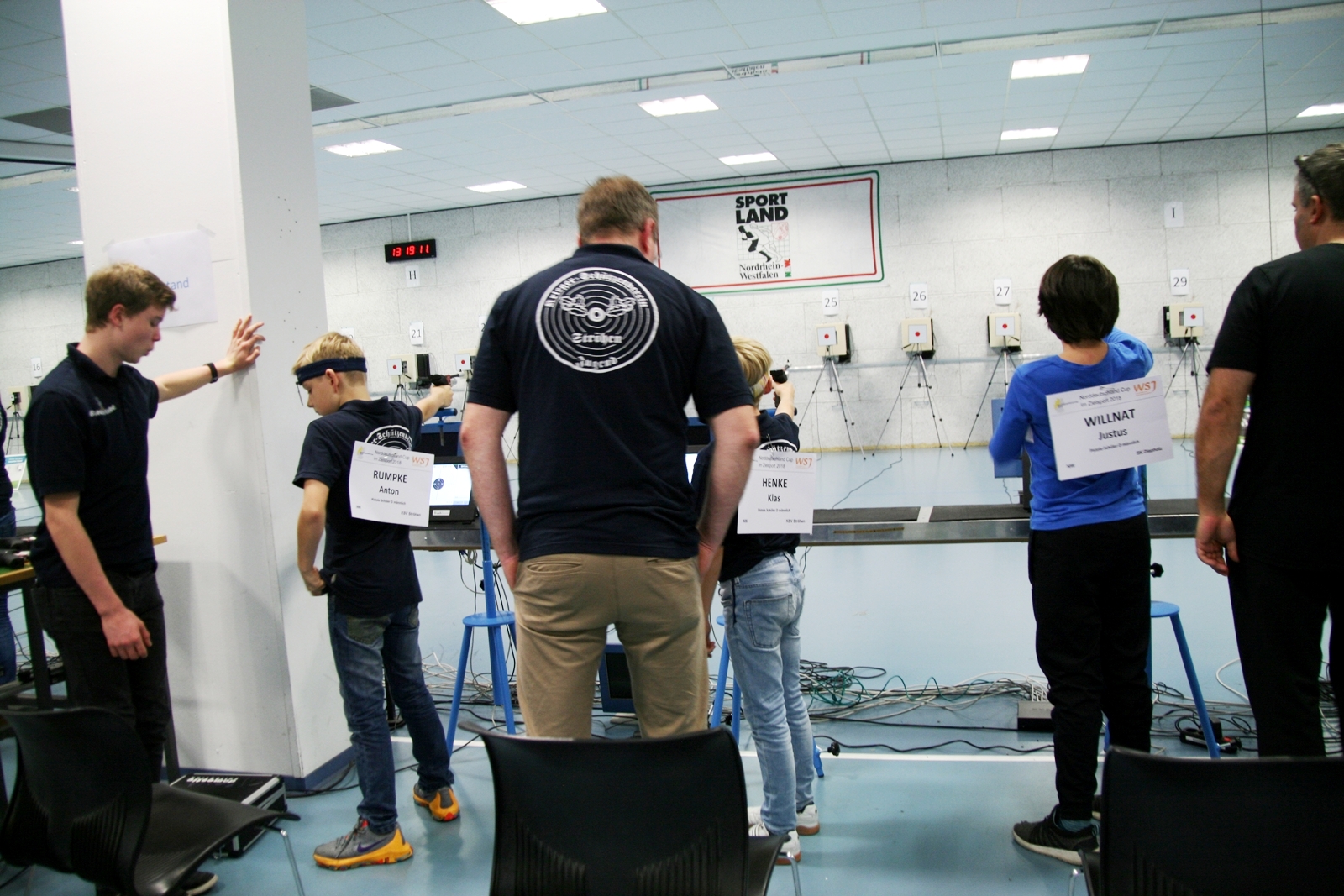 Es waren 32 Stände jeweils für Lichtpunktgewehre und Lichtpunktpistolen aufgebaut, da zu gab es einen gut übersehbaren Anmeldestand. Um 11:0 Uhr war der erste Start, vor jedem der sechs Starts mit 20 Wertungsschüssen, wurde mit Landesjugendleiterin Tatjana Matuschek und ihren Helfern ein „Aufwärmspiel“ mit den jungen Sportschützen durchgeführt, anschließend 10 Wertungsschüsse, vor den weiteren 10 Schüssen eine Bewegungsaufgabe, nach dem Wettkampf nochmals eine Bewegungsaufgabe als Abschluß.