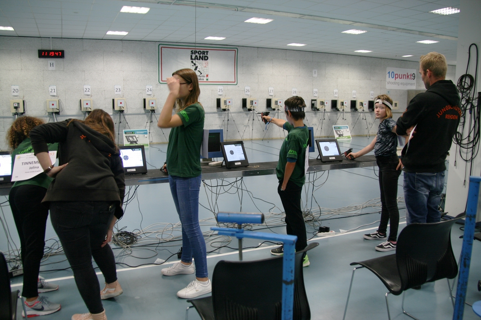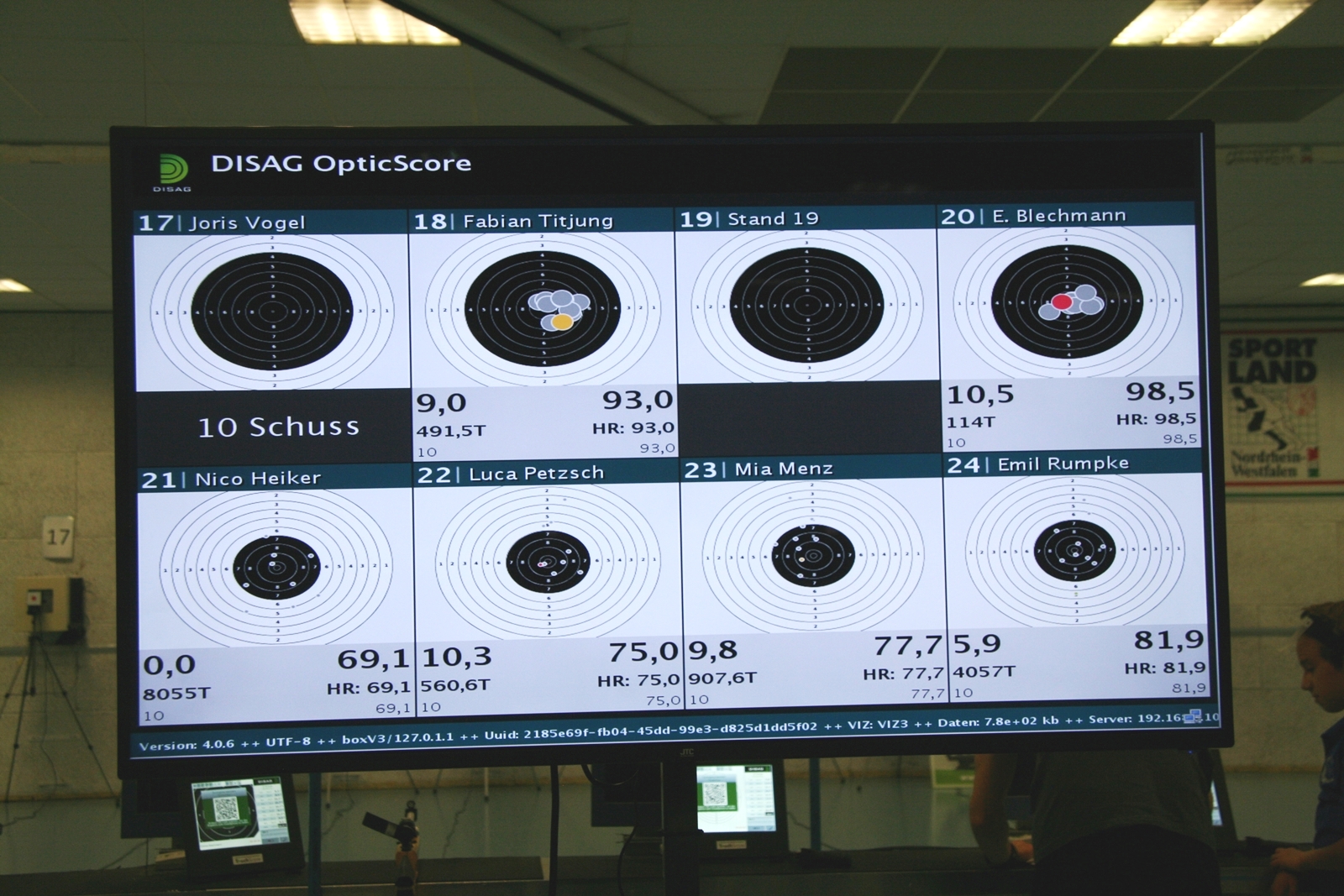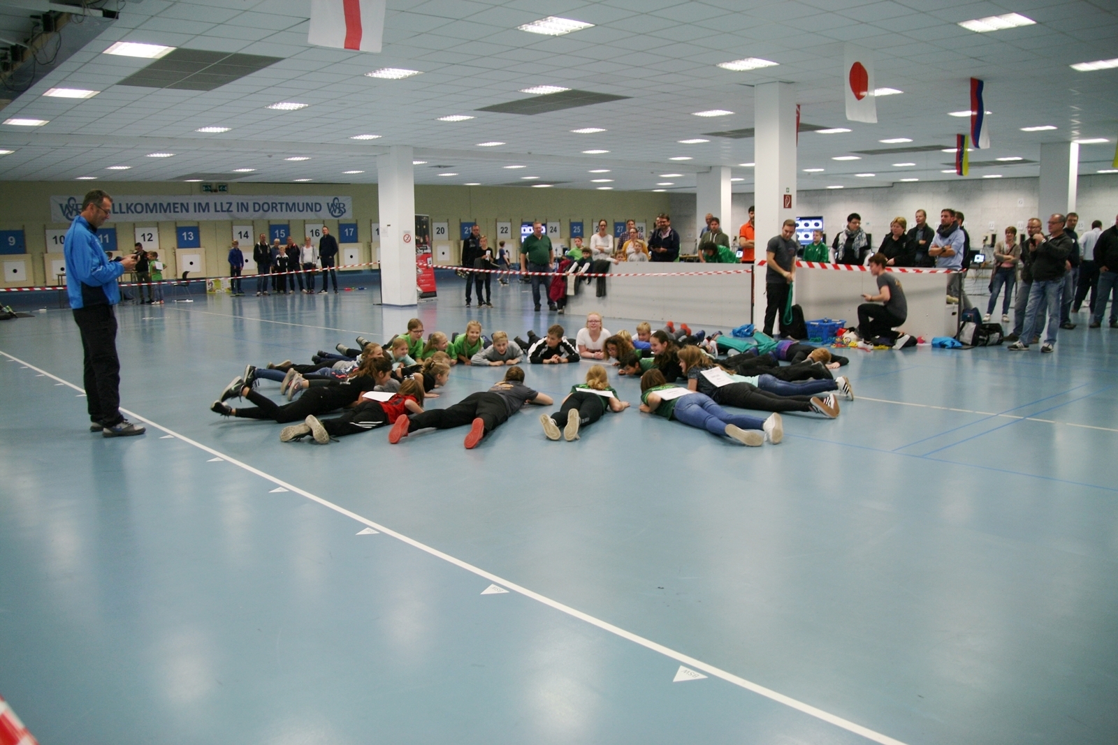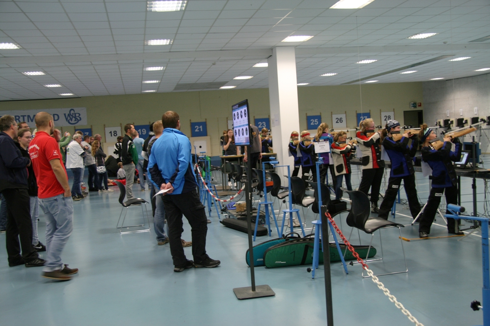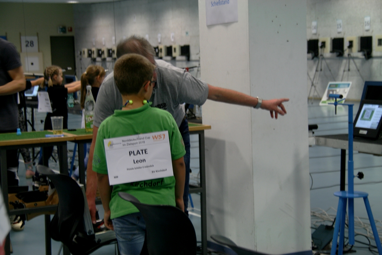 Es waren 32 Stände jeweils für Lichtpunktgewehre und Lichtpunktpistolen aufgebaut, da zu gab es einen gut übersehbaren Anmeldestand. Um 11:0 Uhr war der erste Start, vor jedem der sechs Starts mit 20 Wertungsschüssen, wurde mit Landesjugendleiterin Tatjana Matuschek und ihren Helfern ein „Aufwärmspiel“ mit den jungen Sportschützen durchgeführt, anschließend 10 Wertungsschüsse, vor den weiteren 10 Schüssen eine Bewegungsaufgabe, nach dem Wettkampf nochmals eine Bewegungsaufgabe als Abschluß.