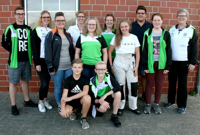Sie alle freuen sich auf "München": (von links) Rico Bergmann, Lisa Reuter, Lea Grünenwald, Lena Löhmann, Lea-Sophie Osterkamp, Marvin Henkel, Daria Kastens. Kniend die beiden Jüngsten: Jonas Mücke u. Louis Löhmann. Als Betreuer sind BZ-Trainerin Karin Husmann, BZ-Jugendsportleiterin Britta Löhmann u. stellvertretende BZ-Damenleiterin Claudia Reuter dabei. (von rechts)