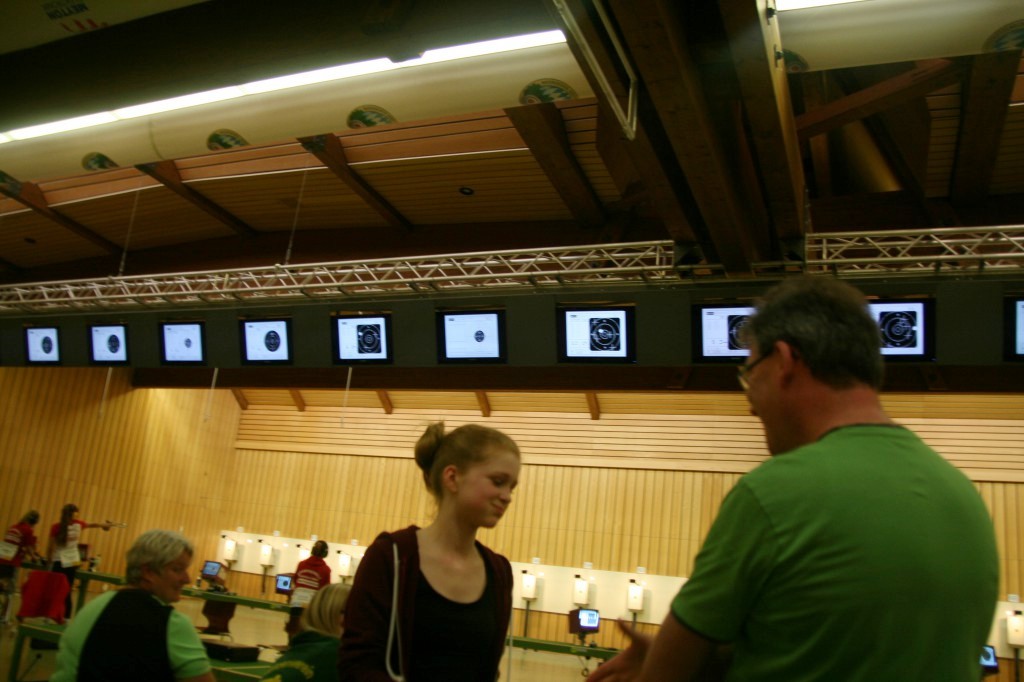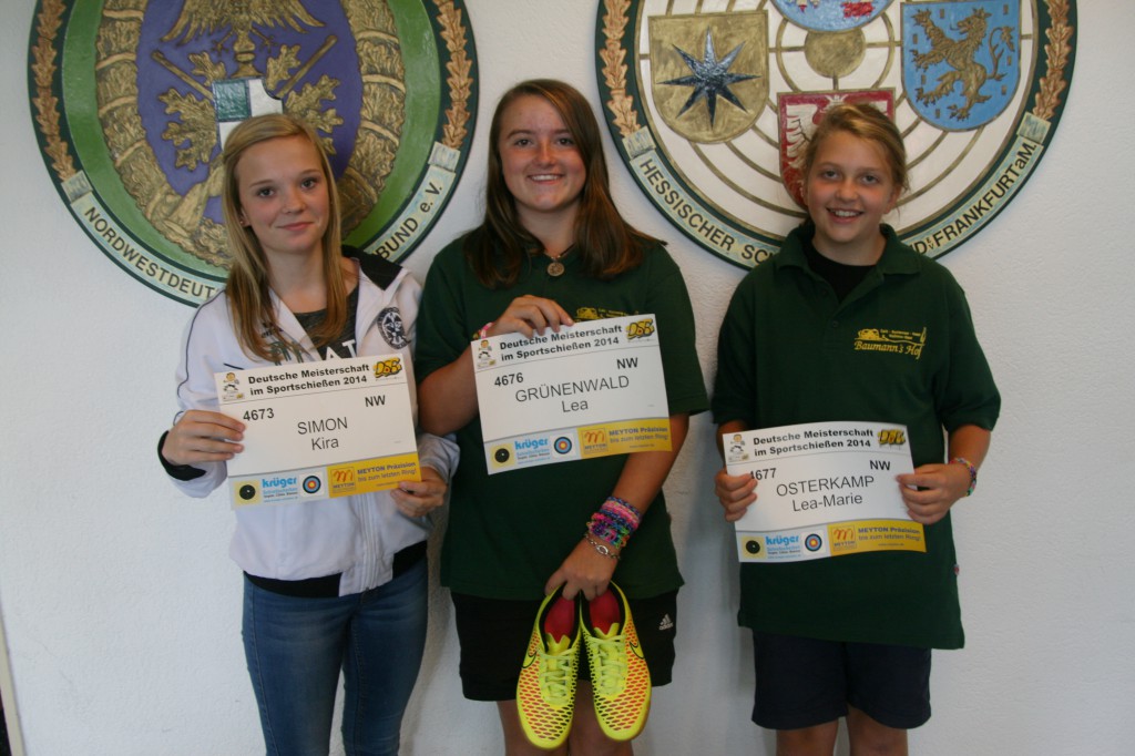 Kira Simon war auch nicht allein nach München gekommen: Vater Heiko nahm sie unter die „Fittiche“, Inge-Lore Behrens und Jana Peper vom Trainerstab des NWDSB, beobachteten ihre Schüler-Kaderschützin (LB 1). Die Serien 85 und 83 ergaben 168 Ringe, sie kam unter das erste Drittel auf Platz 25, eine goldene Meisterschützenmedaille konnte sie sich daher „abholen“. Glückwunsch! Die Glückwünsche der mitgereisten „Daumendrücker“ wurden von allen gern entgegengenommen.