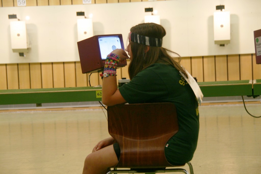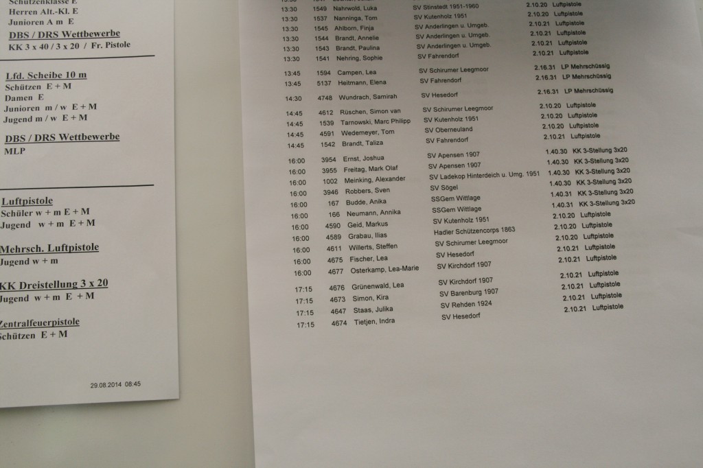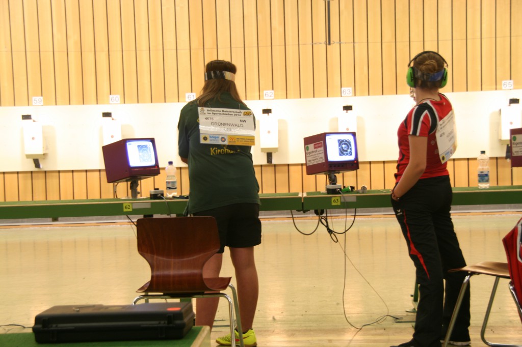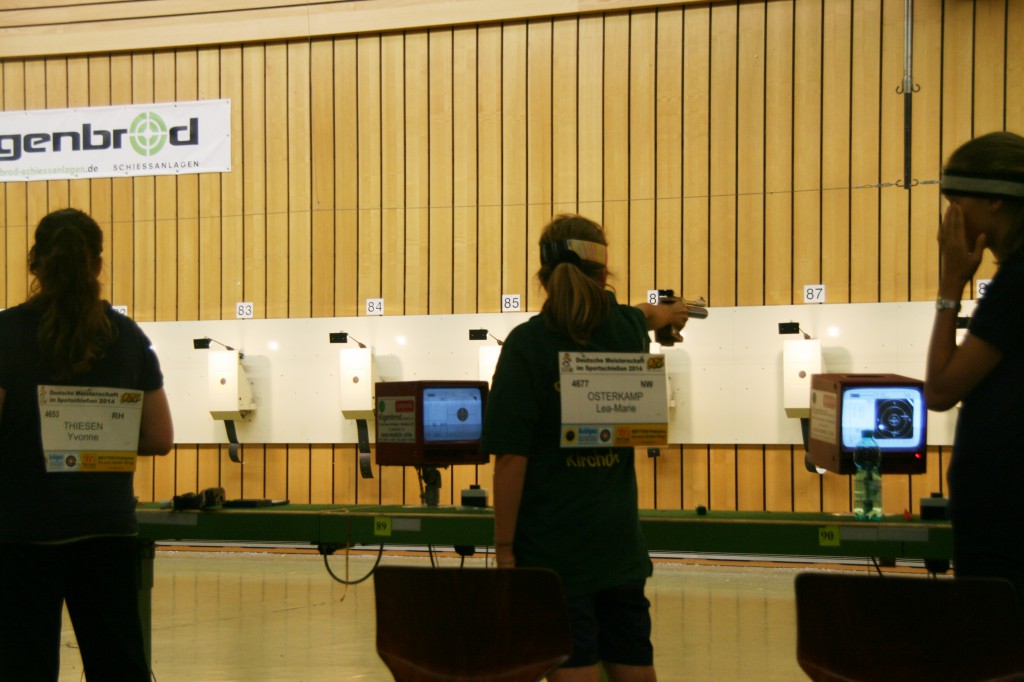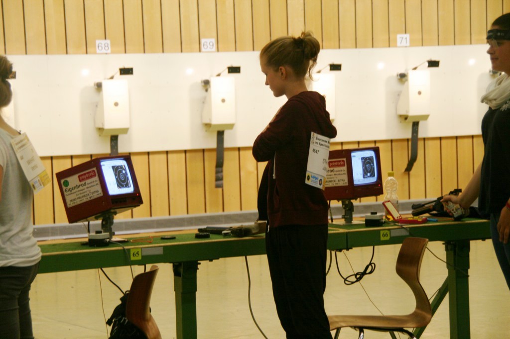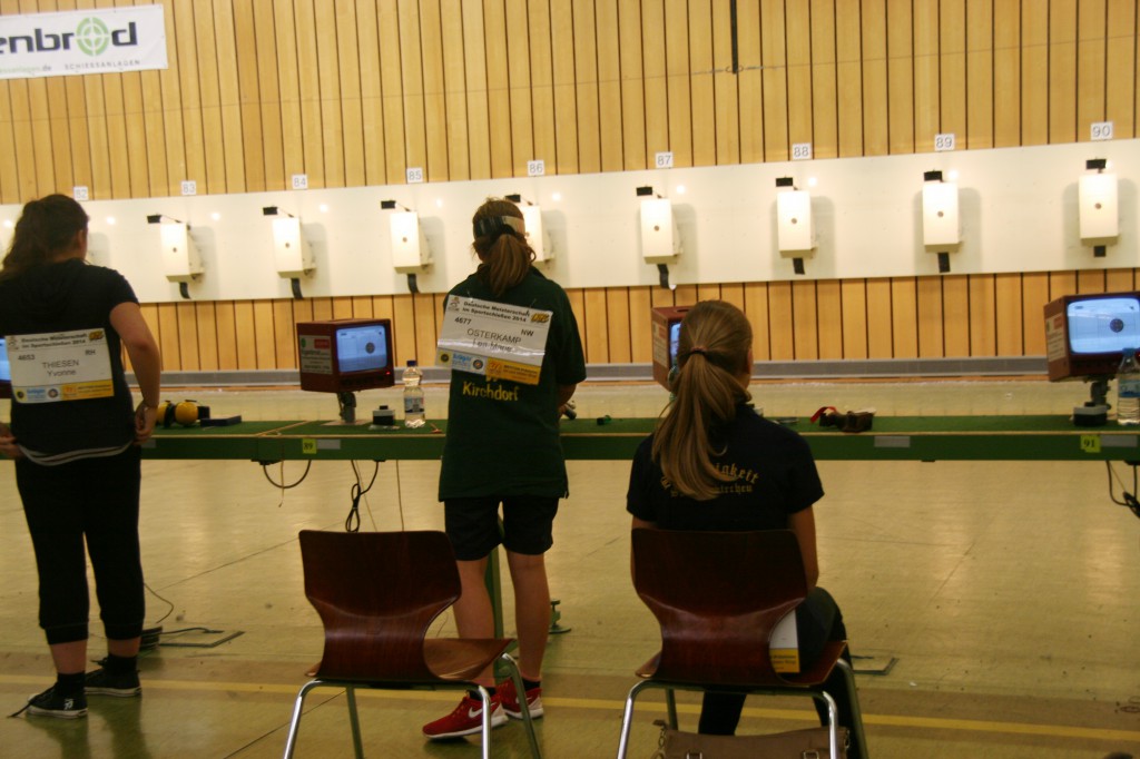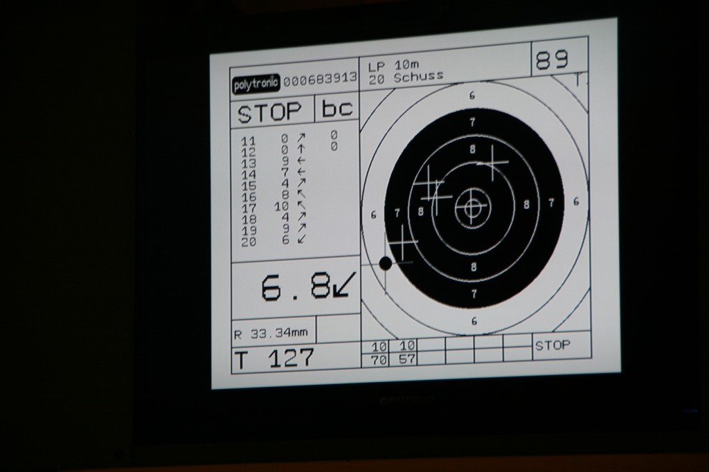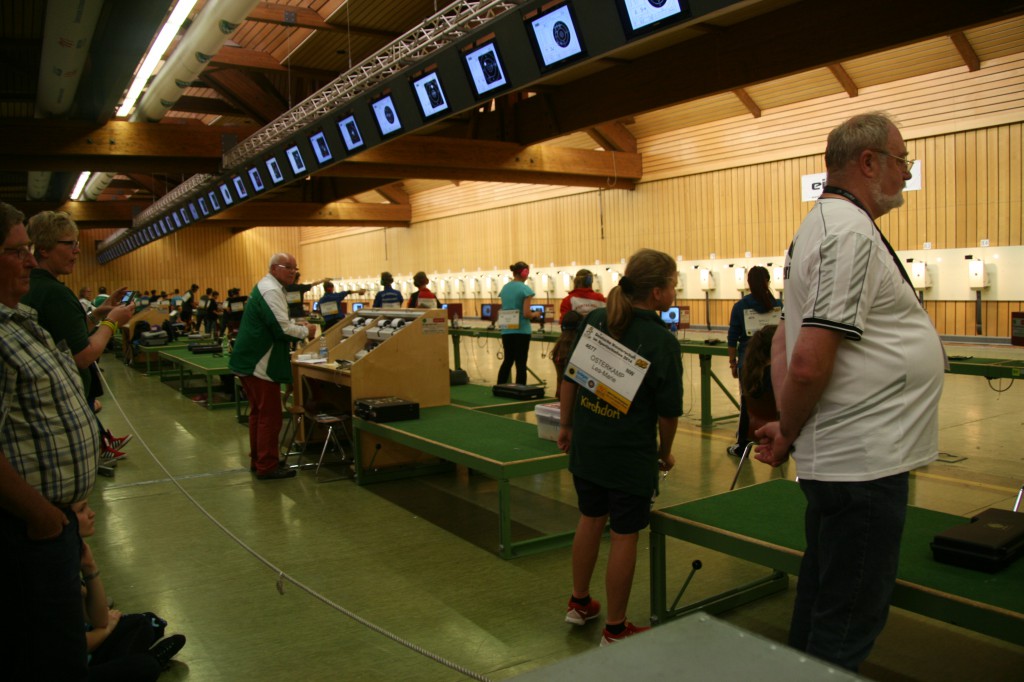 Lea-Sophie war die erste Starterin, 16:00 Uhr war ihr Termin. Karin Husmann, Sportleiterin vom SV Kirchdorf, half ihr beim Einrichten, befestigte ihre Startnummer mit Namen am Rücken. Kirchdorfs Schützenpräsident Gerd Harzmeier wünschte allen ein „Gut Schuß“, er war hier bei der Meisterschaft mit als Helfer und Betreuer der Jugend vom NWDSB eingeteilt, auch beim „RWS-Shooty-Cup“. Lea-Sophie wurde, so wie alle, herzlich zur Deutschen Meisterschaft begrüsst. Es wurde erklärt, dass es nun eine Viertelstunde Vorbereitungszeit gibt, welche auch die Probeschüsse beinhaltet, und es werden die letzten 10 bzw. 5 Minuten angesagt. Nach der Viertelstunde wird von allen gemeinsam der grüne Startknopf gedrückt und dann sind in 30 Minuten die 20 Wertungsschüsse abzugeben. Lea-Sophie schoss die Serien 70 und 57, leider hatte sie zu Beginn der zweiten Serien zweimal eine „Null“, sie blieb aber ganz „cool“ und ließ eine 9, 7,4,8, 10, 4, 9, und 6 folgen.Toll! das ergab abschließend ein Endresultat von 127 Ringen.