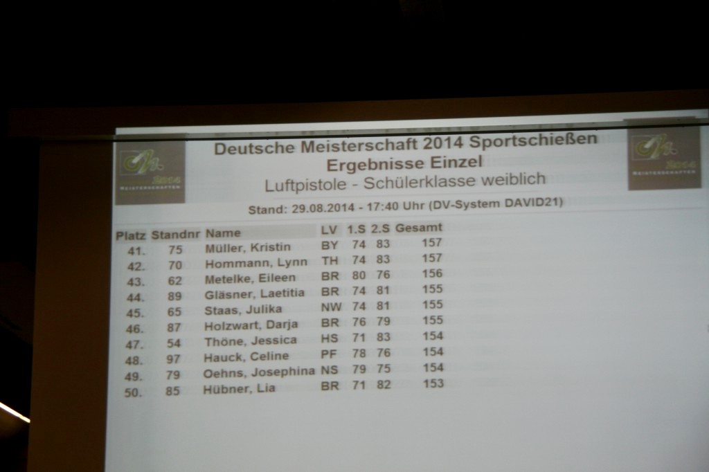 Die Betreuung von Lea Grünenwald übernahm auch Karin Husmann. Lea Grünenwald konnte sich gegenüber der Landesmeisterschaft um 5 Ring verbessern, prima, 163 Ringe mit den Serien 84 und 79 brachten sie auf den 34. Platz und dazu erzielte sie hier noch ihre persönliche Bestleistung!!!
