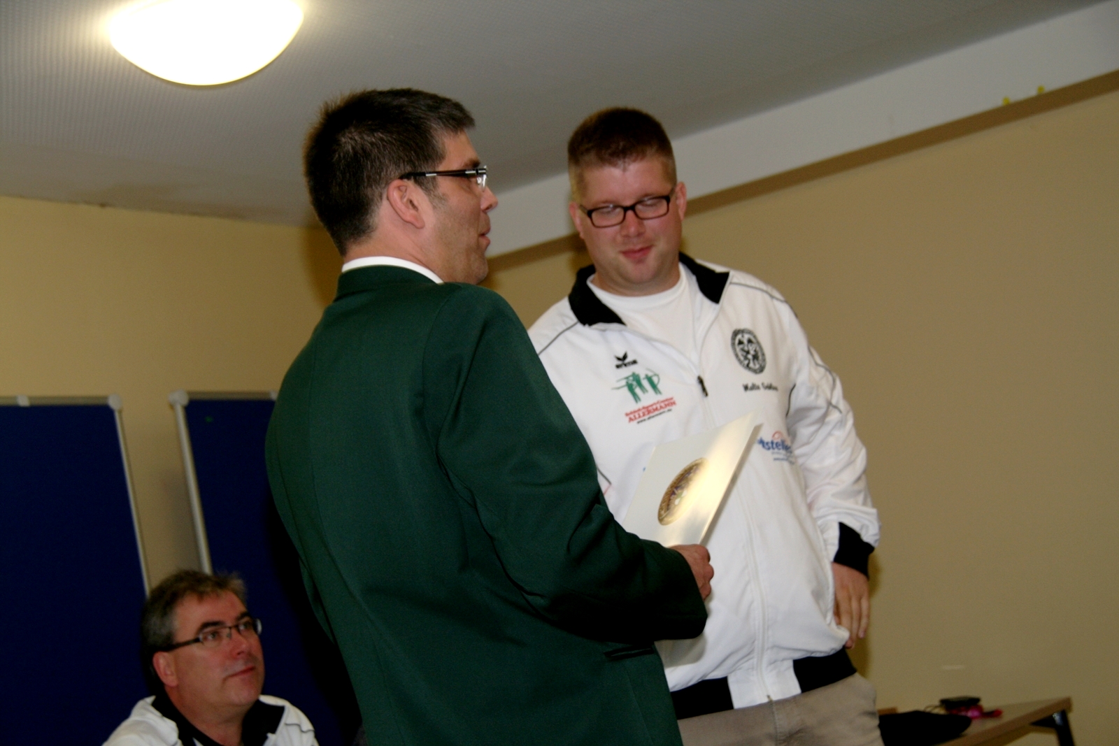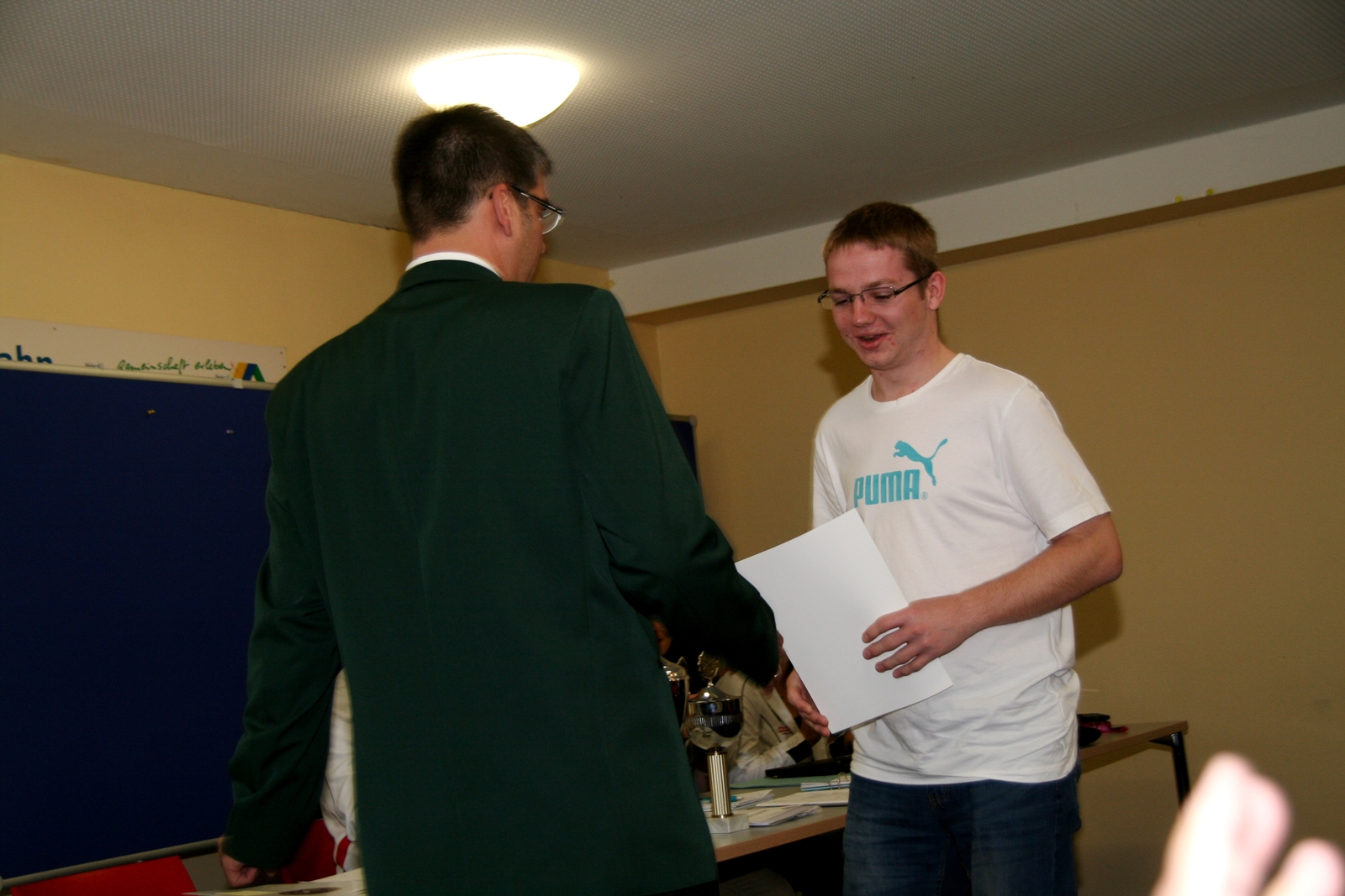 Jugendsportleiter Torsten Meinking überreichte Rainer Gaumann die Urkunde und Ehrennadel der Schützenjugend des NWDSB, stolz nahm Rainer sie in Empfang.