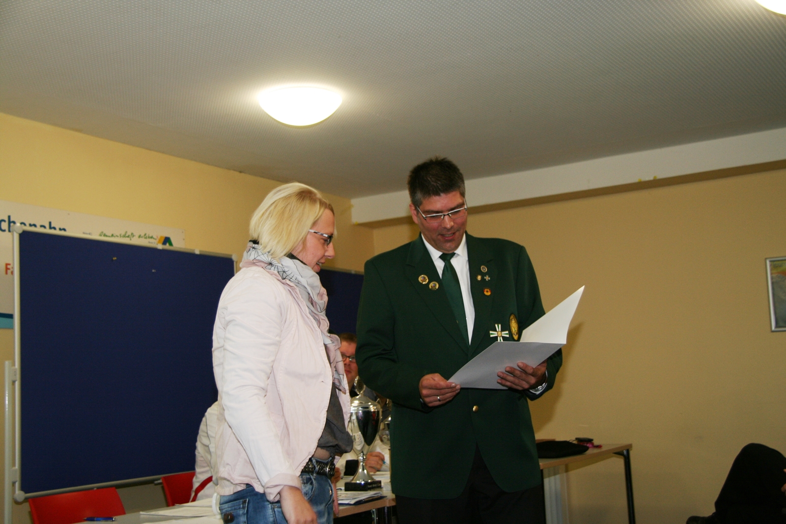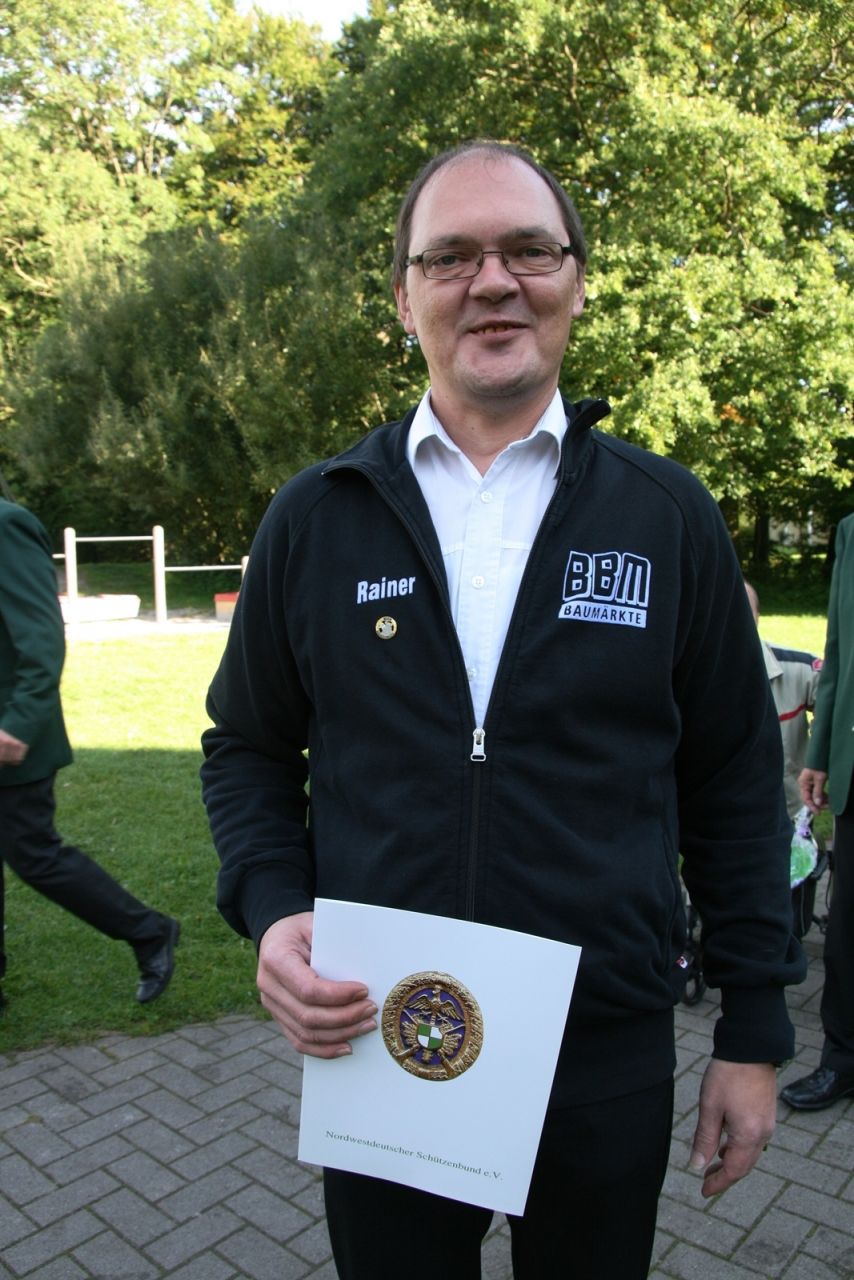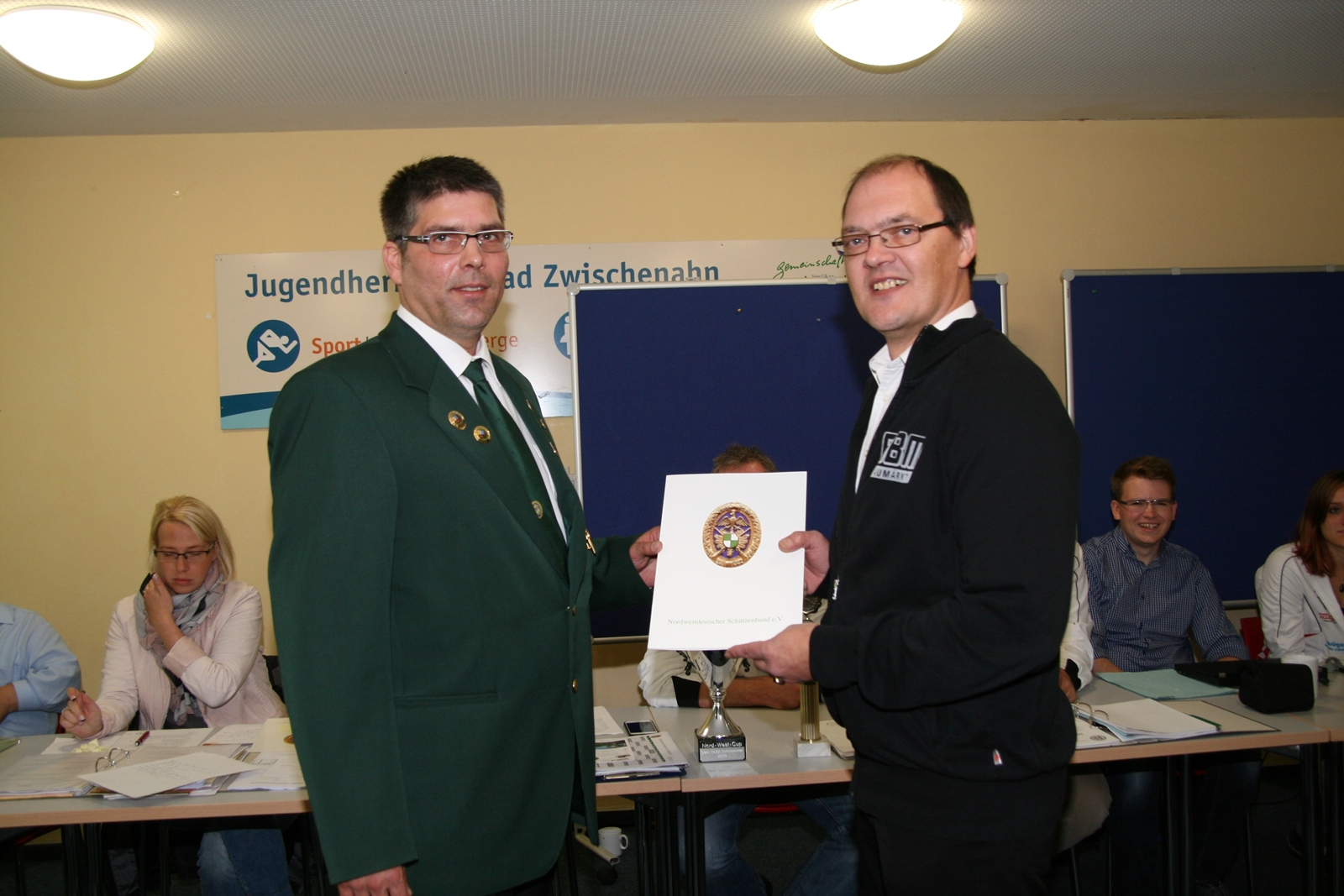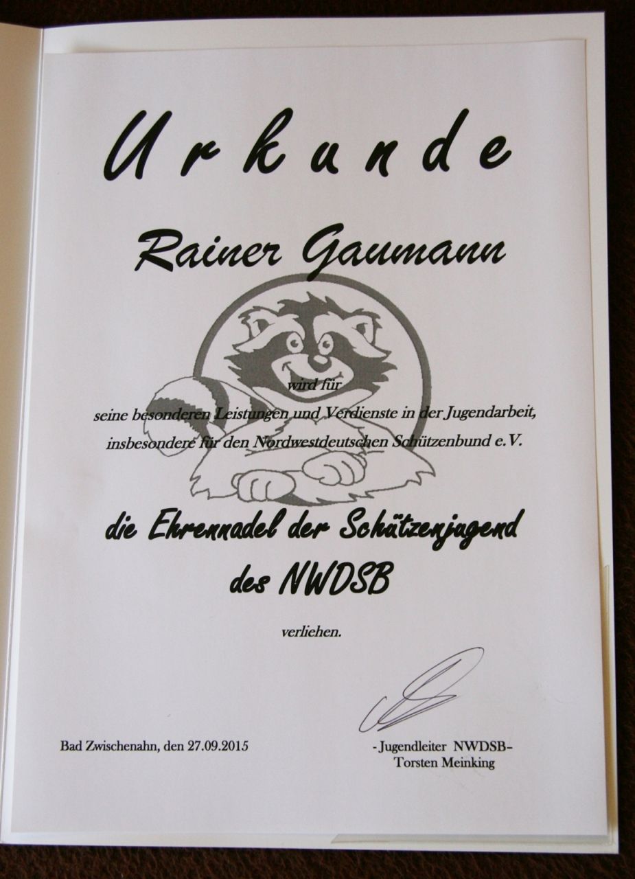 Aufder Tagesordnung zum Landesjugendtag am 27. September stand unter anderem der Punkt Ehrungen. Jugendsportleiter des KV IV, Rainer Gaumann wurde für besondere Leistungen und Verdienste in der Jugendarbeit die Ehrennadel und Urkunde der Schützenjugend des NWDSB beim Landesjugendtag in Bad Zwischenahn von Jugendleiter Torsten Meinking verliehen.