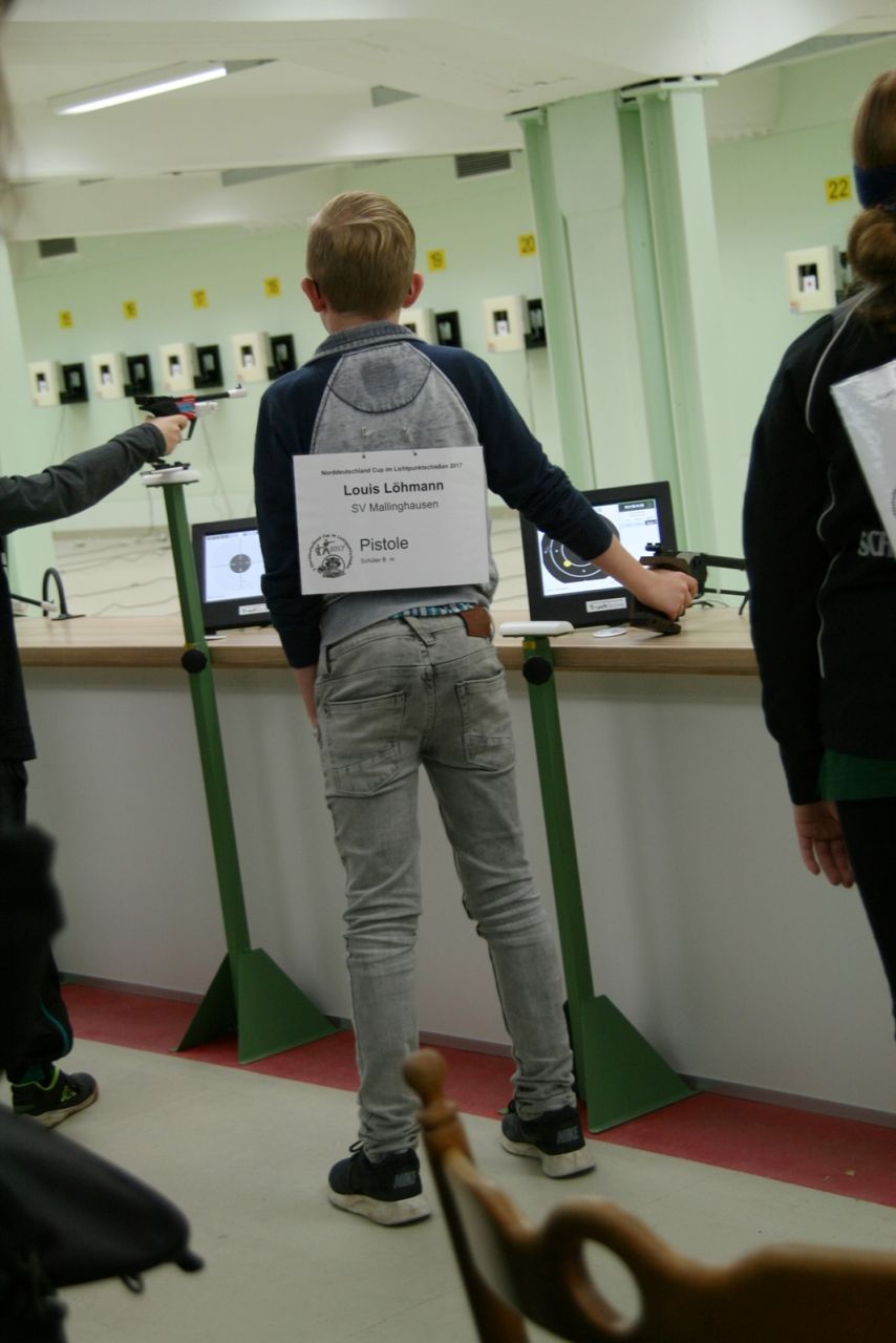 Mit der Lichtpistole Schüler B männlich wurden vom SV Mallinghausen 1. Louis Löhmann mit 171,5 Ring und 2. Jan Thiele mit 155,6 Ring, 2. wurde Laura Grewe vom SV Rehden mit 135, 0 Ring in der Schülerklasse B weiblich. 98,9 Ring erzielte Levin Cording vom KSV Ströhen, er wurde damit 2. bei den Schülern C männlich.