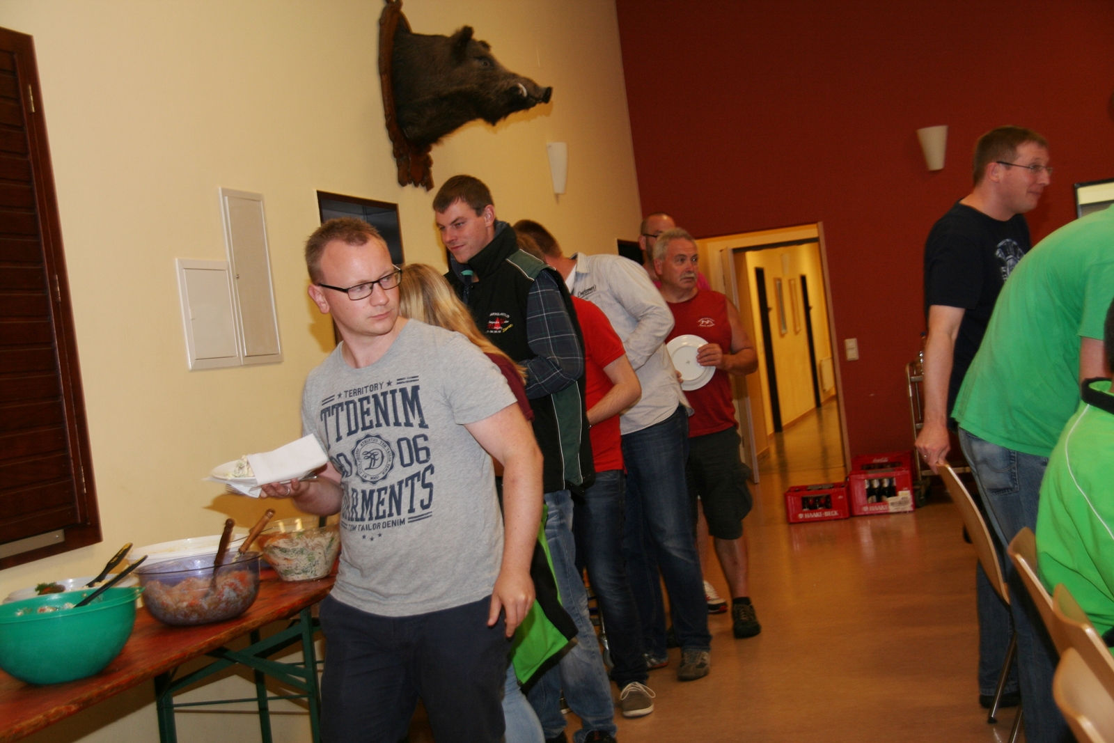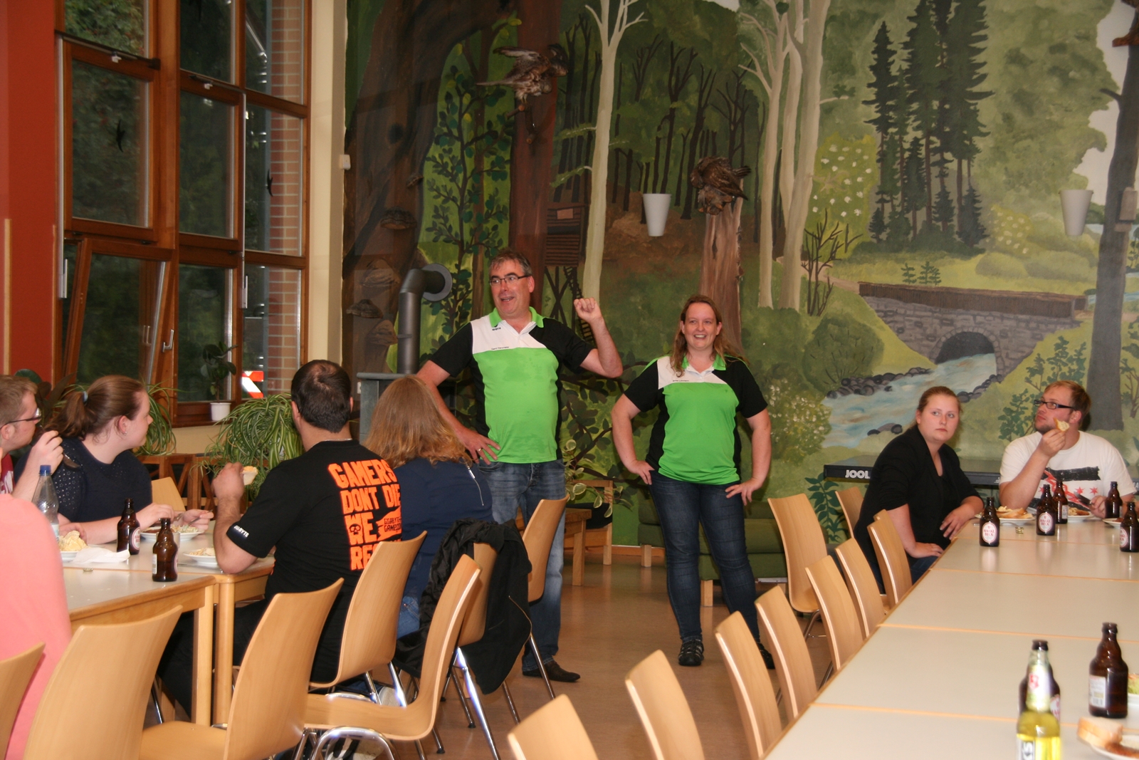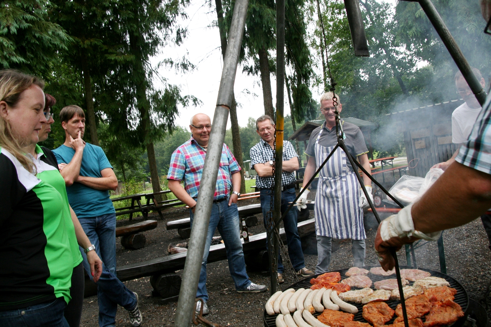 Am Abend übernahm das Präsidium des Bezirks-Schützenverbandes Diepholz, an der Spitze Präsident Karl-Friedrich Schardelmann, das Grillen. Leider fing es "pünktlich" zur Grillzeit an zu regnen, aber man war ja flexibel, gespeist wurde drinnen, im Trockenen. Britta Löhmann und Gerd Harzmeier begrüßten dann alle noch ein mal recht herzlich und wünschten Guten Appetit. Nach der „Verköstigung“ aller Teilnehmer, unternahmen alle am späten Abend eine Nachtwanderung mit dem Revierförster, der sehr ausführlich über das Leben im Wald informierte.