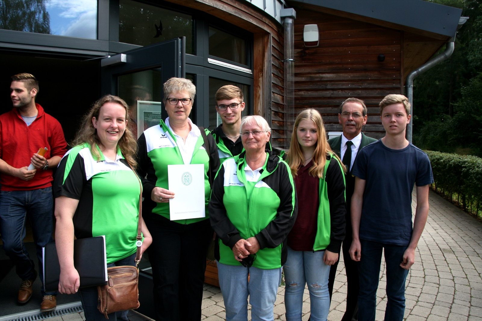- Bezirksjugendsportleiterin Britta Löhmann freut sich mit Jan-Vitus Sprick, Marianne Vallan, Vanessa Rothe, Dieter Lüdeke und Jan Segelhorst über die Ehrung mit der "Willi-Nadel" der NWDSB-Jugend für Karin Husmann -