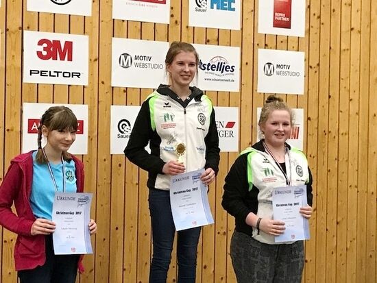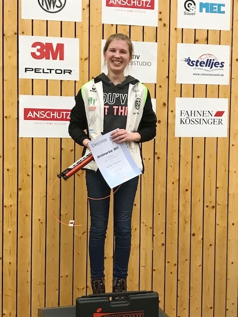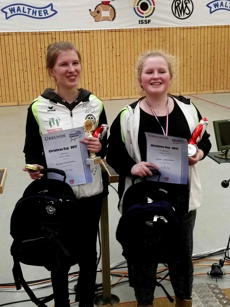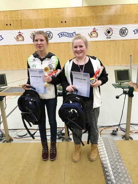 Denn Aimee Hochstein vom SV Haendorf hatte einen besonders guten Tag, sie gewann den Christmas Cup Luftpistole und erhielt eine Urkunde mit Pokal und vom Sponsor Paradini eine neue Luftpistole für ihre überragendes Ergebnis von 185 Ring, und hat sich von den Sachpreisen einen Rucksack ausgesucht! Lena Löhmann vom SV Mallinghausen erhielt für ihren dritten Rang mit dem Ergebnis von 174 Ring eine Medaille und von den Sachpreisen einen Rucksack und LG-Munition! Glückwunsch den beiden Platzierten!