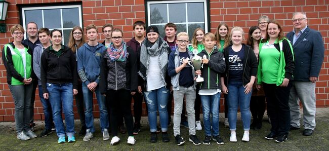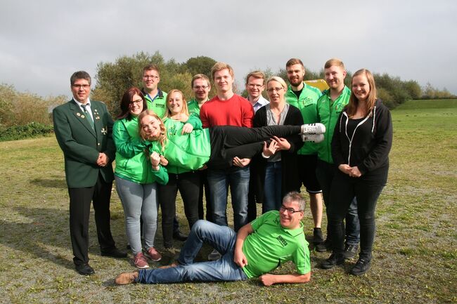 (von links) Jugendleiter Torsten Meinking, stellv. Jugendsprecherin Sonka Reents, Pressewart Malte Gehlken, Amt für besondere Aufgaben Franziska Lukasch u. Tim Jean Daßler, stellv. Jugendsprecher Fabian Martens, stellv. Pressewart Henrik Quast, Sachbearbeiterin Jugend Sarah Sperlich, Jugendsprecher Yannik Schlag, Referent für Jugendpflege Kevin Vallo, Amt für besondere Aufgaben Vanessa Plogmann, quer liegend "getragen" Jugendsprecherin Kira Simon, unten liegend stellv. Jugendleiter Gerd Harzmeier