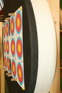 Zwei Scheiben hatten die Dörrieloher Bogenschützen mitgebracht, das Besondere an diesen Scheiben ist, dass sie aus mehreren Schichten Styropor in unterschiedlicher Festigkeit sind, nicht aus Stroh. Sie sind sehr leicht zu transportieren und gegen Feuchtigkeit resistent, dabei kann der Mittelpunkt, der ja bekanntlich zuerst zerschossen ist, ausgewechselt werden.
