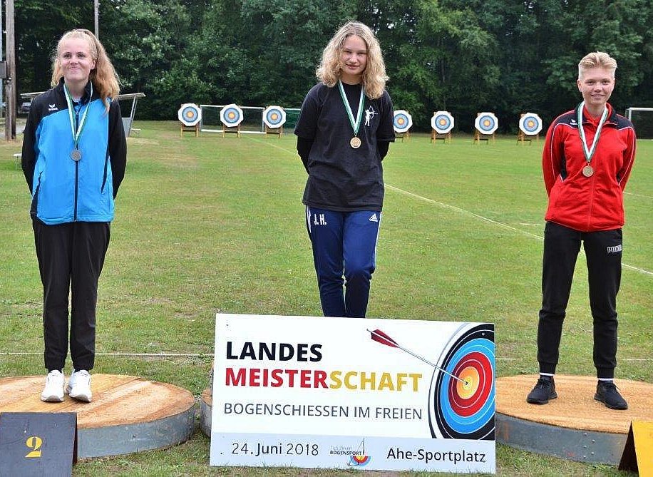 Auf den Siegertreppchen: Lüder Mohrmann-SV Bassum 1848; Eike Richter-BS Diepholz; Jens Meier BSG Osterholz-Scharmbeck.- Jessica Emker-SV Dörrieloh; Jule Marie Hoesmann-BSC Lingen; Annika Schärf-SV Petersfehn.(von links)