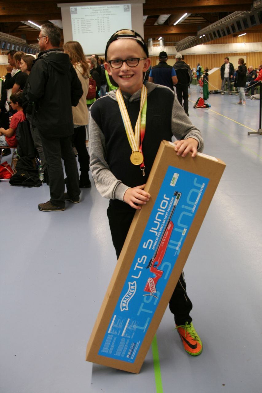 Ein freudestrahlender Louis Löhmann mit seinen Gewinnen: der GOLDMEDAILLE und einem Lichtpunktgewehr.