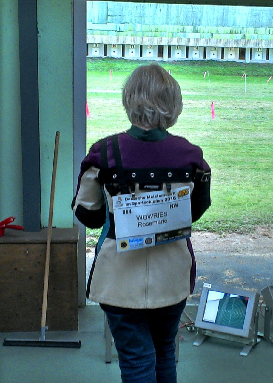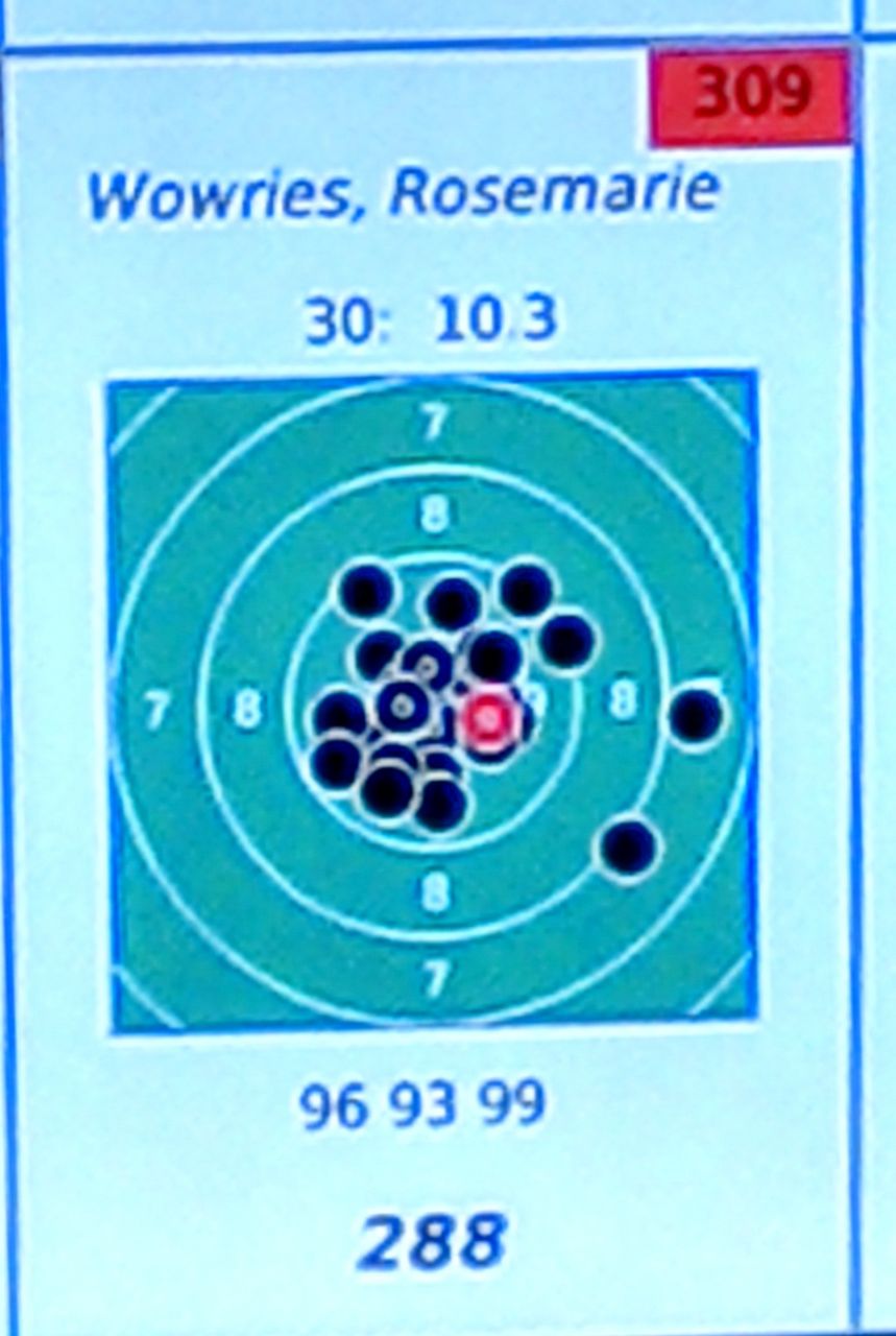 Rosemarie Wowries nahm mit ihren 288 Ringen den hervorragenden 36 Platz von 105 Teilnehmerinnen ein. Man sieht in der Ergebnisliste, dass alles recht dicht beieinander liegt, bei den Herren ebenso wie bei den Damen. In der Klasse Seniorinnen A wurden die ersten drei Plätze mit 298, 295 und 295 vergeben.