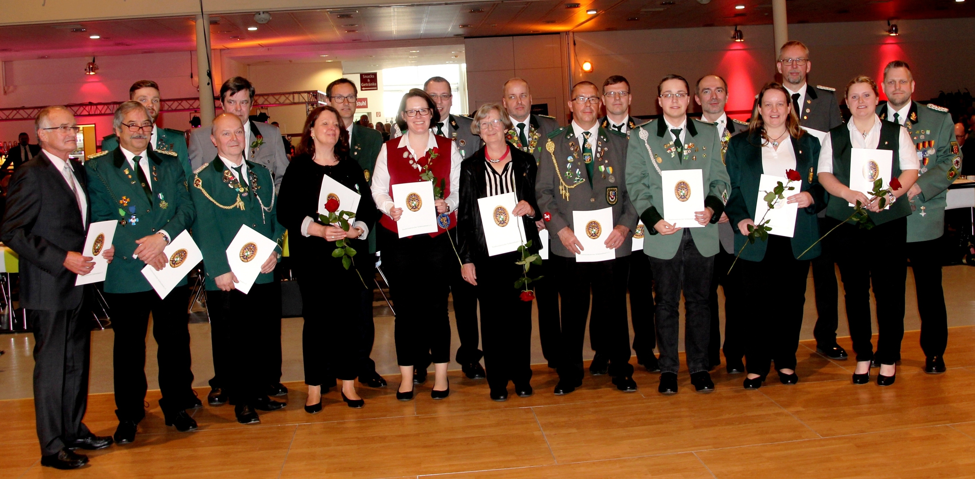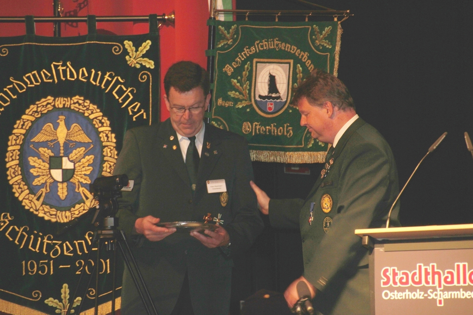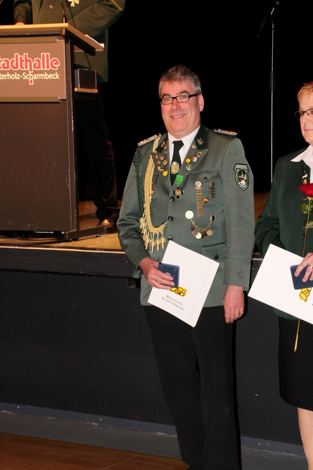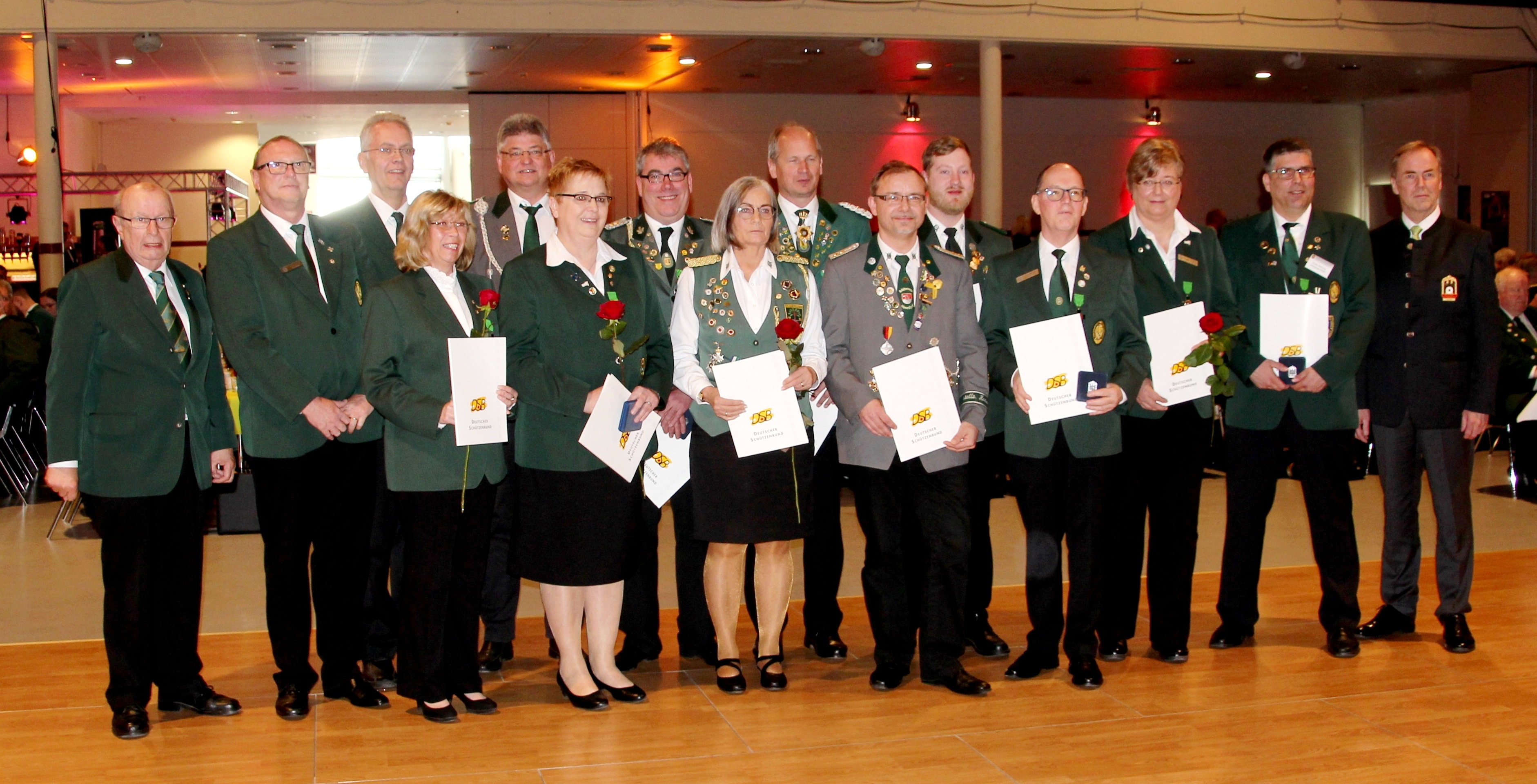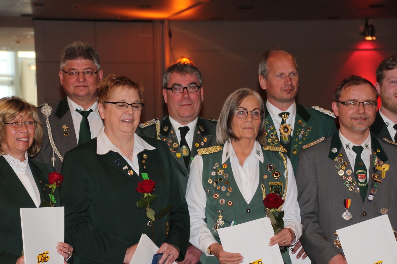 Für ihr ehrenamtliches Engagement erhielt Britta Löhmann-SV Mallinghausen von Jonny Otten die Silberne Verdienstnadel des NWDSB, auch sie erhielt als Geschenk eine Rose von Damenleiterin Elisabeth Eckhardt. NWDSB-Präsident Jonny Otten überreichte Siegfried Brockmann-SV Wohlstreck und Thomas Nowak-SV Rehden das Ehrenkreuz in Silber des NWDSB für ihr ehrenamtliches Engagement. Dieses wird allen in besonderer Erinnerung bleiben, denn die morgendlichen Ehrungen, waren von ihm die letzten Amtshandlungen als Präsident des Nordwestdeutschen Schützenbundes (NWDSB). Gerd Harzmeier-SV Kirchdorf wurde vom Präsidenten des Deutschen Schützenbundes Hans-Heinrich von Schönfels mit dem Ehrenkreuz in Bronze des DSB geehrt. Alle Geehrten wurden anschließend von den Delegierten des Bezirks Diepholz, unter ihnen auch Bezirkspräsident Karl-Friedrich Scharrelmann, mit Glückwünschen überhäuft.