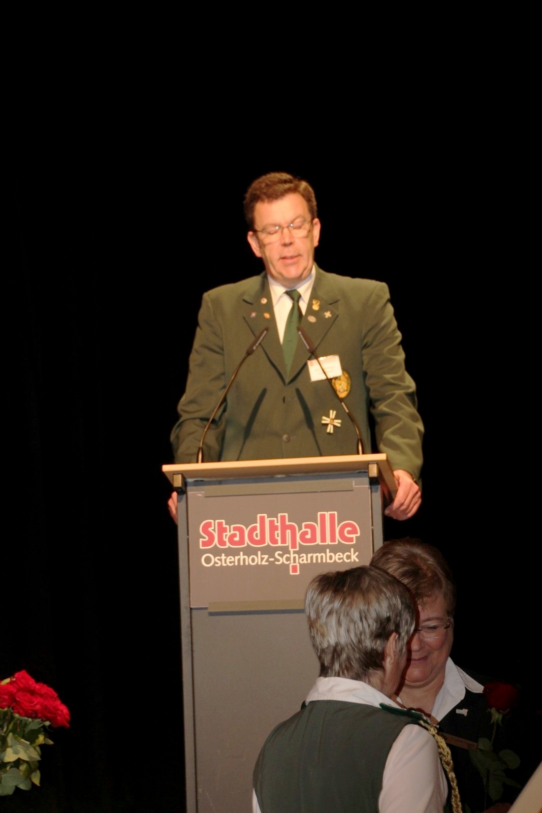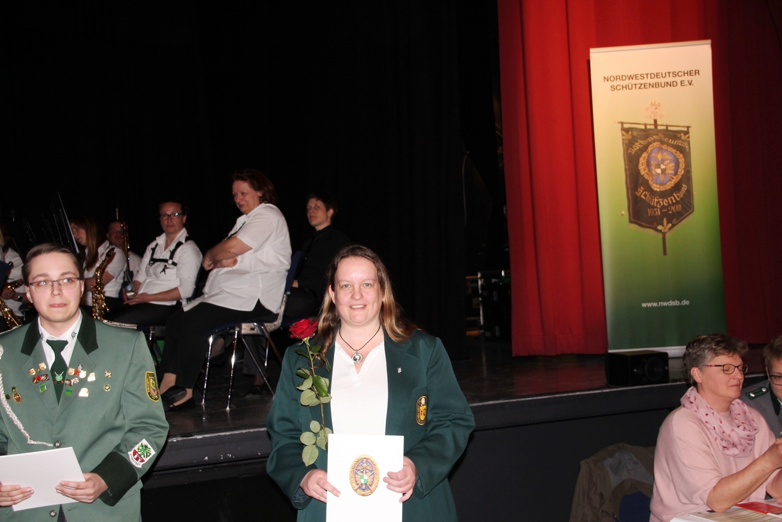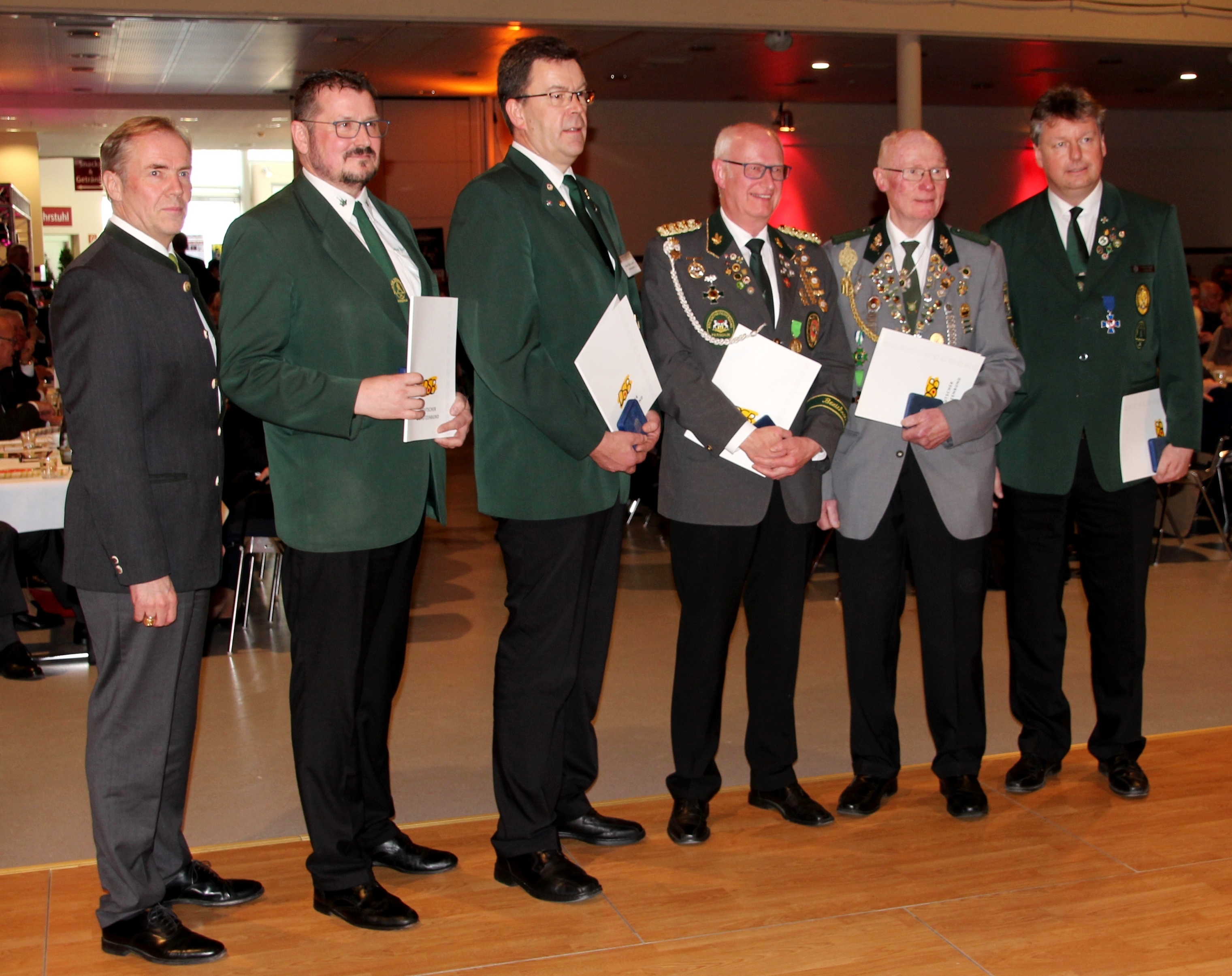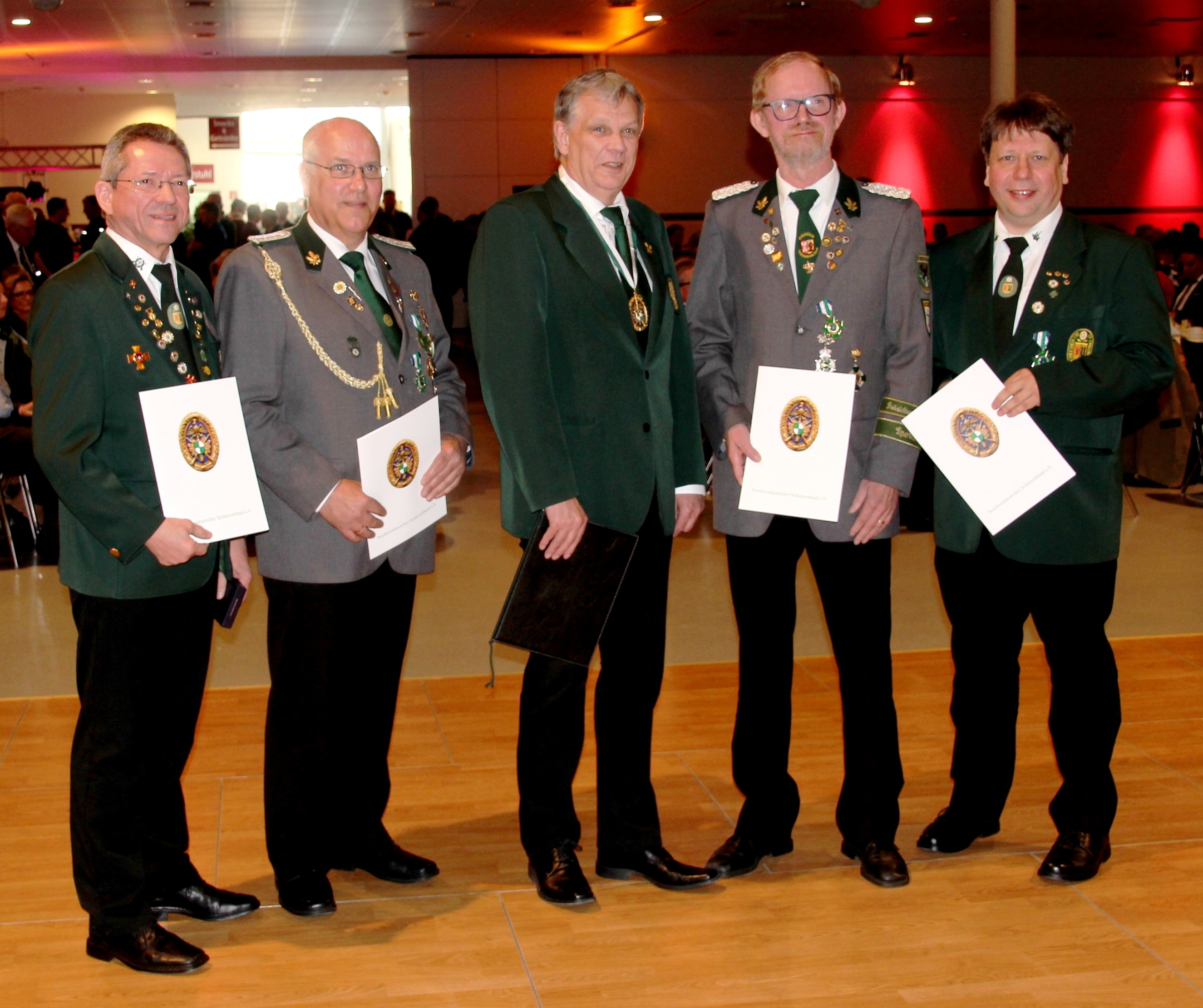 Für ihr ehrenamtliches Engagement erhielt Britta Löhmann-SV Mallinghausen von Jonny Otten die Silberne Verdienstnadel des NWDSB, auch sie erhielt als Geschenk eine Rose von Damenleiterin Elisabeth Eckhardt. NWDSB-Präsident Jonny Otten überreichte Siegfried Brockmann-SV Wohlstreck und Thomas Nowak-SV Rehden das Ehrenkreuz in Silber des NWDSB für ihr ehrenamtliches Engagement. Dieses wird allen in besonderer Erinnerung bleiben, denn die morgendlichen Ehrungen, waren von ihm die letzten Amtshandlungen als Präsident des Nordwestdeutschen Schützenbundes (NWDSB). Gerd Harzmeier-SV Kirchdorf wurde vom Präsidenten des Deutschen Schützenbundes Hans-Heinrich von Schönfels mit dem Ehrenkreuz in Bronze des DSB geehrt. Alle Geehrten wurden anschließend von den Delegierten des Bezirks Diepholz, unter ihnen auch Bezirkspräsident Karl-Friedrich Scharrelmann, mit Glückwünschen überhäuft.