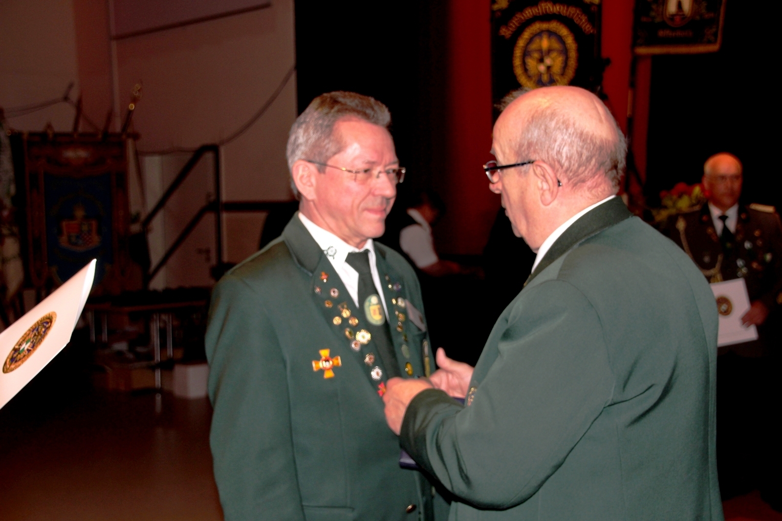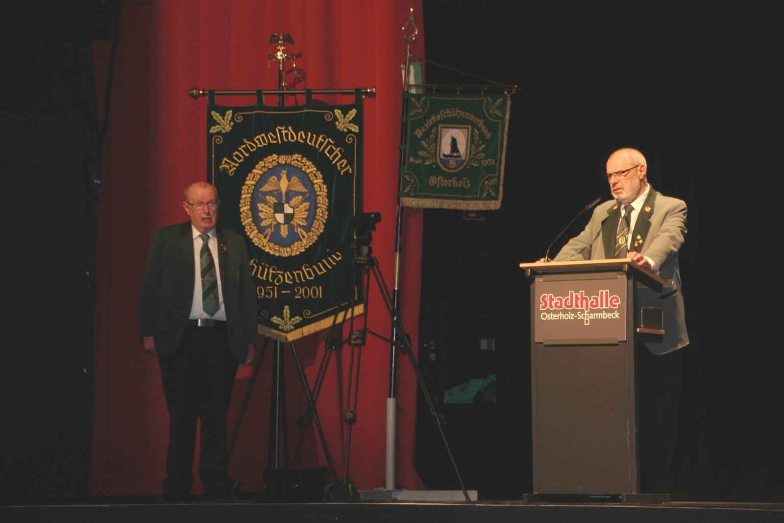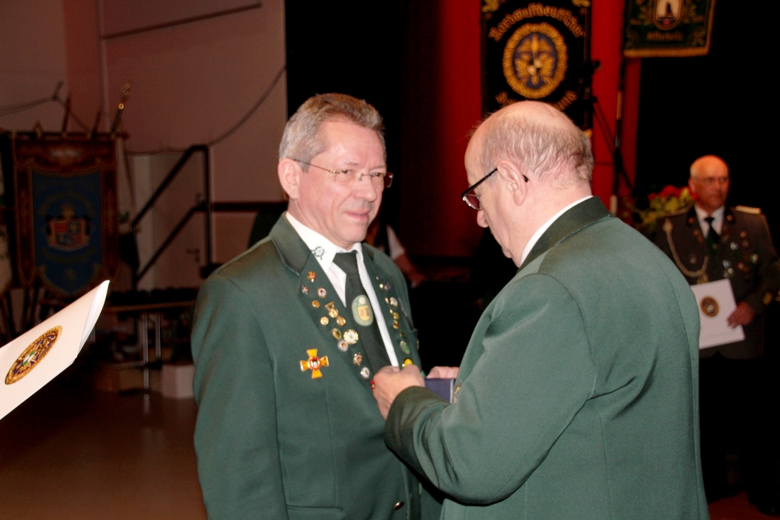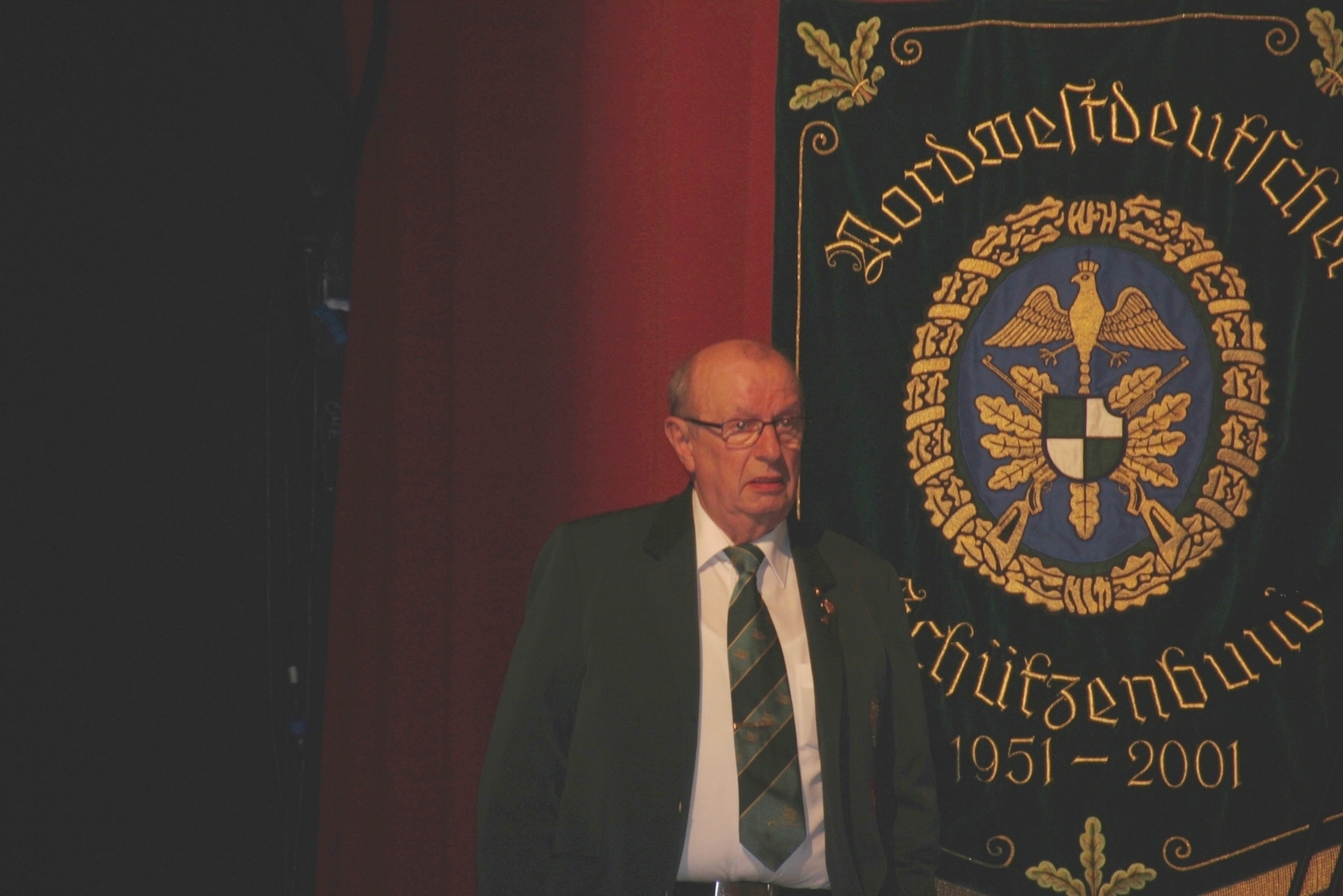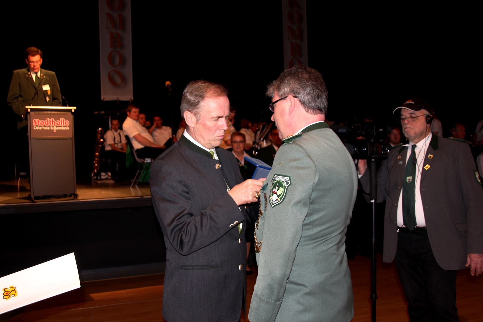 Für ihr ehrenamtliches Engagement erhielt Britta Löhmann-SV Mallinghausen von Jonny Otten die Silberne Verdienstnadel des NWDSB, auch sie erhielt als Geschenk eine Rose von Damenleiterin Elisabeth Eckhardt. NWDSB-Präsident Jonny Otten überreichte Siegfried Brockmann-SV Wohlstreck und Thomas Nowak-SV Rehden das Ehrenkreuz in Silber des NWDSB für ihr ehrenamtliches Engagement. Dieses wird allen in besonderer Erinnerung bleiben, denn die morgendlichen Ehrungen, waren von ihm die letzten Amtshandlungen als Präsident des Nordwestdeutschen Schützenbundes (NWDSB). Gerd Harzmeier-SV Kirchdorf wurde vom Präsidenten des Deutschen Schützenbundes Hans-Heinrich von Schönfels mit dem Ehrenkreuz in Bronze des DSB geehrt. Alle Geehrten wurden anschließend von den Delegierten des Bezirks Diepholz, unter ihnen auch Bezirkspräsident Karl-Friedrich Scharrelmann, mit Glückwünschen überhäuft.
