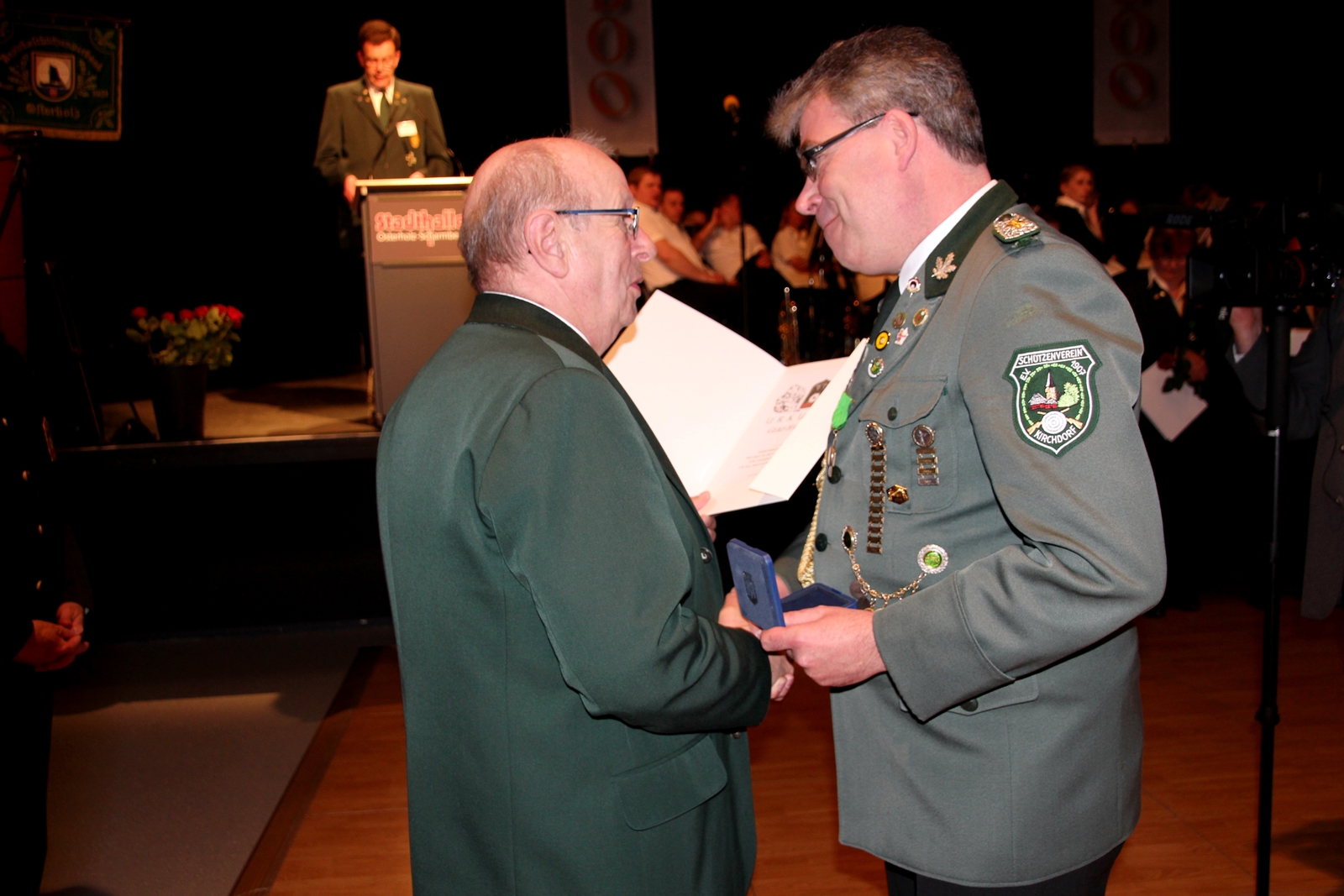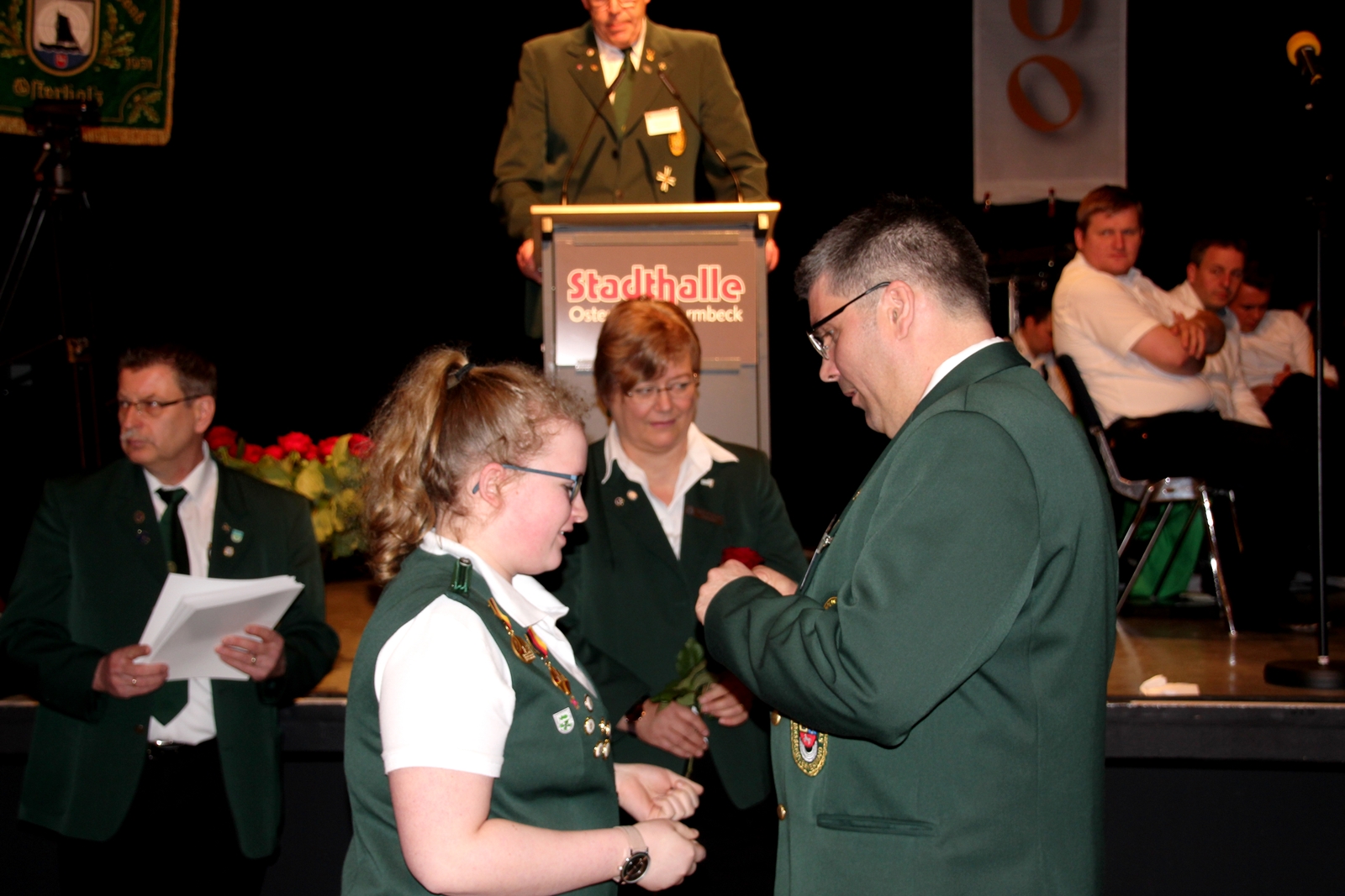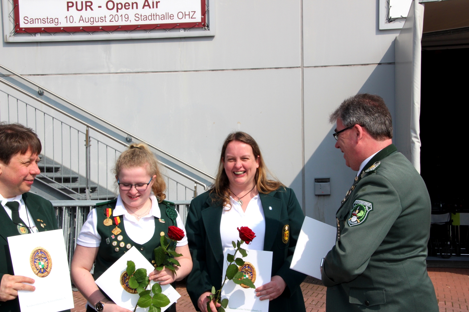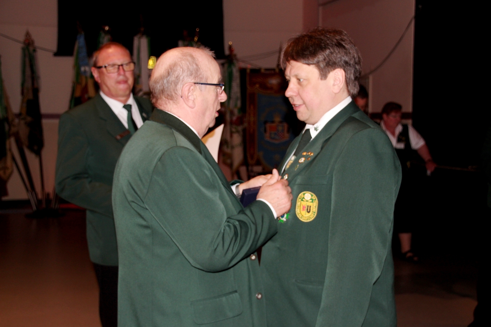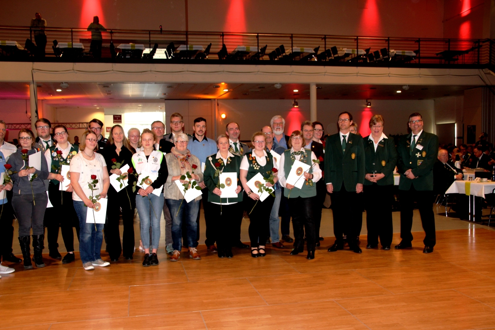 Für ihr ehrenamtliches Engagement erhielt Britta Löhmann-SV Mallinghausen von Jonny Otten die Silberne Verdienstnadel des NWDSB, auch sie erhielt als Geschenk eine Rose von Damenleiterin Elisabeth Eckhardt. NWDSB-Präsident Jonny Otten überreichte Siegfried Brockmann-SV Wohlstreck und Thomas Nowak-SV Rehden das Ehrenkreuz in Silber des NWDSB für ihr ehrenamtliches Engagement. Dieses wird allen in besonderer Erinnerung bleiben, denn die morgendlichen Ehrungen, waren von ihm die letzten Amtshandlungen als Präsident des Nordwestdeutschen Schützenbundes (NWDSB). Gerd Harzmeier-SV Kirchdorf wurde vom Präsidenten des Deutschen Schützenbundes Hans-Heinrich von Schönfels mit dem Ehrenkreuz in Bronze des DSB geehrt. Alle Geehrten wurden anschließend von den Delegierten des Bezirks Diepholz, unter ihnen auch Bezirkspräsident Karl-Friedrich Scharrelmann, mit Glückwünschen überhäuft.
