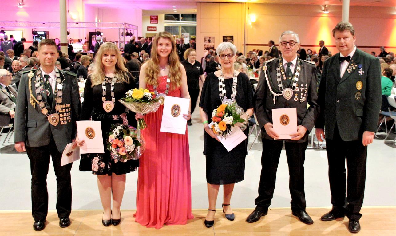 NWDSB-Königshaus 2019 (v. l.): Andreas Schlüschen, Ann-Katrin Ochtrop, Natalie Holst, Gertrud Just, Henry Cordes mit neuem NWDSB-Präsidenten Frank Pingel.