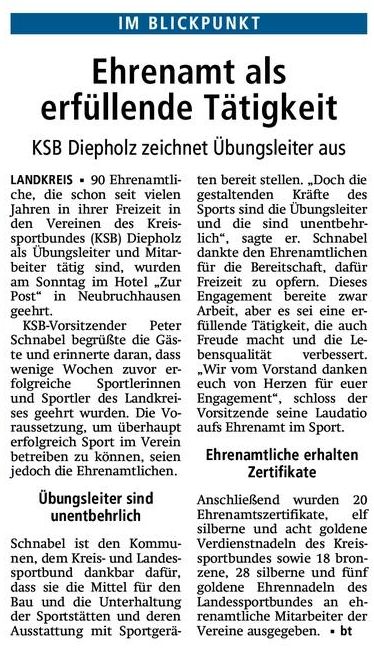 Der Kreissportbund Diepholz zeichnete am 25. Mai in Neubruchhausen Übungsleiter und Mitarbeiter für ihre ehrenamtliche Tätigkeit aus.
