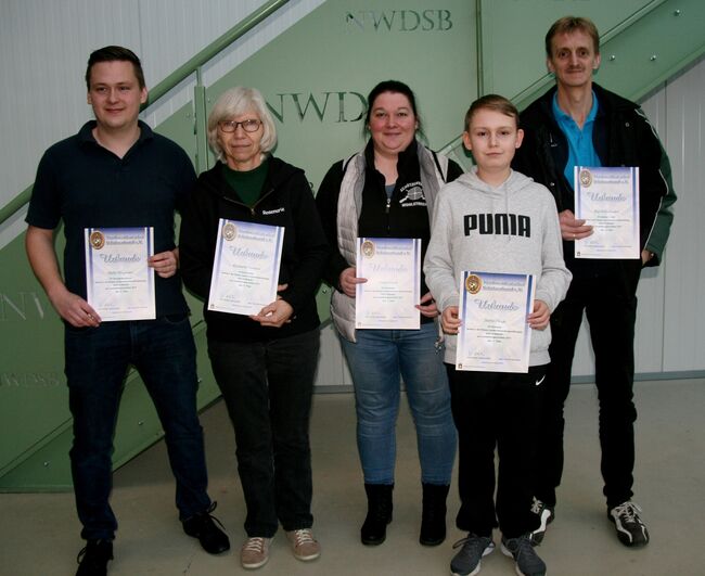Für ihre Teilnahme erhielt jeder eine Teilnehmer-Urkunde als Erinnerung. von links: Malte Wiegmann - SV Strange-Buchhorst, Rosemarie Wowries - SV Blockwinkel, Svenja Brandt - SV Wohlstreck, Justus Plenge - SV Kirchdorf u. Jörg Felstehausen vom SV Drebber von 1900.