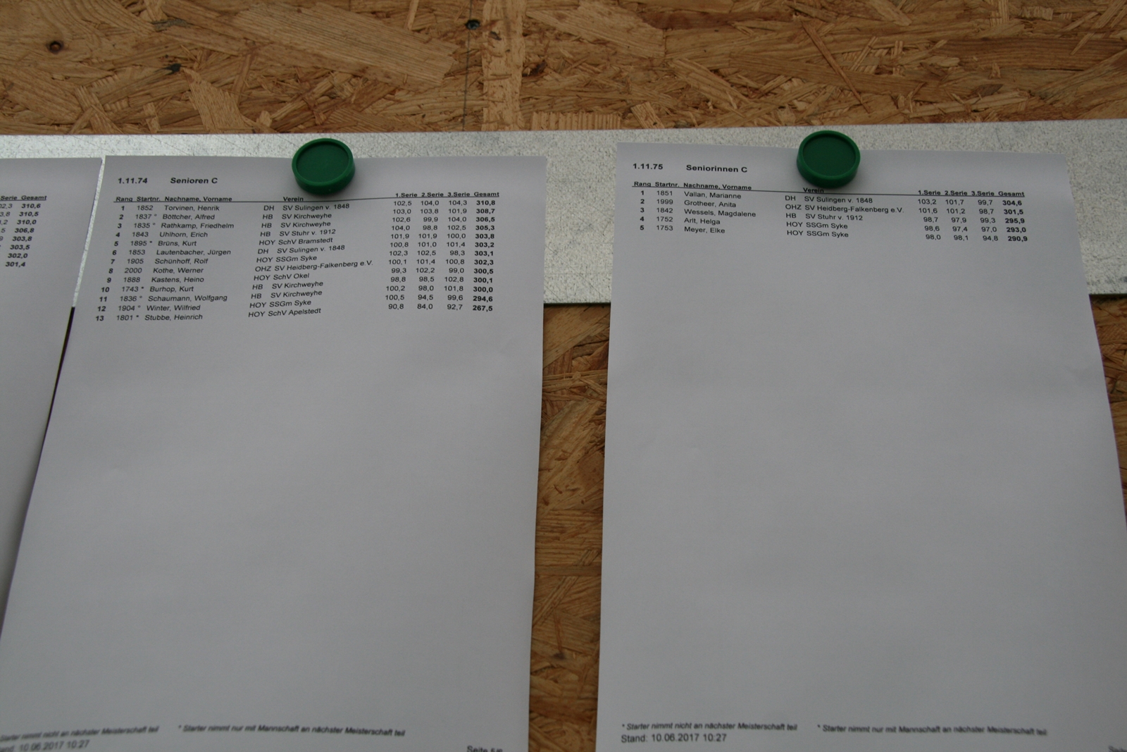 Bei den Senioren C platzierte sich mit 310,8 Ringen Henrik Torvinen vom SV von 1848 Sulingen auf dem 13. Rang. Die Seniorinnen C glänzte mit Inge Lübbers vom SV Drebber auf Platz 10 mit 305,8 Ringen von 28 Teilnehmerinnen, auf Rang 11 ließ sich Marianne Vallan vom SV von 1848 Sulingen mit 304,6 Ringen "nieder".