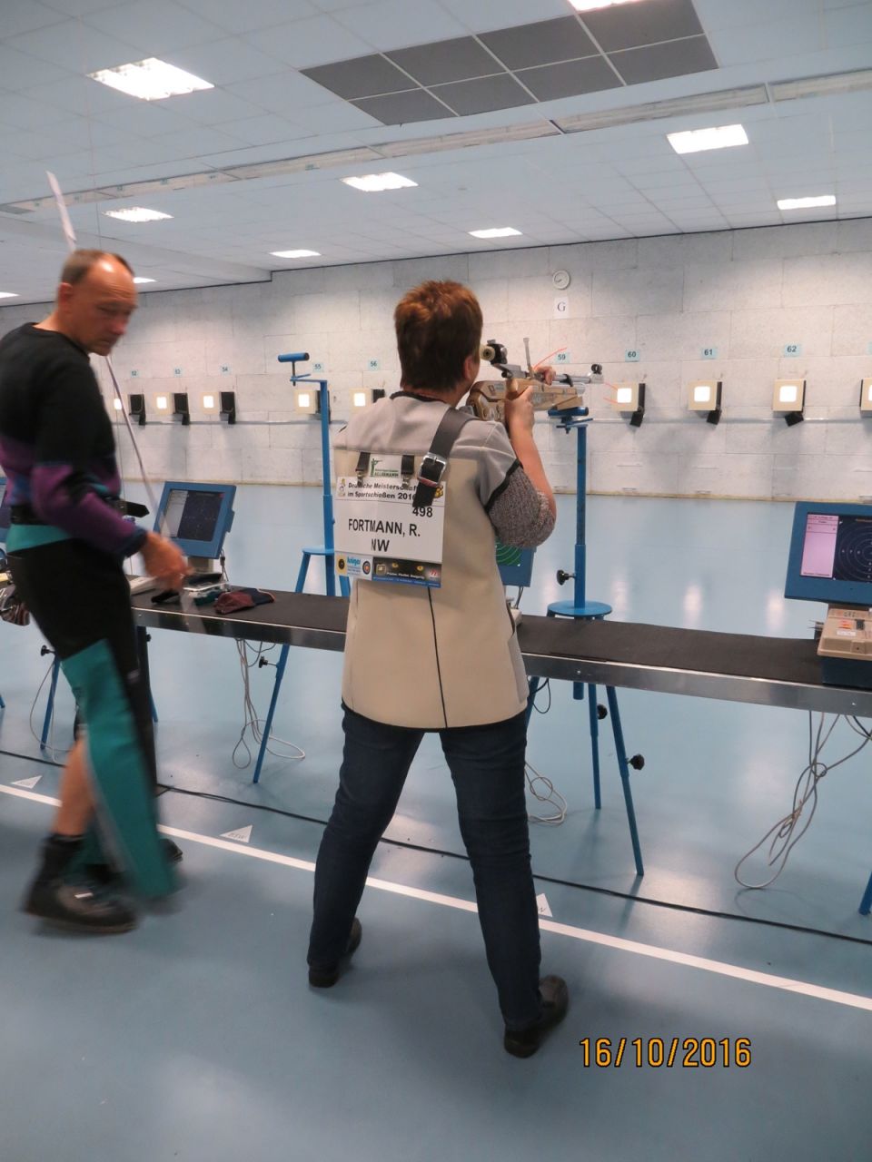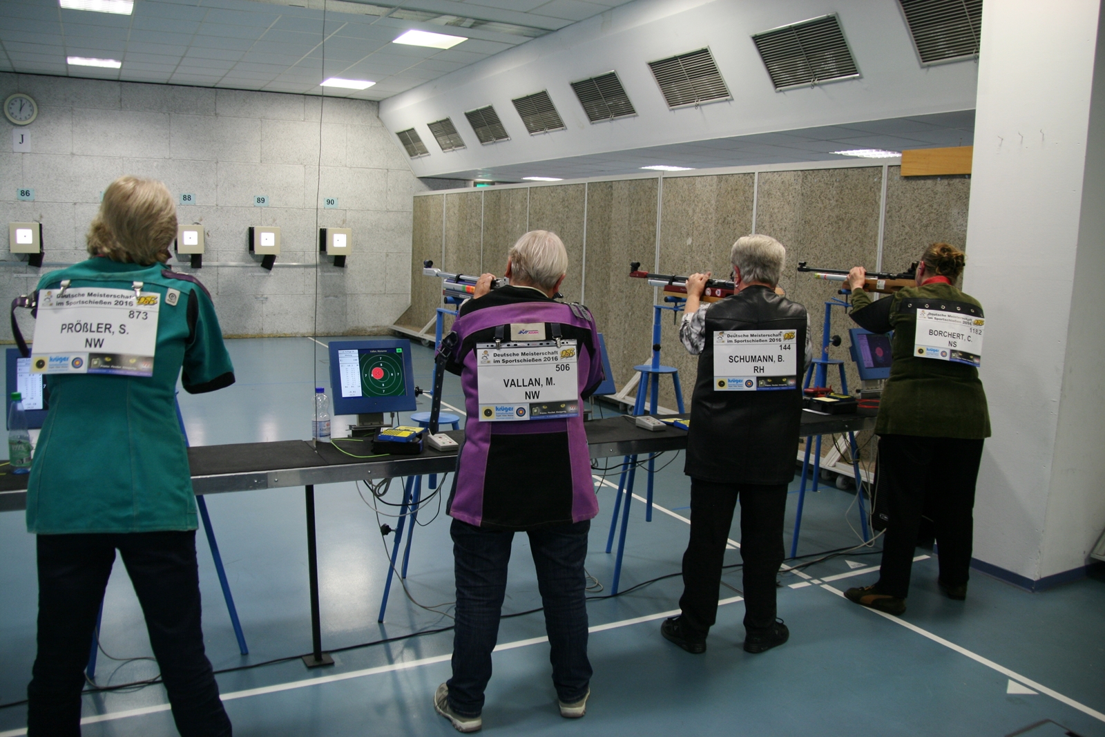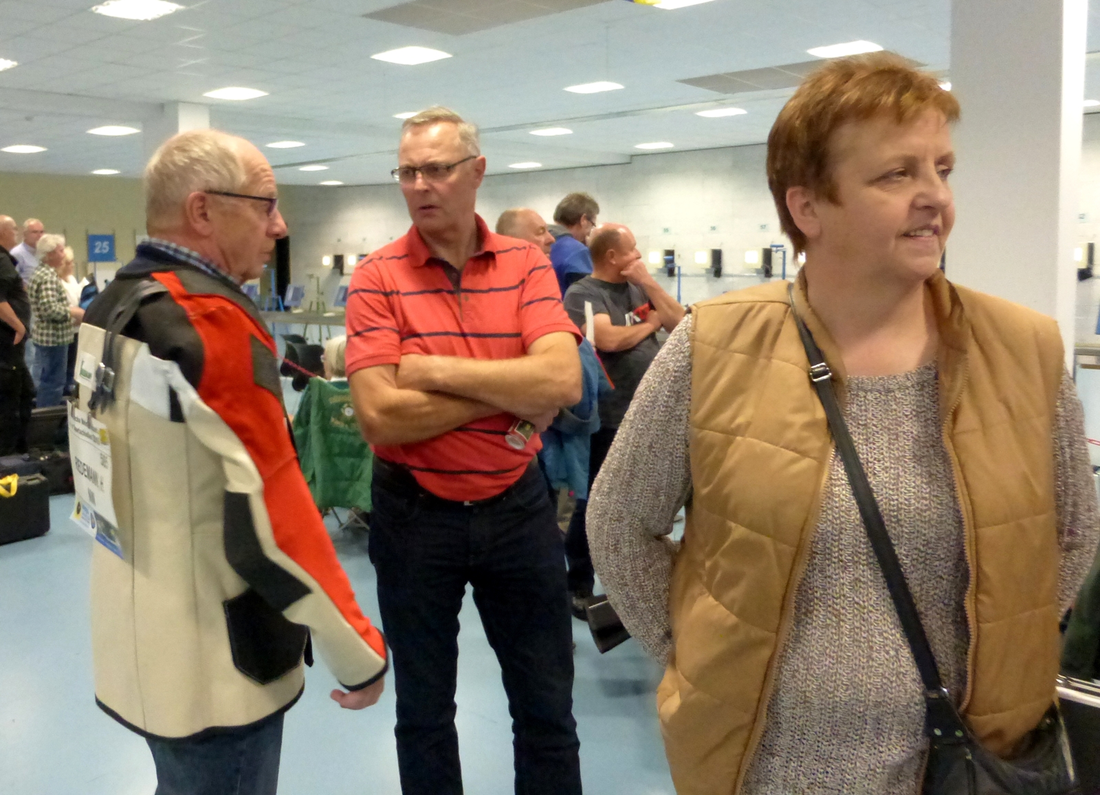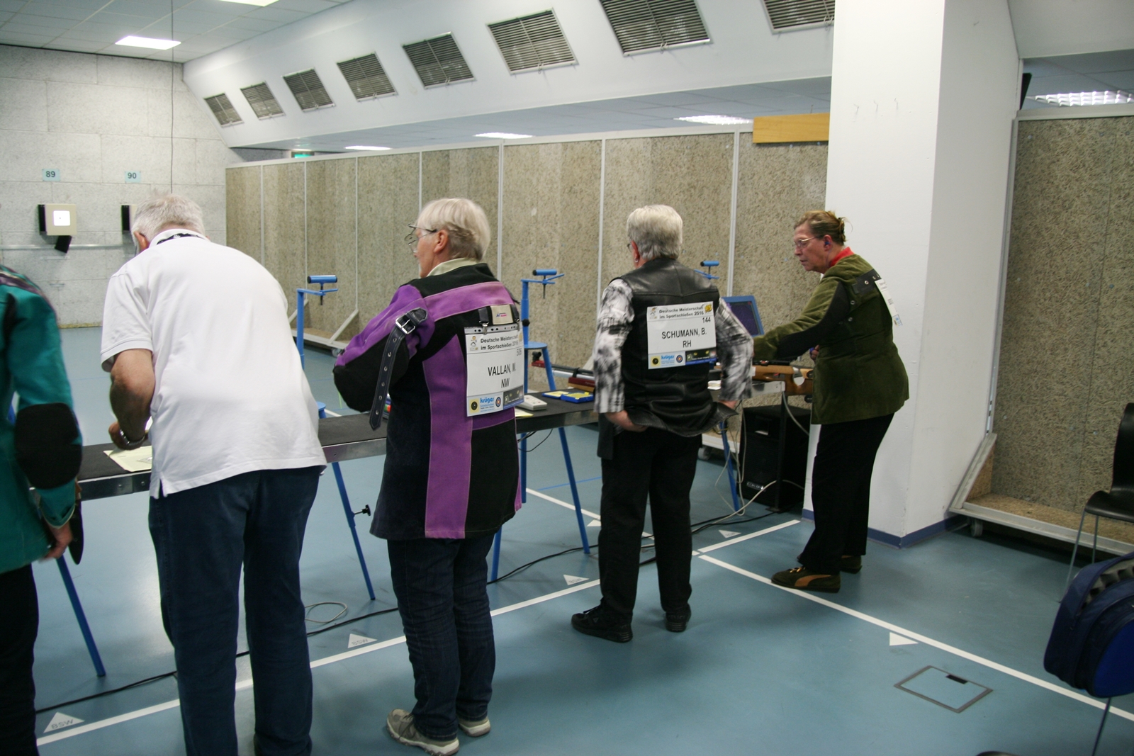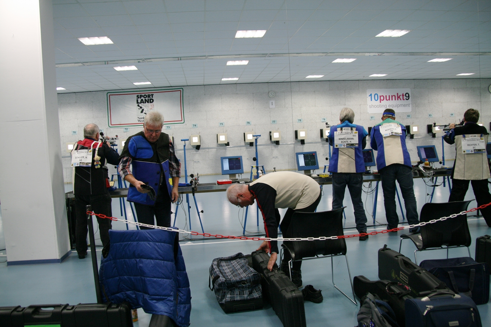 Inge Lübbers, Karl-Heinz Brandt, Hermann Winkelmann-Bünte und Marianne Vallan waren die ersten Starter am Samstagmittag, Gisela Pick und Gerlinde Ahlers hatten ihren Start um 16:10 Uhr. Inge Lübbers wurde von Uwe Bergmann betreut und sie nahm seine Ratschläge gern an. Mit den Serien 97, 100 und 98 kam sie auf hervorragende 295 Ringe und reihte sich unter 81 Teilnehmerinnen in der Seniorenklasse C auf Rang 34 ein. Glückwunsch Inge! Zur gleichen Zeit schossen Karl-Heinz Brandt und Hermann Winkelmann-Bünte in Seniorenklasse B. „Kalle“ Brandt war mit den ersten beiden 100ter Serien gut im Rennen, aber in der letzten Serie hatten sich plötzlich zwei Neunen „eingeschlichen“, natürlich war er darüber nicht erfreut. So kam er mit 298 Ring auf Platz 77 von 297 Teilnehmern. Hermann Winkelmann-Bünte hätte auch gern mehr als 293 Ringe gehabt, so nahm er am Ende Rang 242 ein. In der Mannschaftswertung hatten sie 886 Ringe, wurden damit 62. von 117 Mannschaften. Marianne Vallan kam mit den Serien 94, 95 und 97 auf 286 Ring, sie hatte sich eigentlich eine „9“ in der Mitte gewünscht, aber es gibt ja im nächsten Jahr wieder die Gelegenheit sich bei der Landesverbandsmeisterschaft für „Dortmund“ zu qualifizieren.