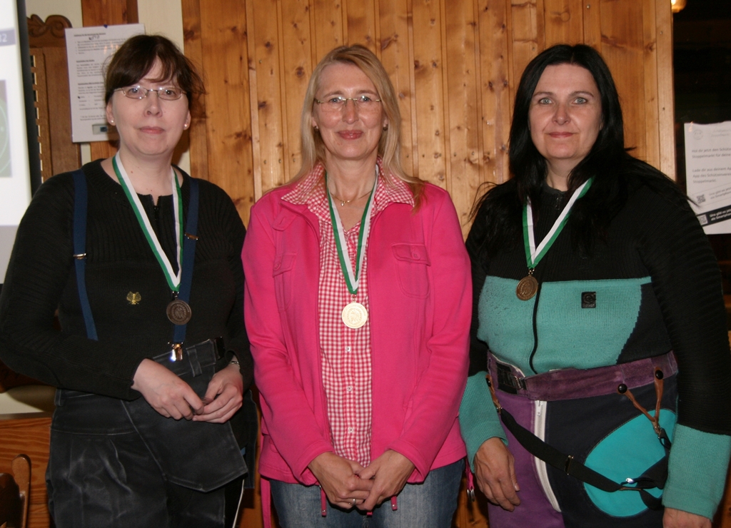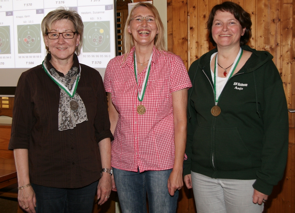 Zur Siegerehrung des Liegendwettkampfes, waren fast alle Alters-Damen geblieben, sie sparten nicht mit Beifall. Uwe Sussmann und Paul Menke überreichten den Siegerinnen ihre Einzel- und Mannschaftsmedaillen und gratulierten ihnen recht herzlich. In der Mannschaftswertung haben auch die Damen vom SV Echem mit Karin Knapp, Anja Linn u. Petra Putensen nichts "anbrennen" lassen, es folgten auf den Plätzen zwei u. drei die Mannschaften des SV Etzhorn. Auch beim Liegendprogramm war Karin Knapp nicht zu schlagen, Doris Landwehr vom SV Etzhorn, "drängelte" sich als Zweite vor Anja Linn, ebenfalls vom SV Echem.
