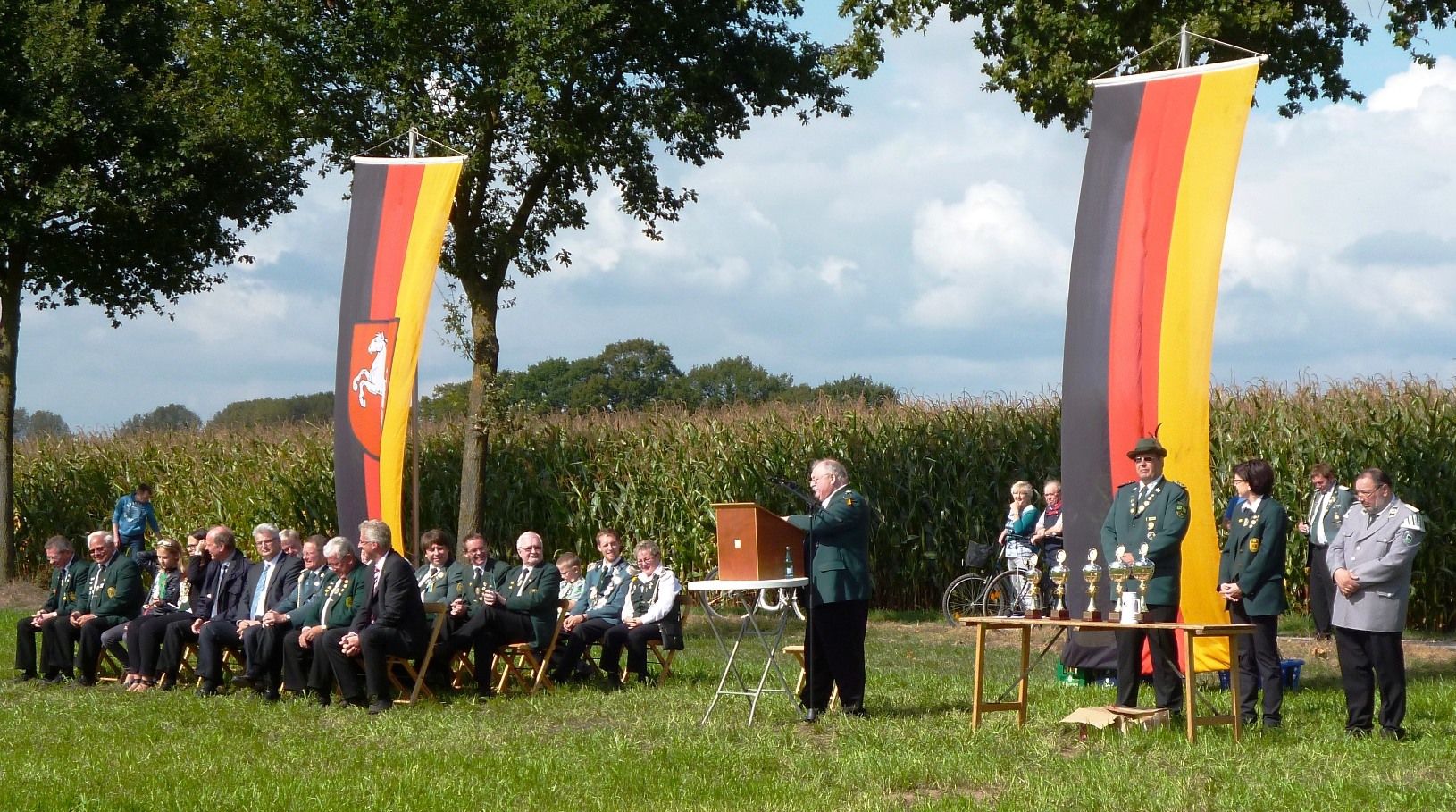 Karl-Friedrich Scharrelmann, Vorsitzender der Schießsportvereinigung Dümmer, begrüsste alle Schützinnen, Schützen und Ehrengäste recht herzlich. Die Pokale für die besten Majestäten strahlten in der Sonne...(Foto: M.Immoor)