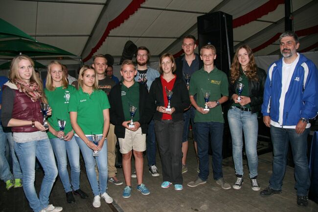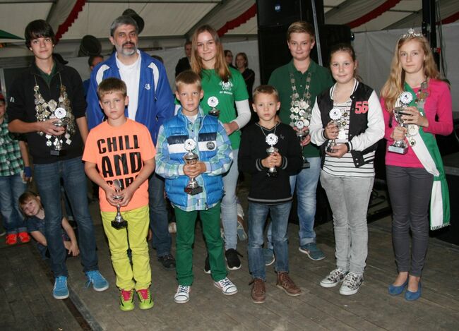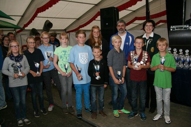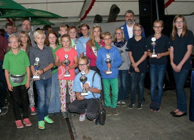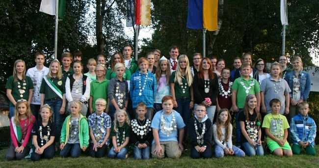 42 jugendliche Majestäten stellten sich vor der Siegerehrung zu einem Gruppenfoto auf, unter ihnen die KKT-Majestäten des vergangenen Jahres. Schülerkönigin Kira Simon vom SV Barenburg (ganz links) und KKT-Jugendkönigin Jana Wortmann vom SV Gaue (ganz rechts).