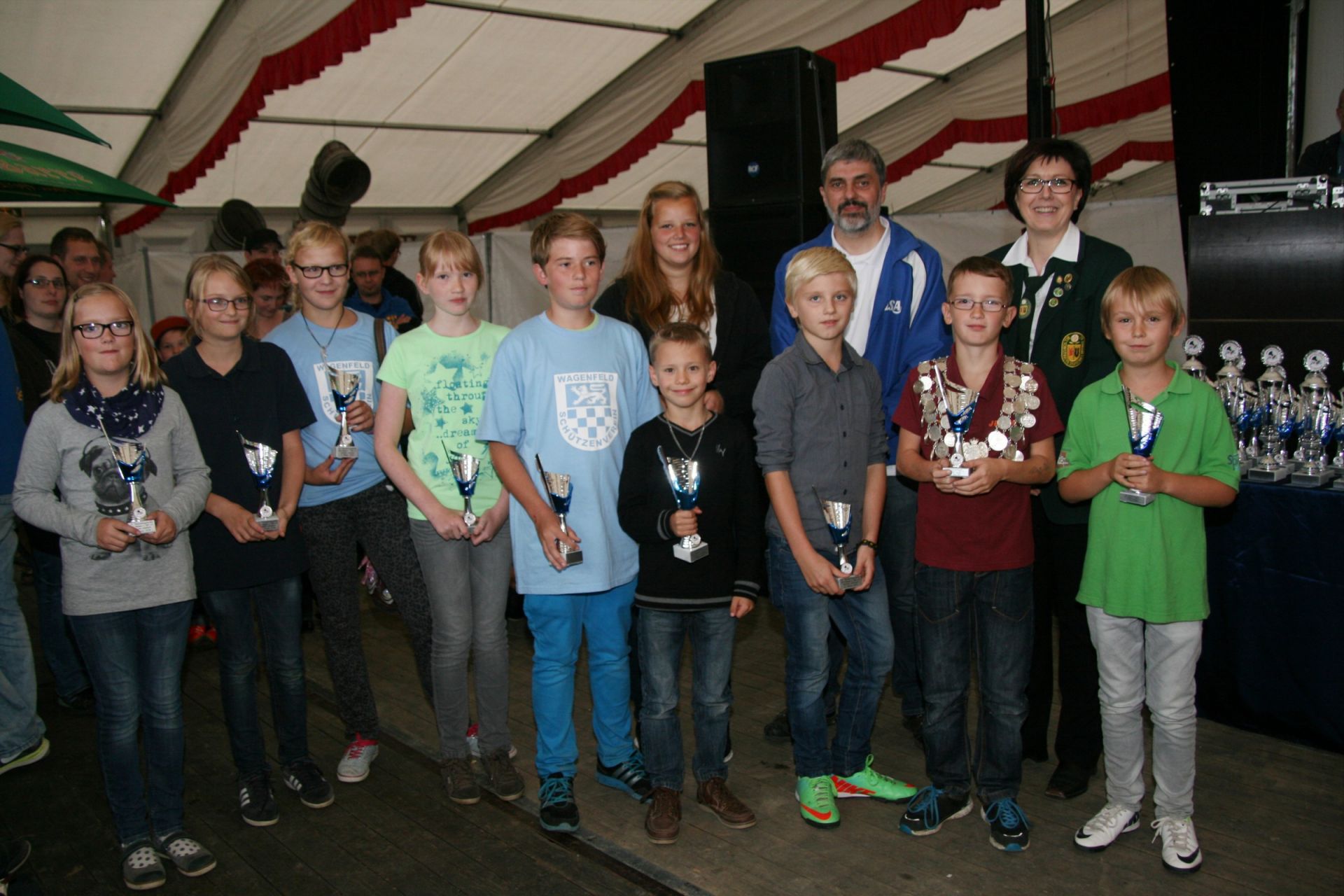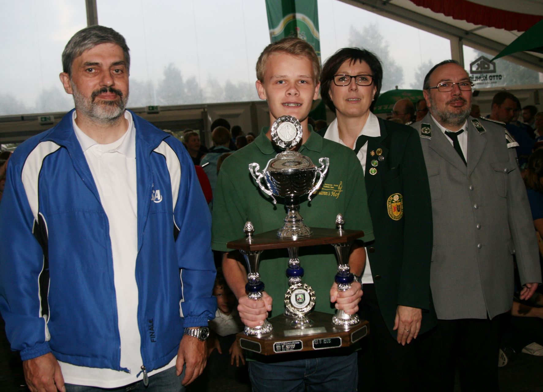 Den Jugend-Wanderpokal gewann der SV Kirchdorf mit 120 Ring und Teiler 182,3. Es hatten 11 Mannschaften 120 Ringe geschossen, so kam es auf die besten Teiler insgesamt an. Bjarne Lohmeier nahm ihn stolz für seine Mannschaft in Empfang. Eingerahmt ist er von den Verantwortlichen Uwe und Anja Luzniack und Klaus Eickhoff.(von links)