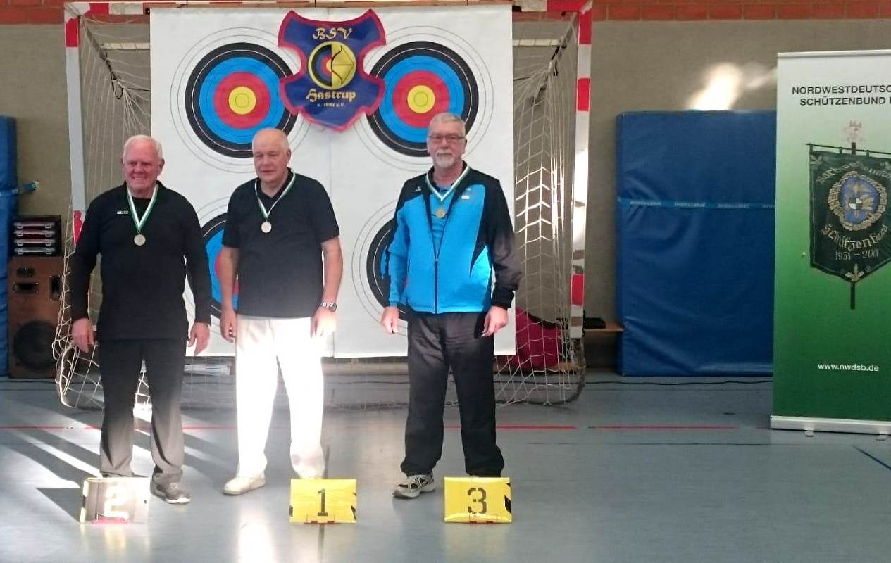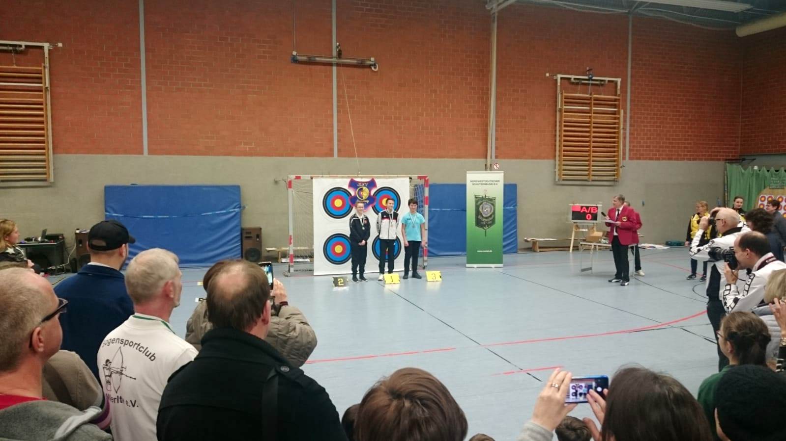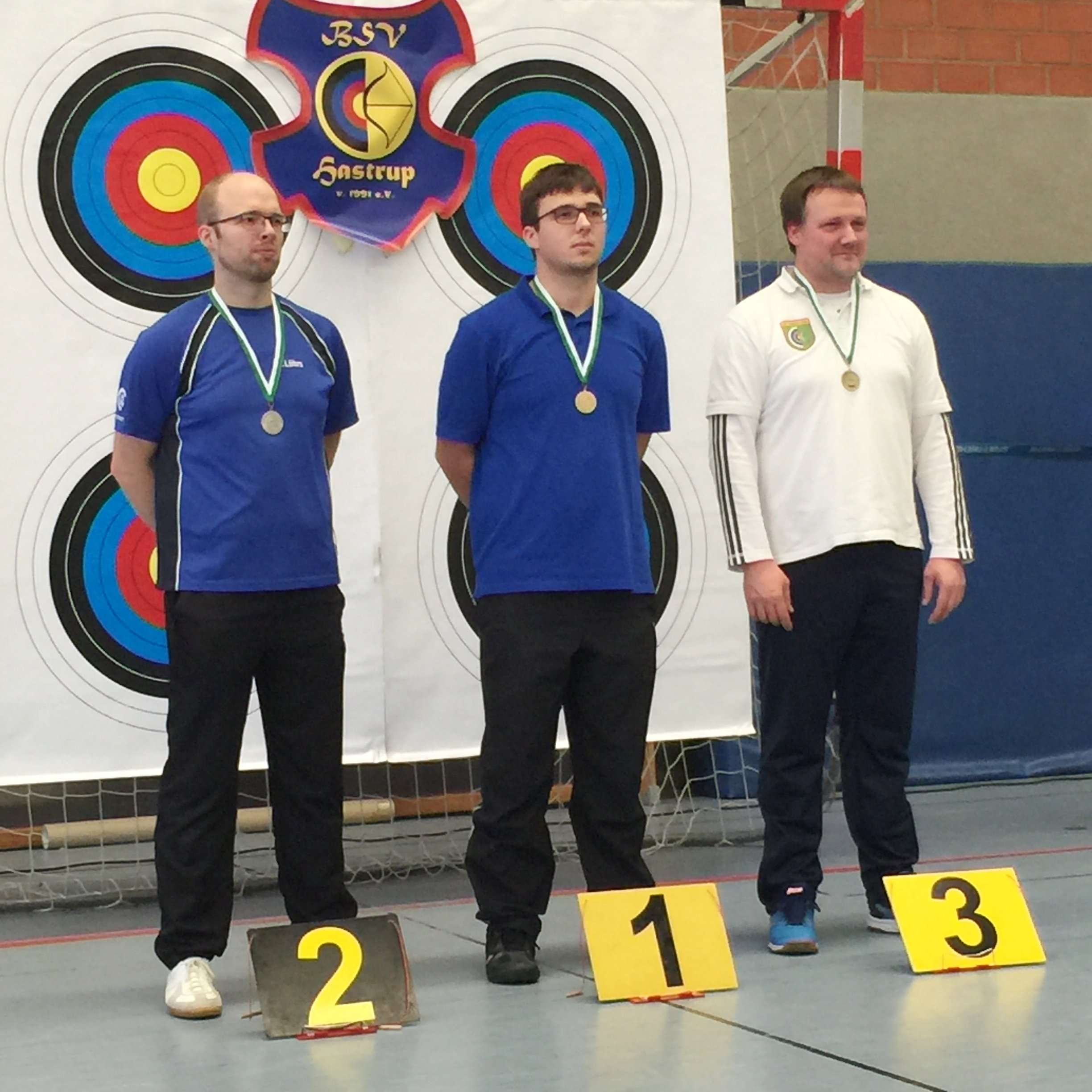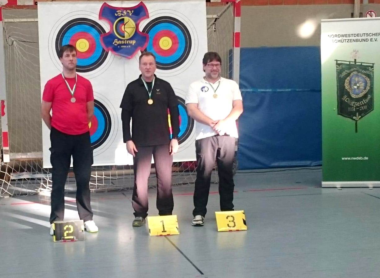 Es ist Eike Richter vom BS Diepholz am Sonntag gelungen sich in der Herrenklasse auch im Finale durchzusetzen: er wird eingerahmt von den Bogenschützen Martin Lührs-TuS Gildehaus u. Michael Frankenberg- vom BC Hagen a.T.W.