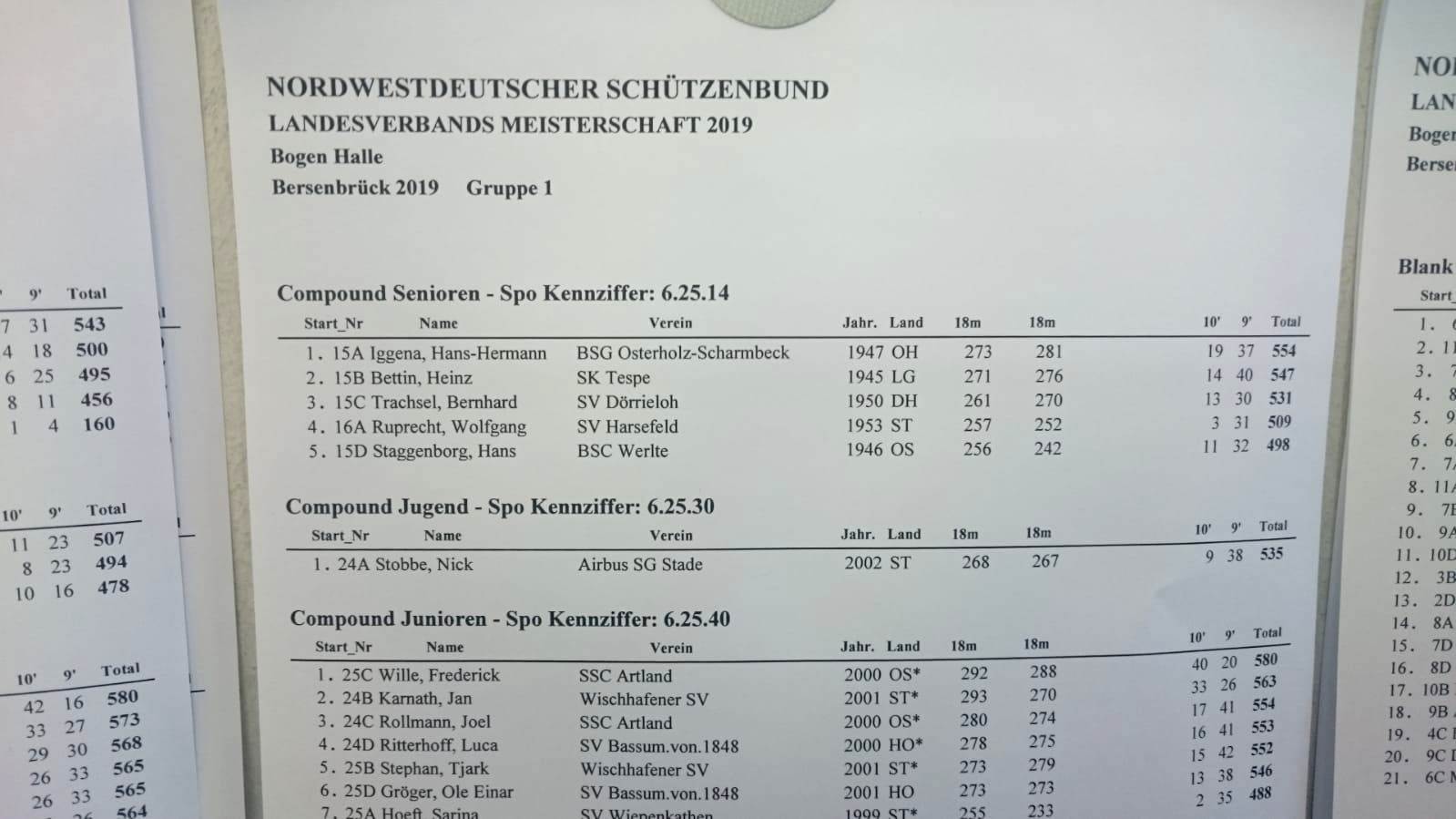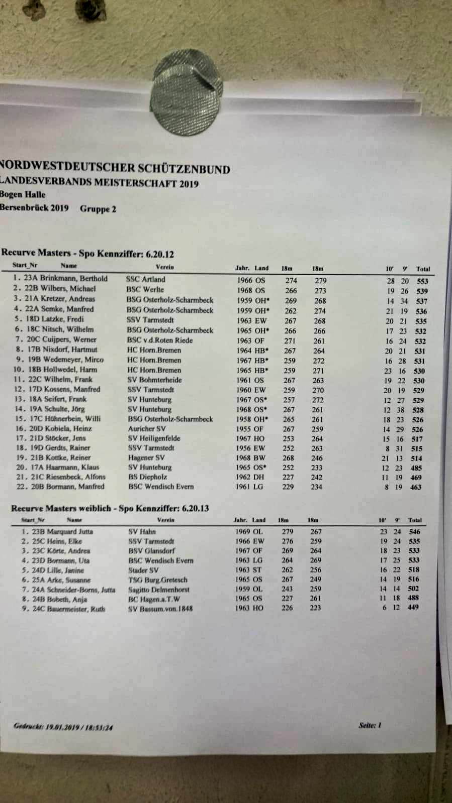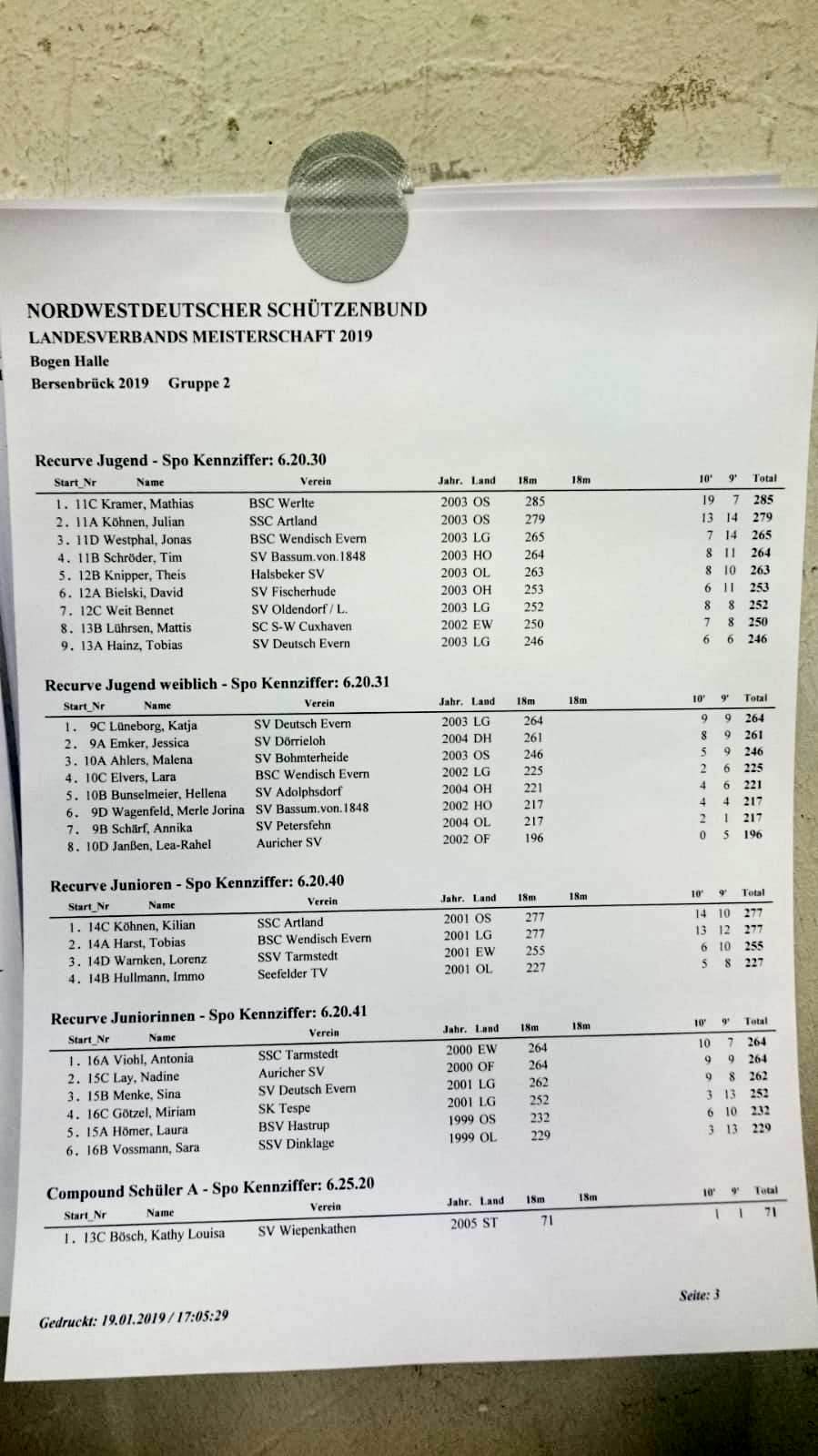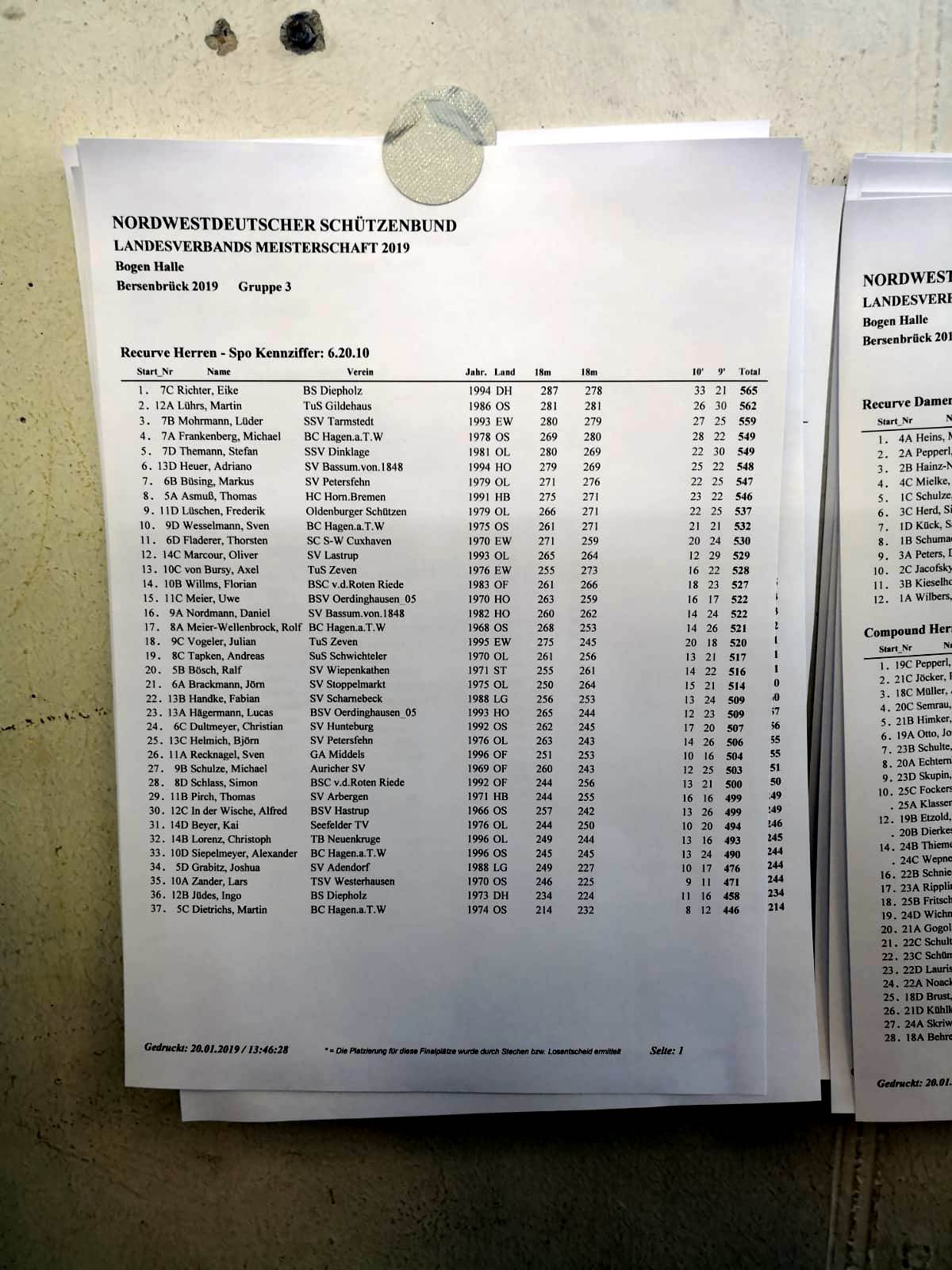 Unter den 280 teilnehmenden Bogenschützen aus dem Nordwestdeutschen Schützenbund (NWDSB), befanden sich auch Jessica Emker in der Jugendklasse mit Recurvebogen und Bernhard Trachsel als Senior mit dem Compoundbogen vom SV Dörrieloh. Vom Bogensport (BS) Diepholz Eike Richter, Ingo Jüdes in der Herrenklasse sowie Alfons Riesenbeck mit dem Recurvebogen in der Mastersklasse. Vom SV Schwaförden war in der Mastersklasse Andreas Schraubek mit dem Blankbogen dabei.