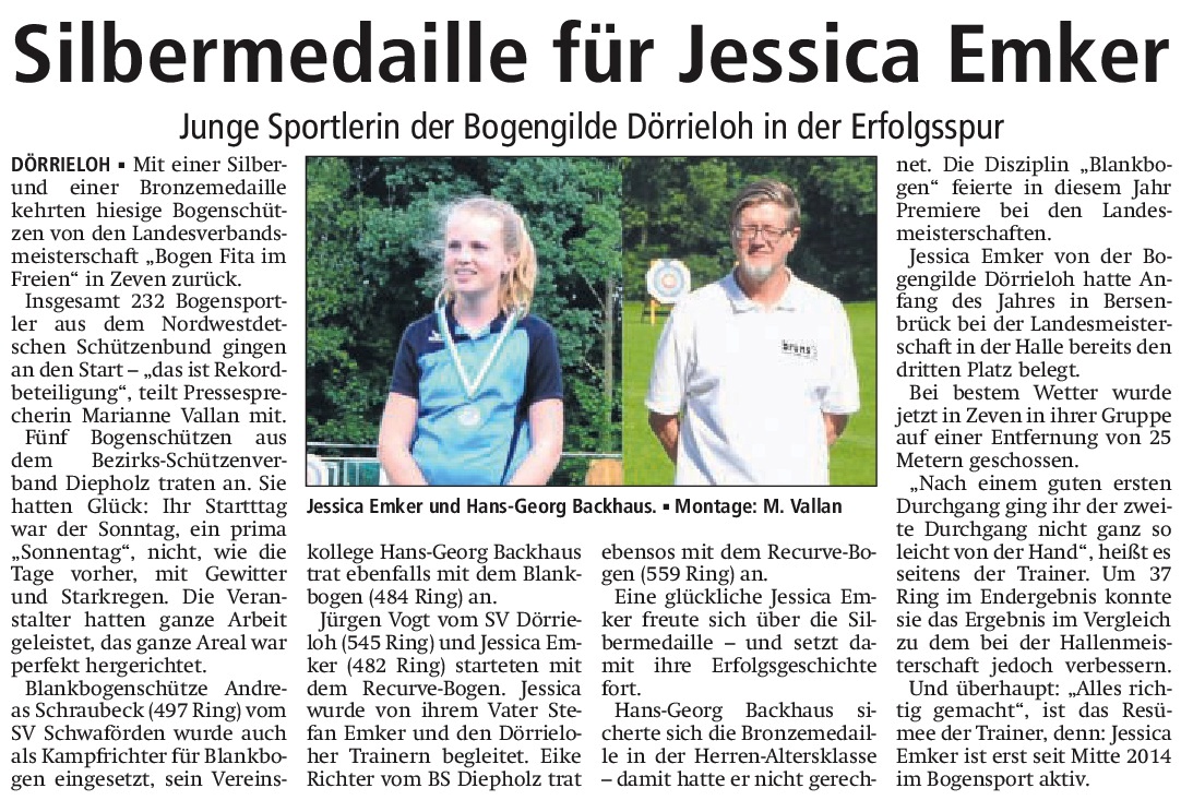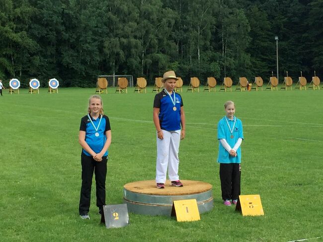 Nach der Siegerehrung: eine super glückliche Jessika Emker mit ihrer SILBERMEDAILLE. Hans-Georg Backhaus hat zudem noch eine BRONZEMEDAILLE mit dem Blankbogen in der Herren-Altersklasse errungen, ja auf dem Treppchen zu stehen war schon bemerkenswert, denn es war die Premiere Disziplin Blankbogen, die bisher nicht auf Landesmeisterschaften in der WA-Runde vertreten war.